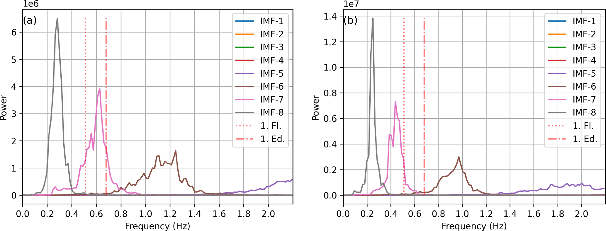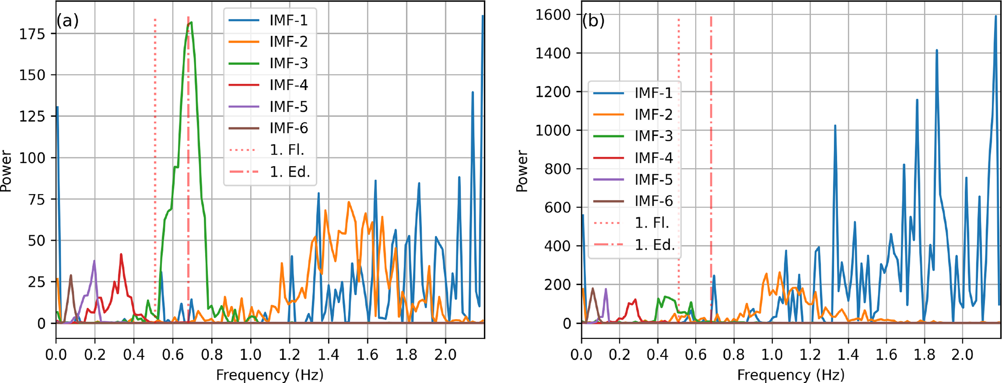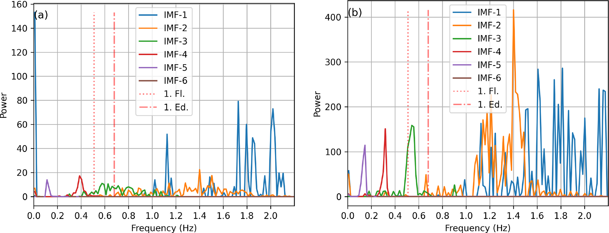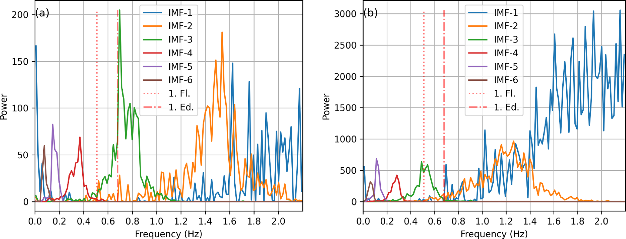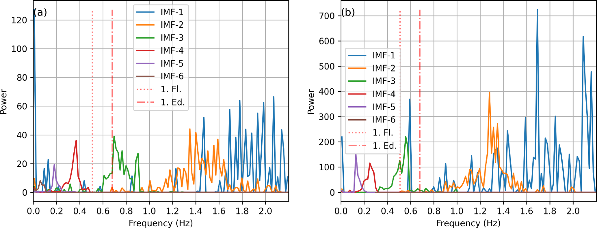 Figure 23Power spectrum of the inherent frequencies of each IMF of the flow velocity component v at for (a) case FLEX37 and (b) case FLEX60 from 0 to 20 s. The vertical lines indicate the first two eigenfrequencies of the blade, i.e., first flapwise frequency (1. Fl. – dotted line) and first edgewise frequency (1. Ed. – dashed-dotted line).