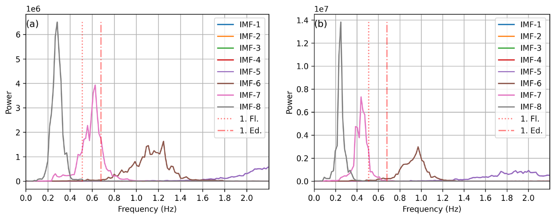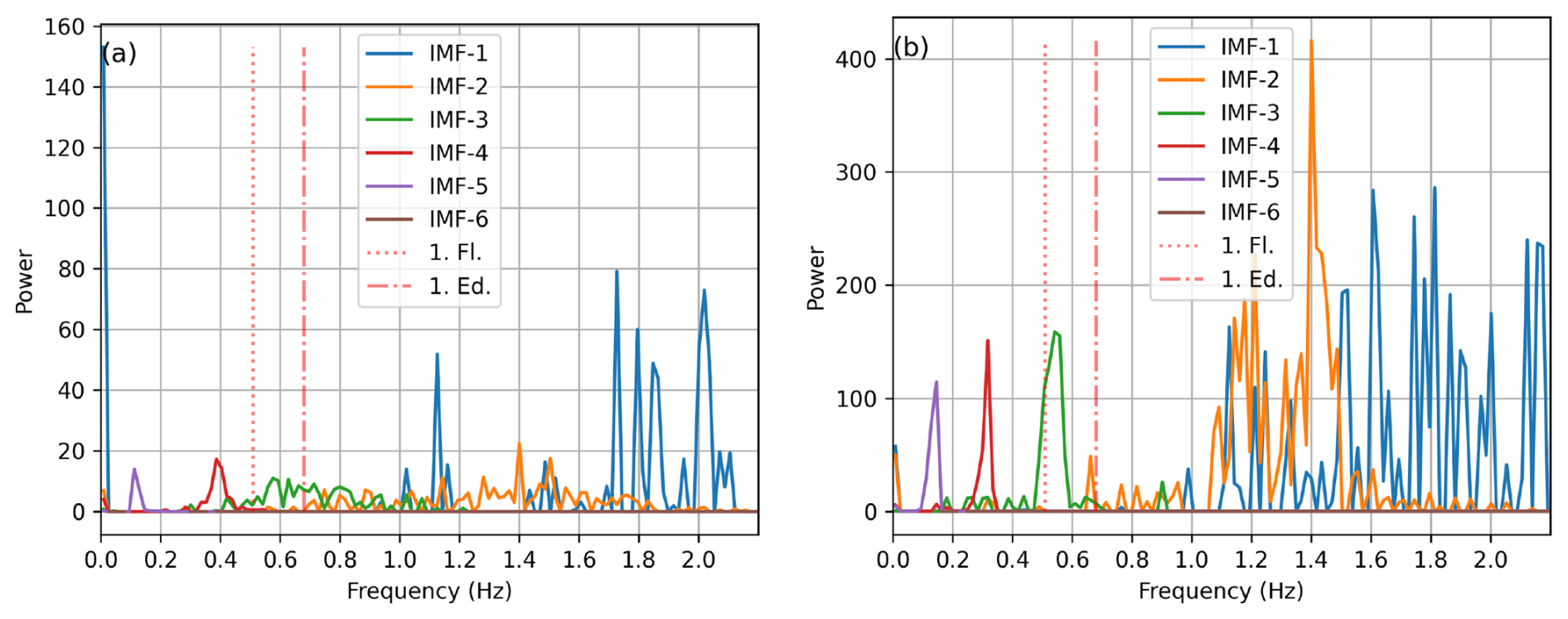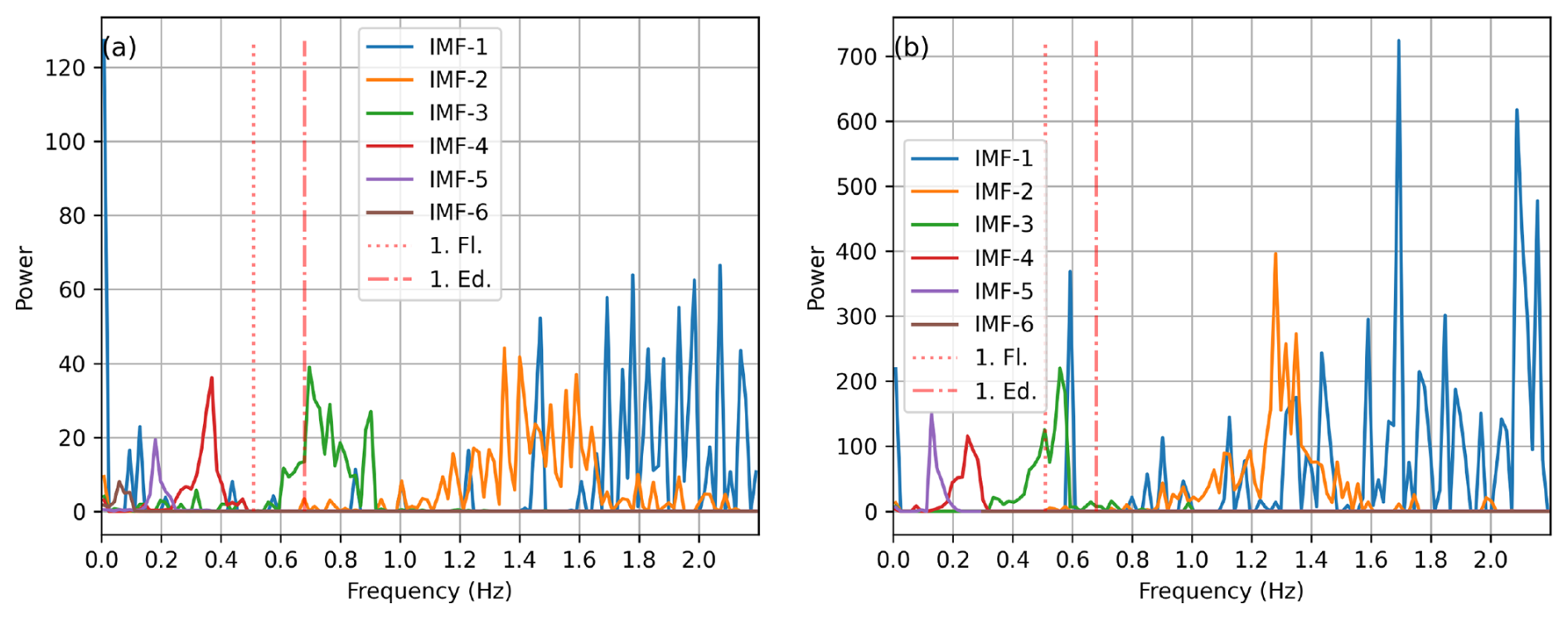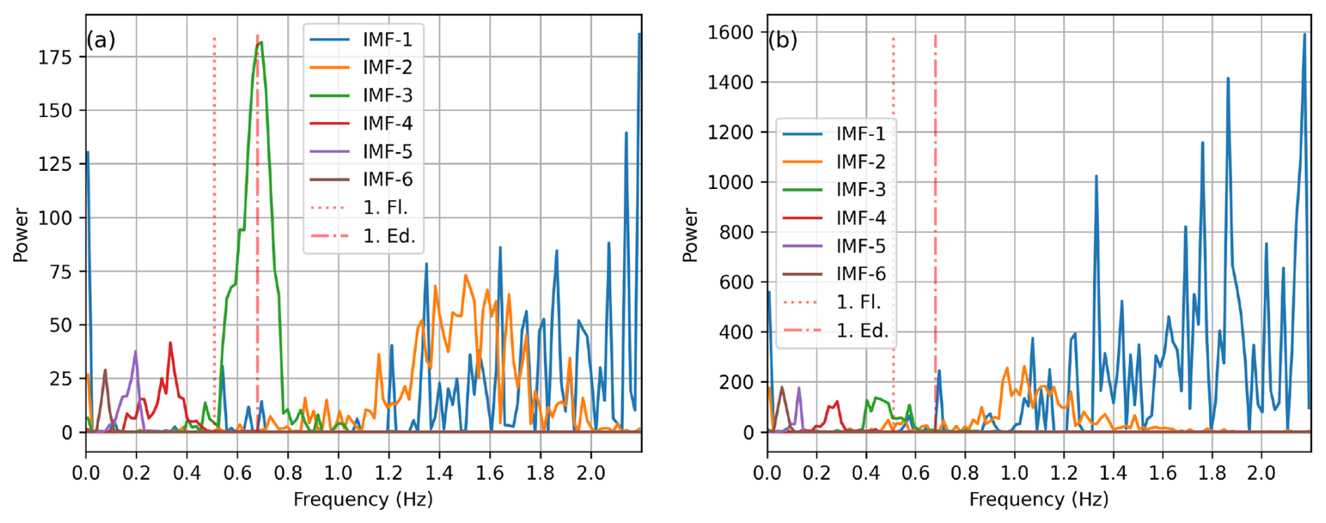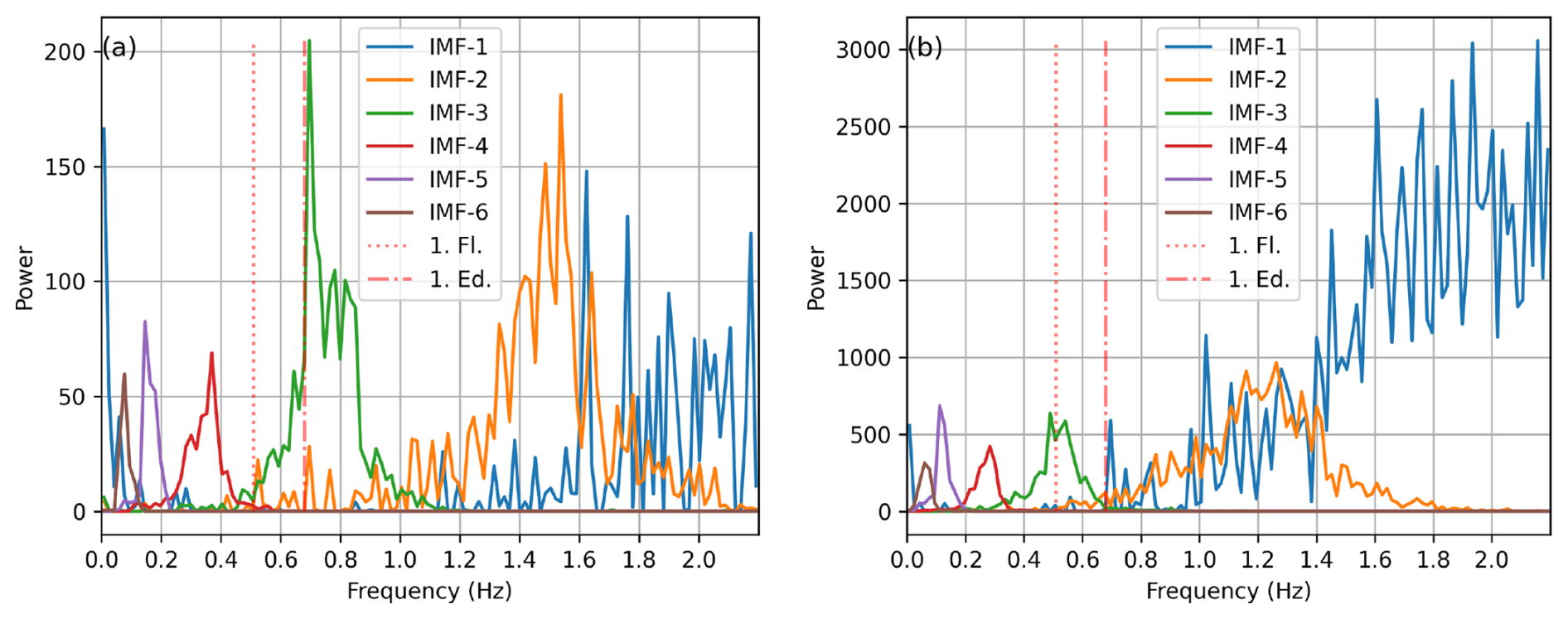 Figure 23Power spectrum of the inherent frequencies of each IMF of the flow velocity component v at for (a) case FLEX37 and (b) case FLEX60 from 0 to 20 s. The vertical lines indicate the first two eigenfrequencies of the blade, i.e., first flapwise frequency (1. Fl. – dotted line) and first edgewise frequency (1. Ed. – dashed-dotted line).