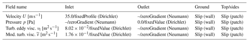 where ux describes the velocity in the x direction as a function of the height z. and ux,hub is the fixed hub height wind speed of 35 m s−1. zhub is defined as the hub height of 150 m, and α represents the shear factor exponent chosen as 0.11 to form a realistic inflow. Velocity components in the y and z direction are set to 0 m s−1. Turbulent viscosity values were chosen to reflect a turbulence intensity of 0.1 % in the rotor plane. The choice was made to minimize the impact of the incoming flow on the breakdown of vortices shed from the blades.