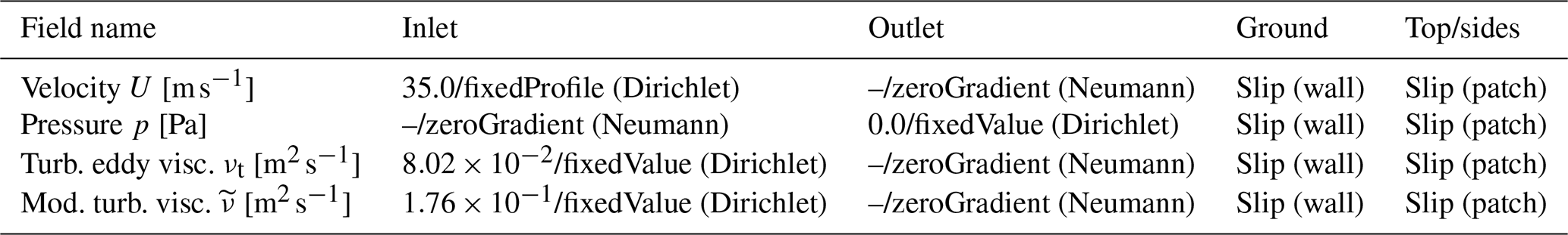 Velocity, pressure, and turbulence boundary conditions are set as shown in Table 1. Here, a fixed profile boundary condition for velocity follows the atmospheric power law function as follows: