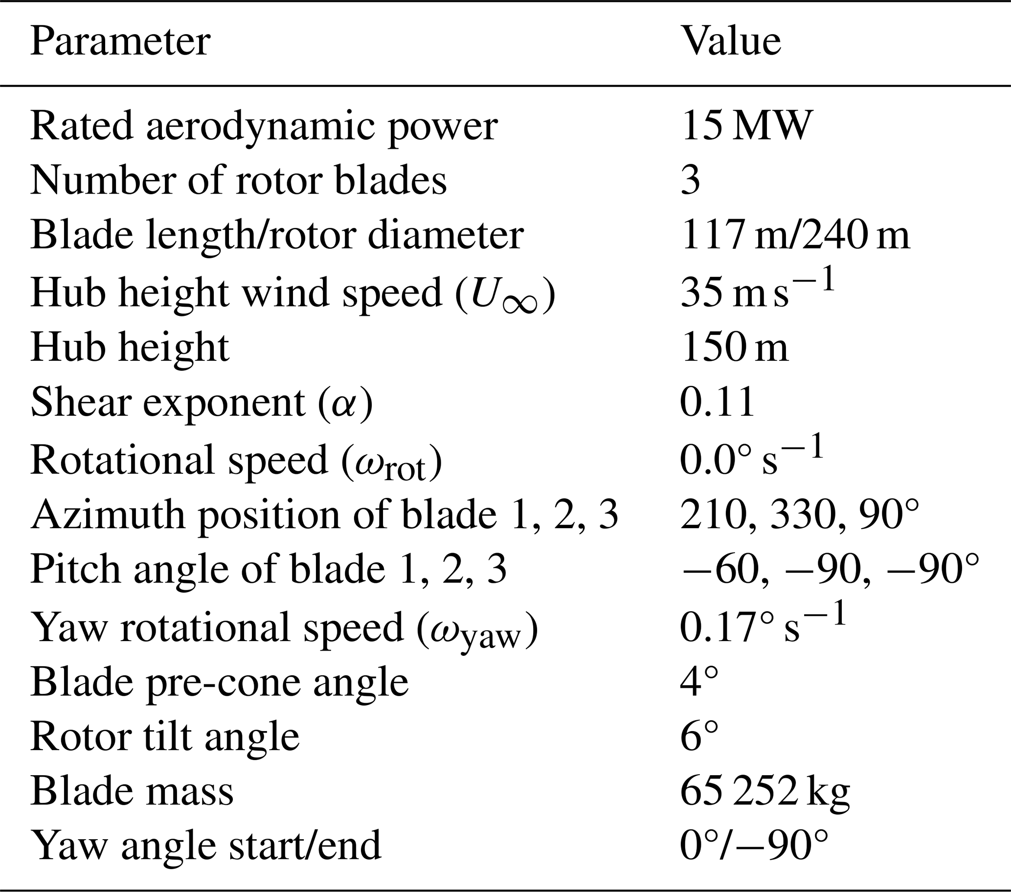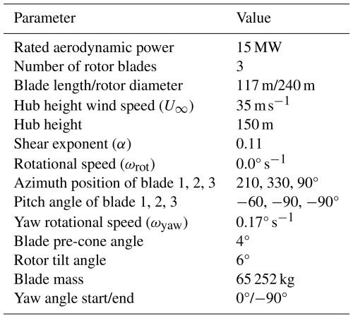 Table 2Overview of the main rotor characteristics of the IEA 15 MW reference turbine and the investigated conditions.