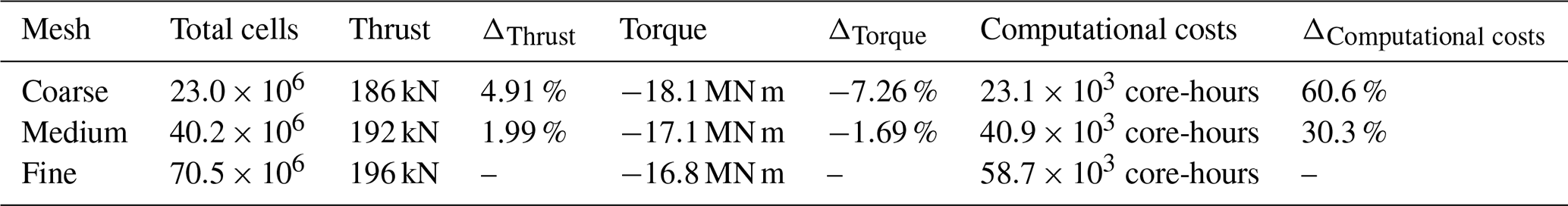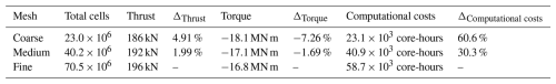 Blade meshes have been created using the in-house meshing tool BladeBlockMesher (Rahimi et al., 2016), which composes 2D sectional meshes into a 3D structured blade volume mesh, consisting only of hexahedral cells. For most first-layer cells, the y+ value is between 30 and 70, and a wall function ensures a consistent turbulent viscosity profile across all walls. When velocities near the blades are low and smaller y+ values are present, the wall function is automatically disabled to improve accuracy, for example, in regions of flow separation. Since no validation data are available, the choice of grid resolution is based on a grid dependence study. For that purpose, three differently refined meshes have been analyzed for blade 2 under inflow conditions of −37° yaw misalignment in standstill. The coarse mesh consists of 23.0×106 cells, while the medium-refined grid consists of 40.2×106 cells. The fine mesh has a total of 70.5×106 elements. All three mesh directions have been refined simultaneously by ≈ 20 %, resulting in a global refinement factor of from the coarse to the medium-refined grid and a refinement factor of from the medium to the fine grid.