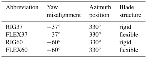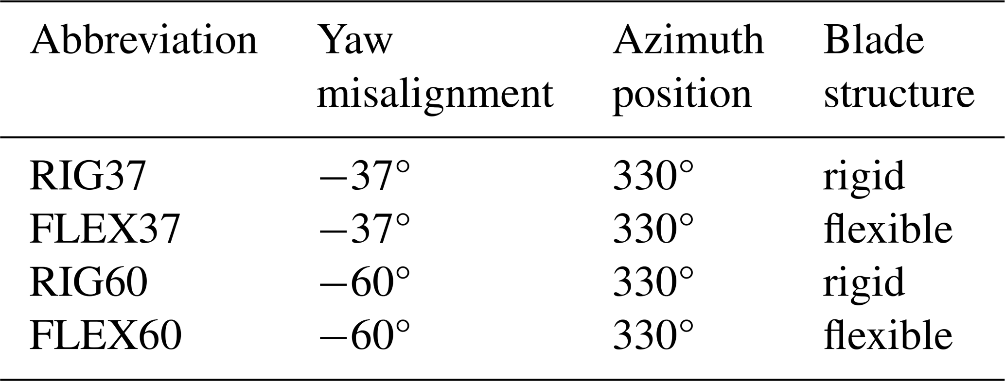 To contrast situations of high- and low-blade-vibration amplitudes, single blade setups of yaw misalignments of −37 and −60° at an azimuth angle of 330° are being focused on. The first case reflects a scenario with negative aerodynamic damping, while the second case represents a clear damping period, where all vibrations have ceased (see Fig. 3e). Both cases are simulated in a rigid and flexible manner. For convenience, the four described cases are abbreviated as shown in Table 4.