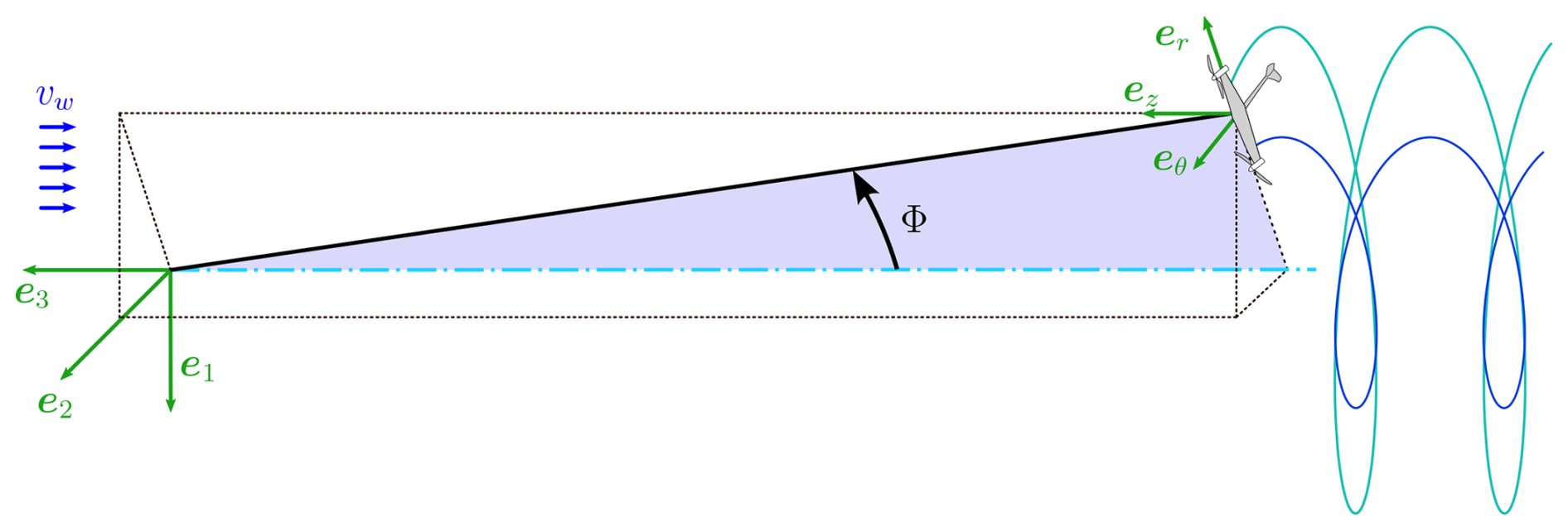 Figure 1Ground coordinate system (e1,e2,e3) and cylindrical coordinate system (eθ,er,ez). vw is the incoming wind speed, and Φ is the opening angle of the circular trajectory, centered on the light-blue dash-dotted line. The light- and dark-blue helices represent the right- and left-trailed vortices.