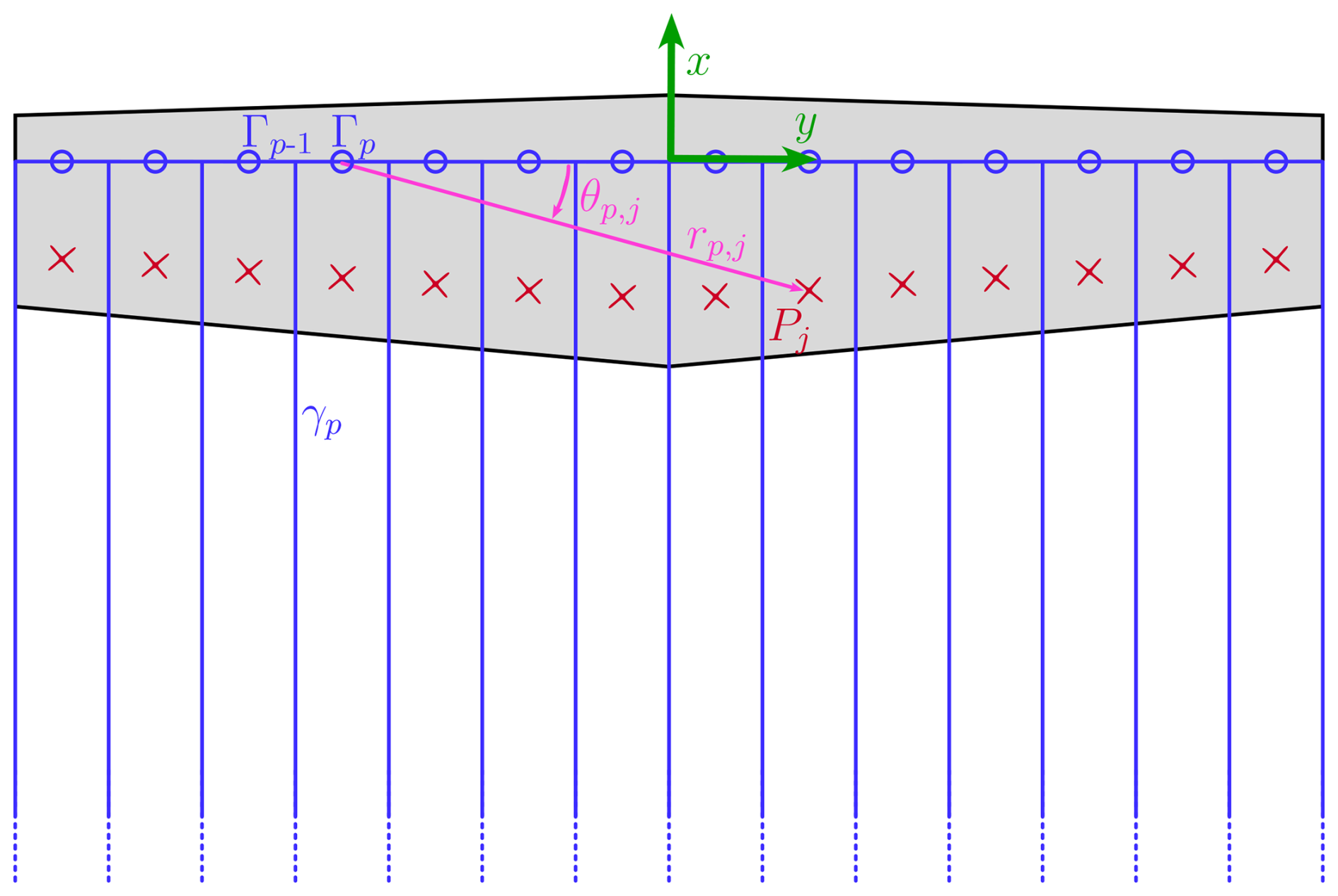 Referring to Fig. 3, we model the wing as a straight lifting line pointing along the y direction, discretized in Np elements, with Np being an even number. The chord direction of the airfoil at the wing center is taken to be equal to the x direction. Each element p is characterized by a bound vortex of strength Γp located along the direction of the quarter-chord line. According to the Helmholtz's vortex theorem, a vortex must extend to the boundaries of the fluid so that each element trails two vortexes of strength equal to Γp from its extremes. The number of trailed vortices is then Np+1, with intensity γp = Γp-Γp-1. According to Pistolesi's theorem, following the implementation by Damiani et al. (2019), we evaluate the induced velocities at the chord-wise position of the three-quarter chord of each element. The distance r of the evaluation point Pj=[-cj2;yj;0] with respect to the reference system placed on the quarter-chord line from a generic point located at l=[x;y;0] is
