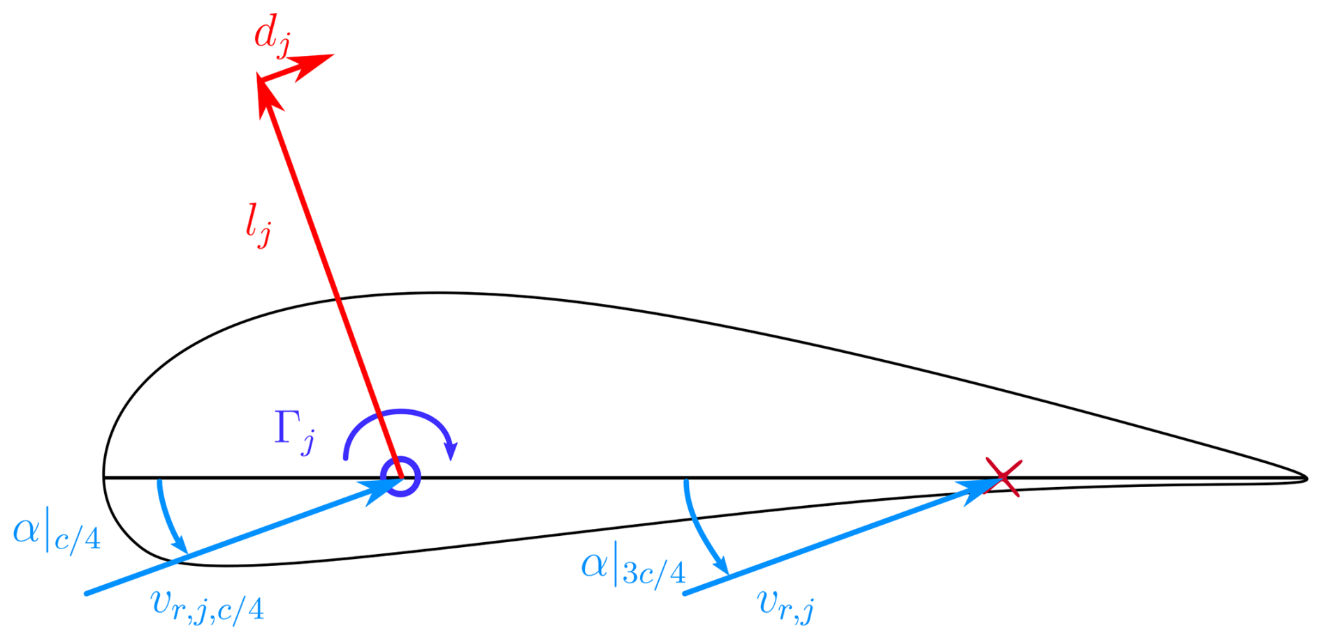 The velocity induced by an infinitesimal portion of the bound vortex located at l=[0;y;0] at the evaluation point Pj can be evaluated with Eq. (27), where dl=[0;dy;0] and r are given in Eq. (28):