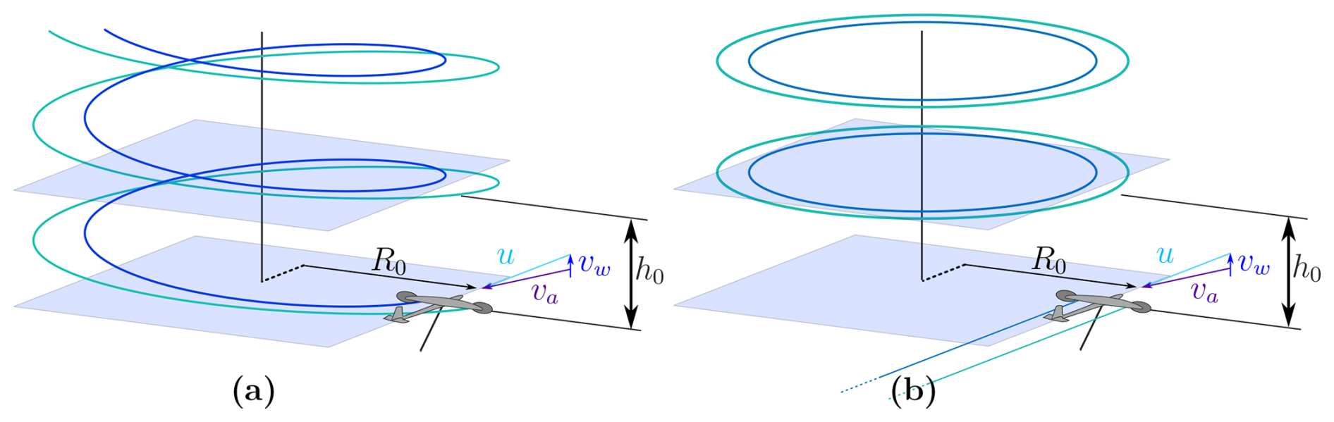 where L is the aerodynamic lift, Dp is the parasite drag, Di is the induced drag, Tt is the turbine thrust, m is the system mass (equal to the aircraft mass plus one-third of the tether mass, as derived from Trevisi et al.2020), u is the tangential velocity, R0 is the trajectory radius, Tz is the axial component of the tether force, and Φ is the opening angle of the circular trajectory.