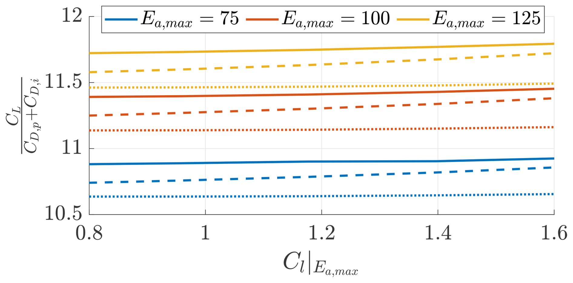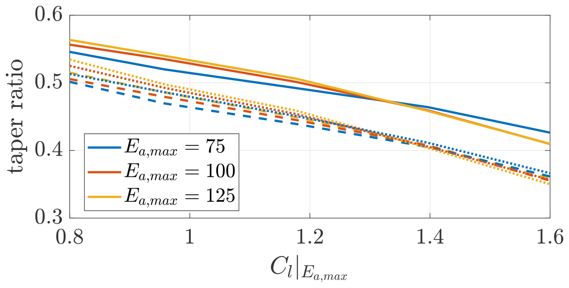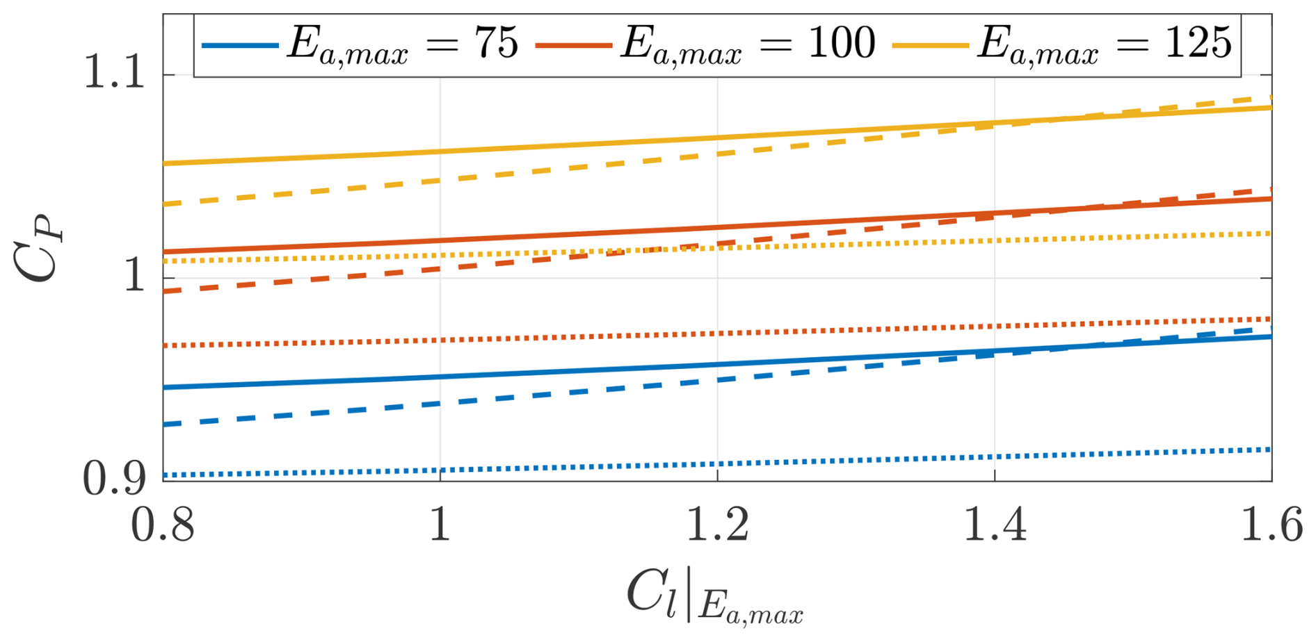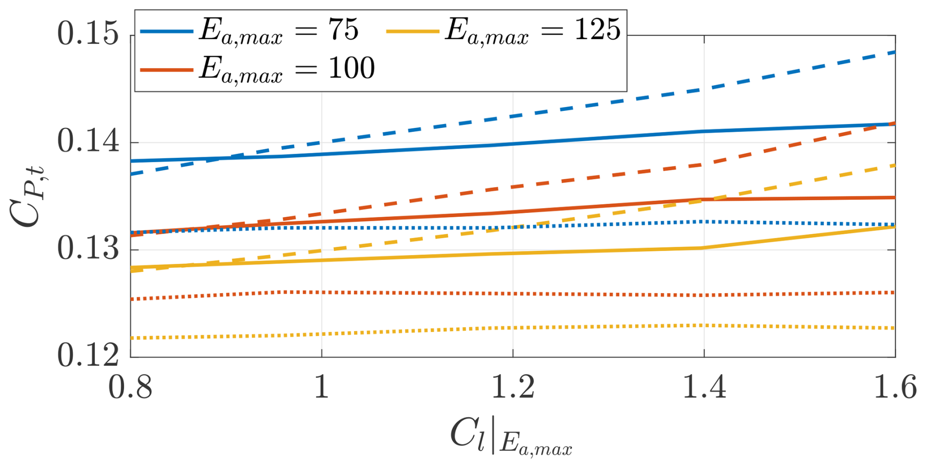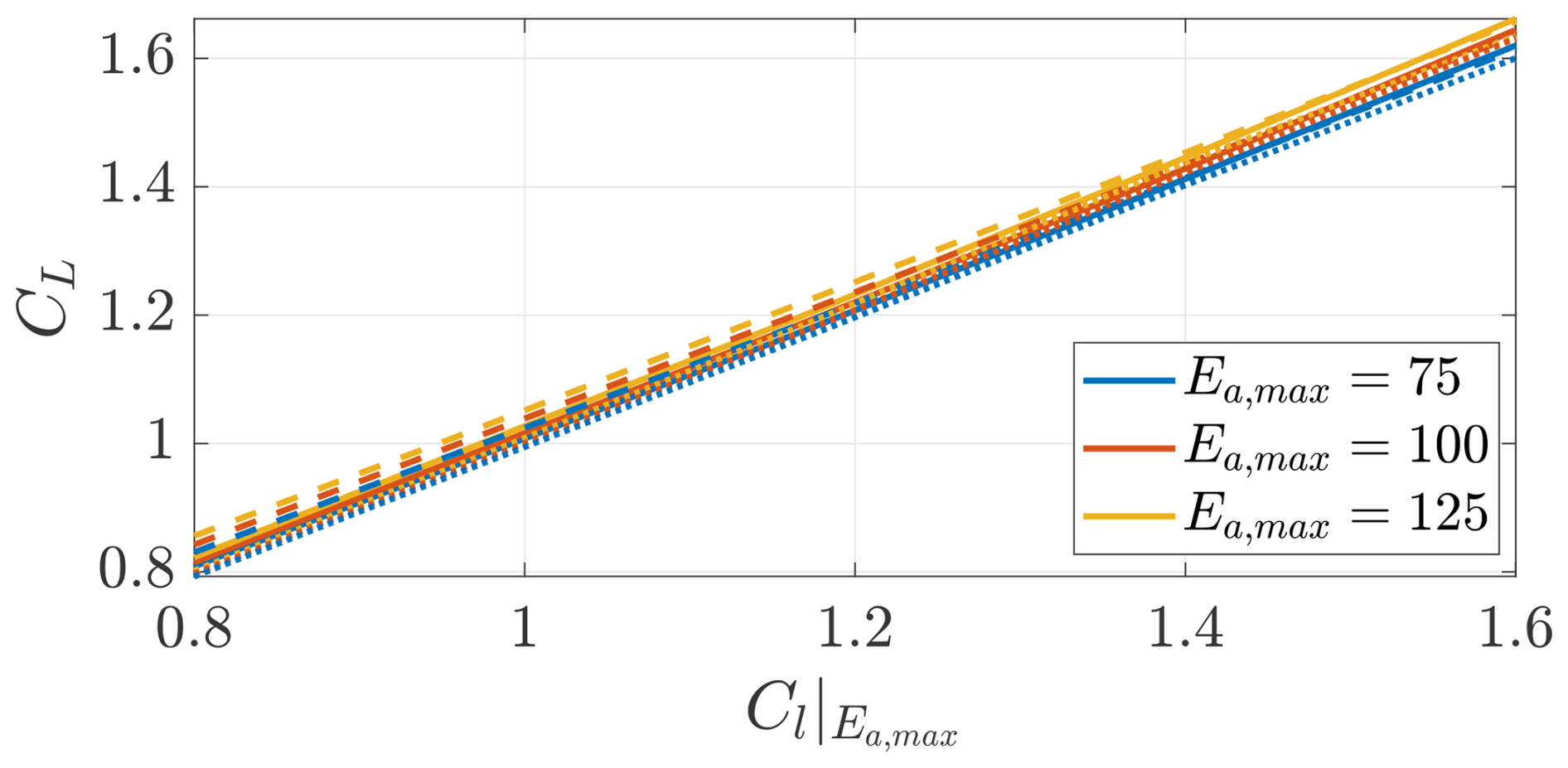 The angle of attack α is measured in radians. e2,a=1 for Ea,max=75, e2,a=1.5 for Ea,max=100, and e2,a=2 for Ea,max=125.