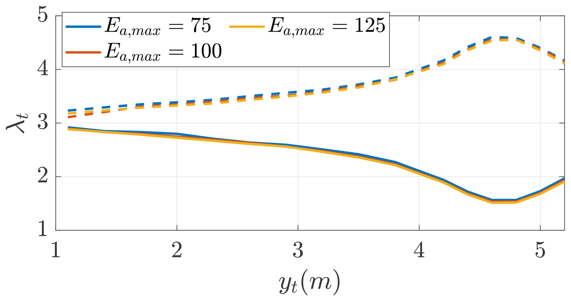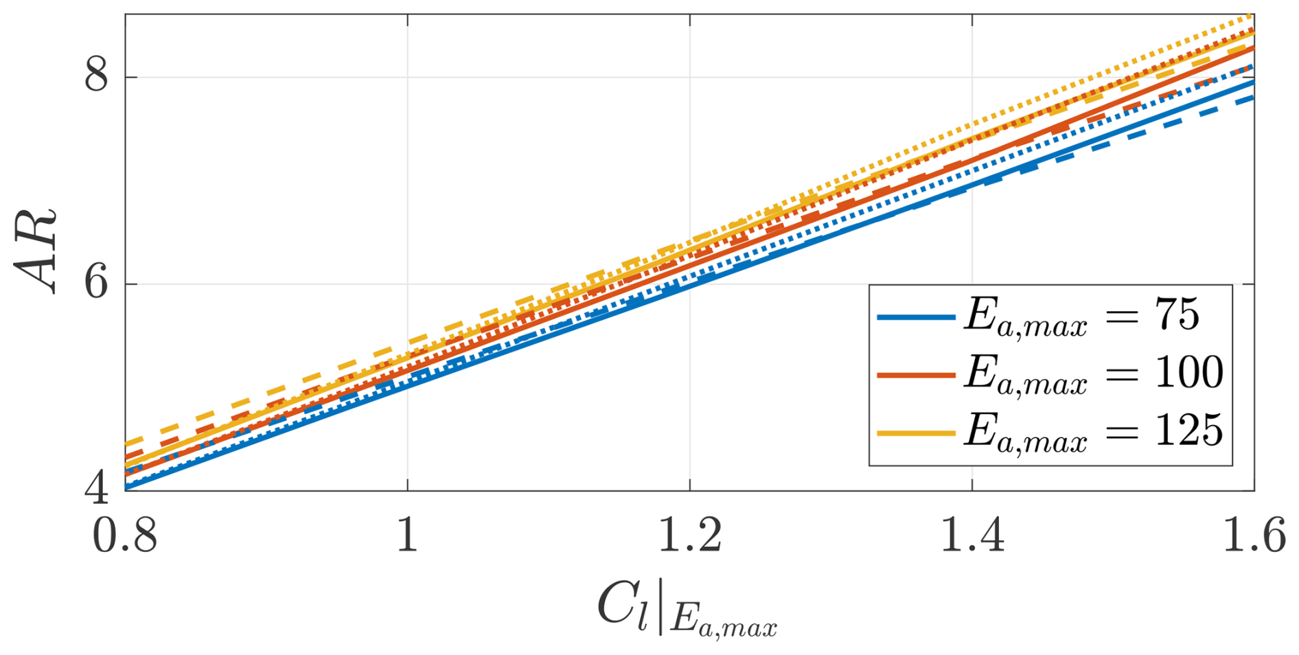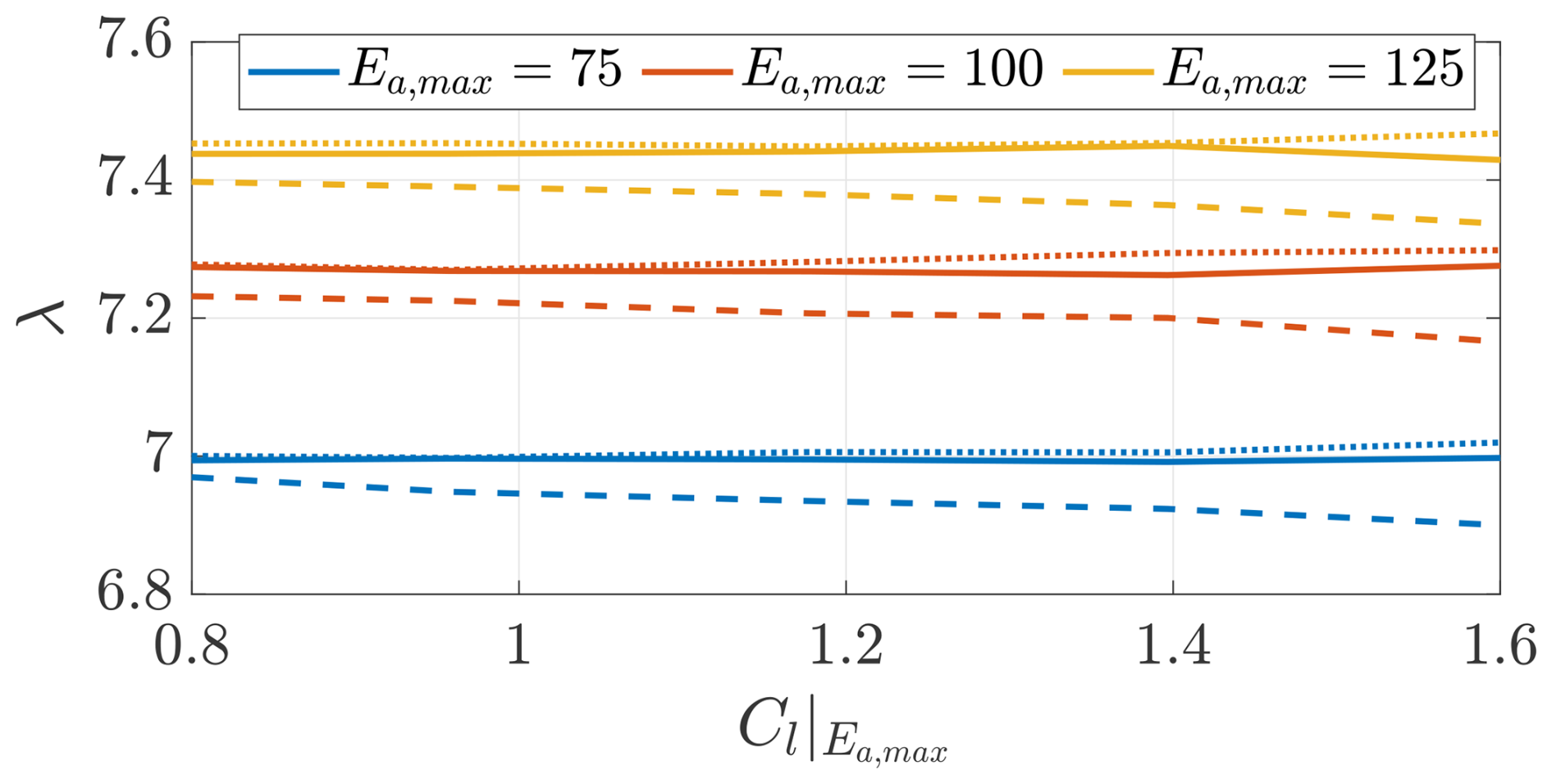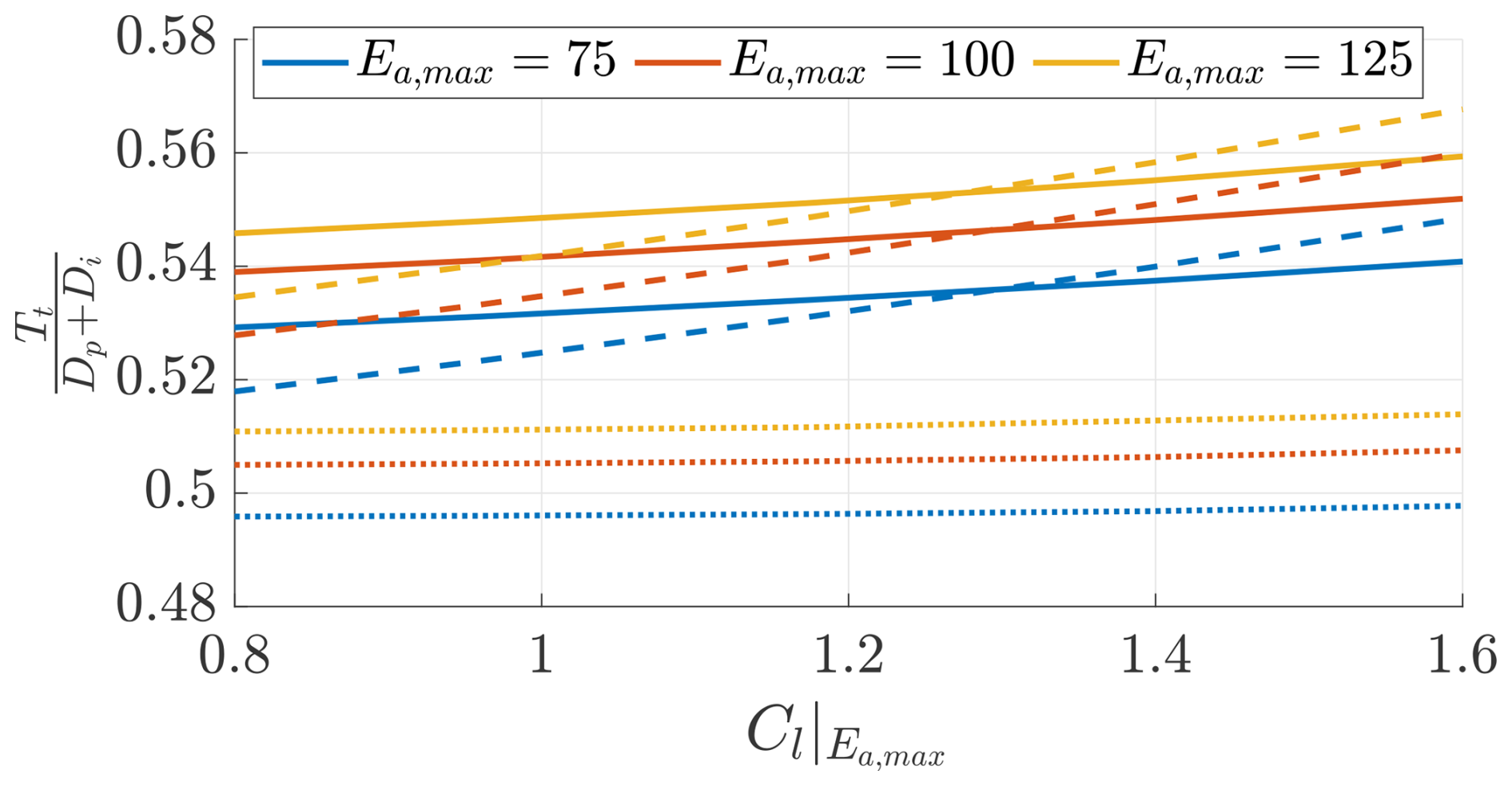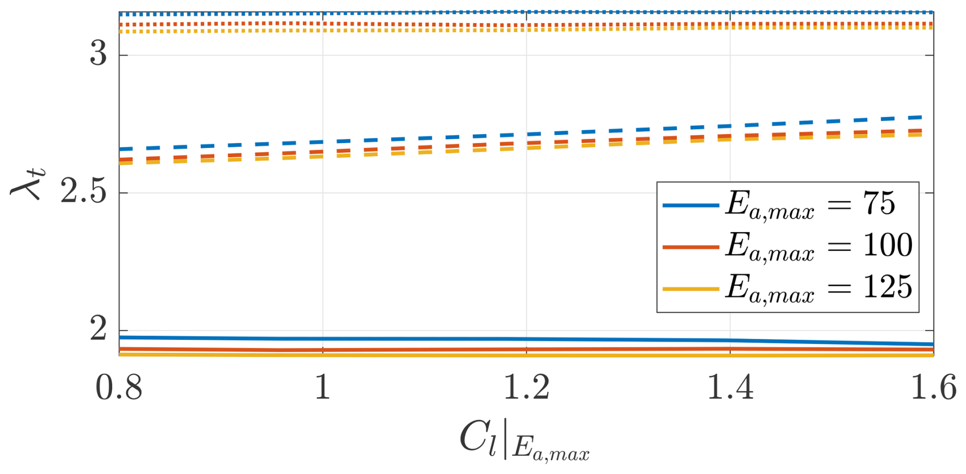 The angle of attack α is measured in radians. e2,a=1 for Ea,max=75, e2,a=1.5 for Ea,max=100, and e2,a=2 for Ea,max=125.