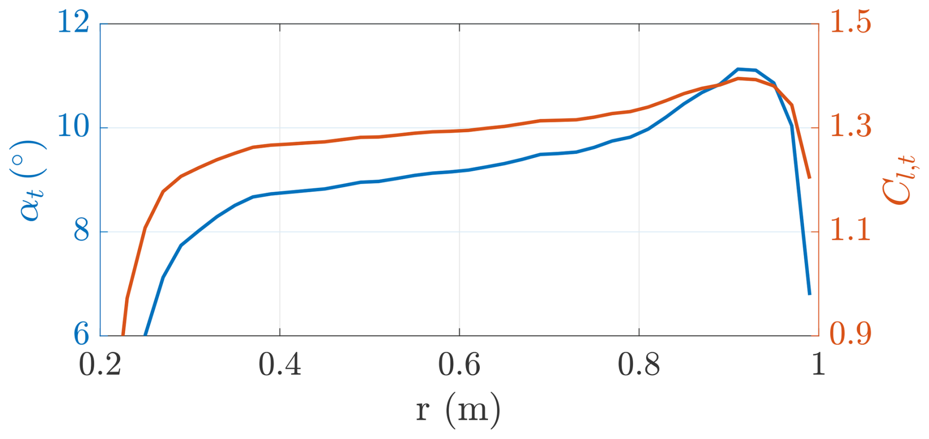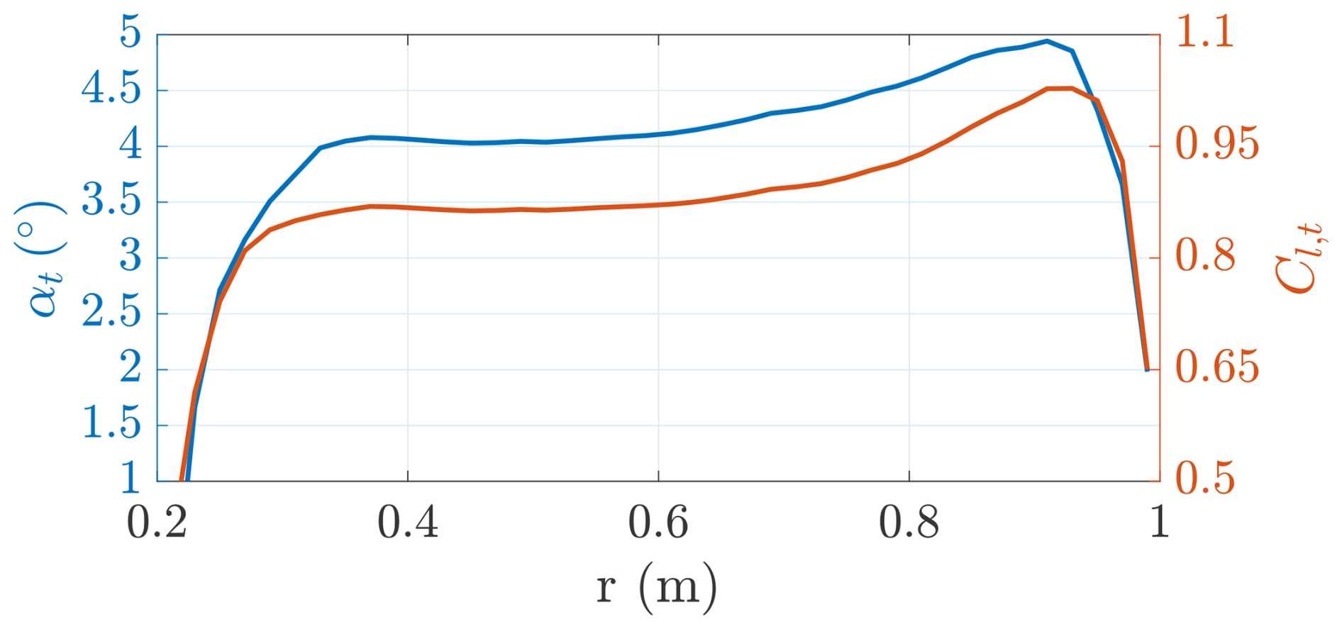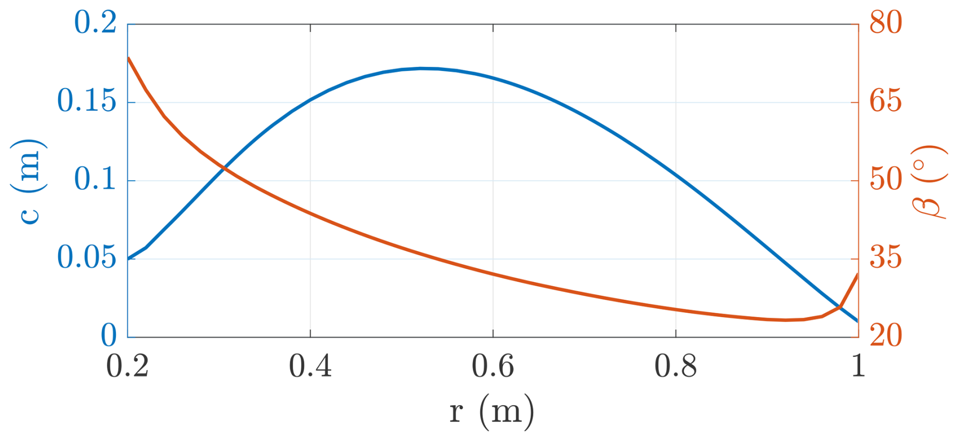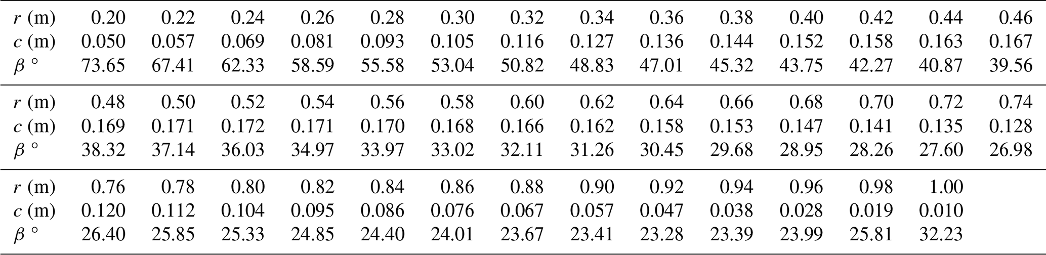 Table C1Onboard turbine chord and twist distribution for Rt=1 m.