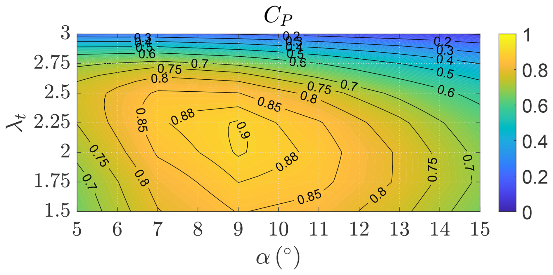 (14) P = 1 2 ρ A t C P , t v a 3 1 2 ρ A t C P , t λ 3 v w 3 = 1 2 ρ A t C P , t E 3 ( 1 - a f ) 3 v w 3 ,