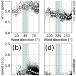 We examine the wind speed ratios to evaluate wake effects caused by the upstream wind turbine. Figure 6 shows wind speed ratios between the two wind turbines before we divided the data into two categories on the basis of the operating state of the upstream wind turbine. Variations in the wind speed ratio with wind direction are caused by the surrounding terrain and turbine wakes. The wind speed ratios are generally above 1.0 in Fig. 6a and below 1.0 in Fig. 6b, whereas we can identify V-shaped curves or significant reductions in wind speed ratios at around 40° and 225° (light-blue shading in Fig. 6a and b). These wind directions correspond approximately to the direction of the line connecting the two wind turbines (Fig. 1). The ranges of these significant reductions in wind speed ratio are approximately ±10° on both sides of the wind directions. We can see no other significant reduction in the remaining wind direction ranges. We focus on these two wind directions in the following analyses.