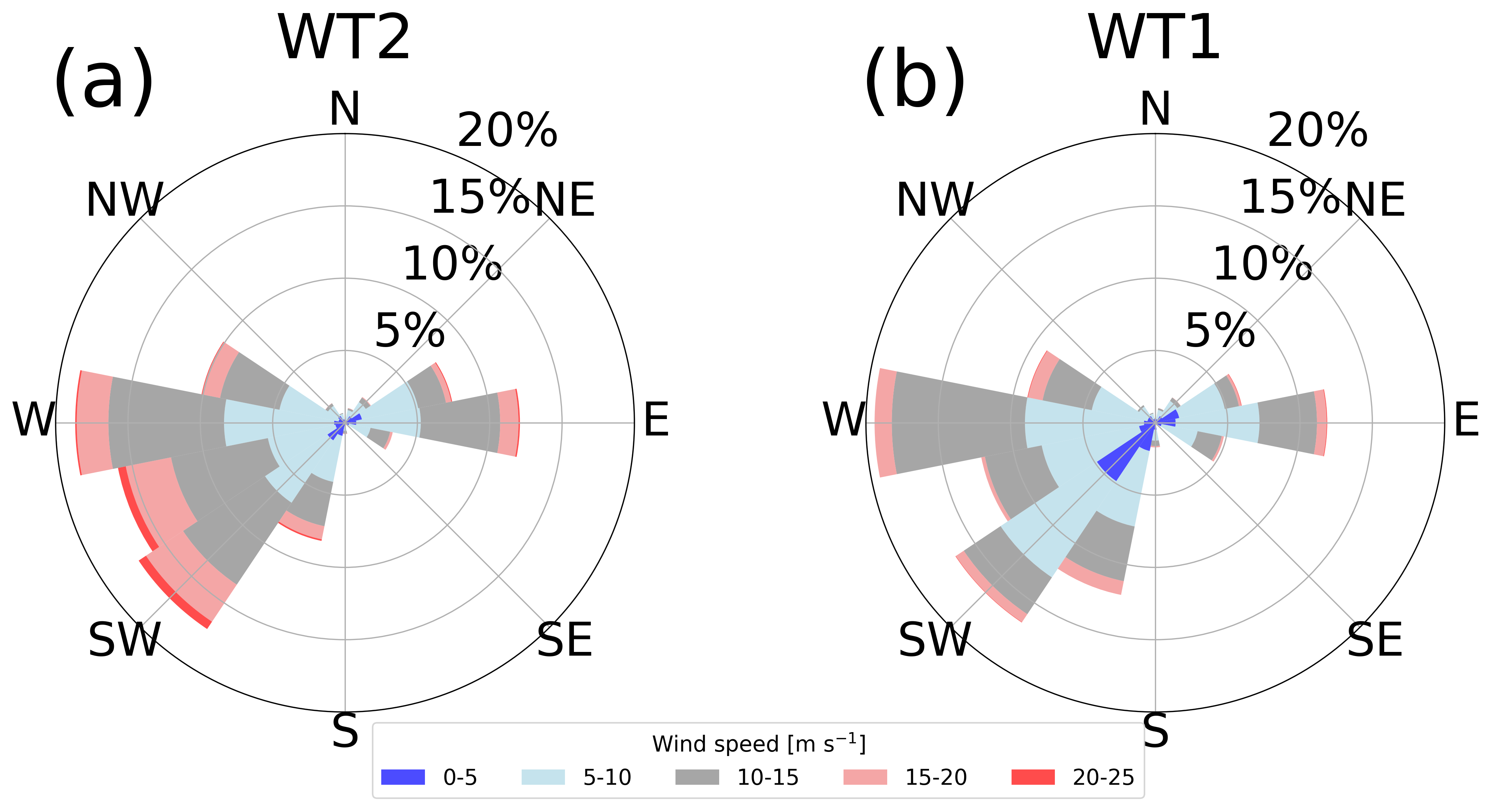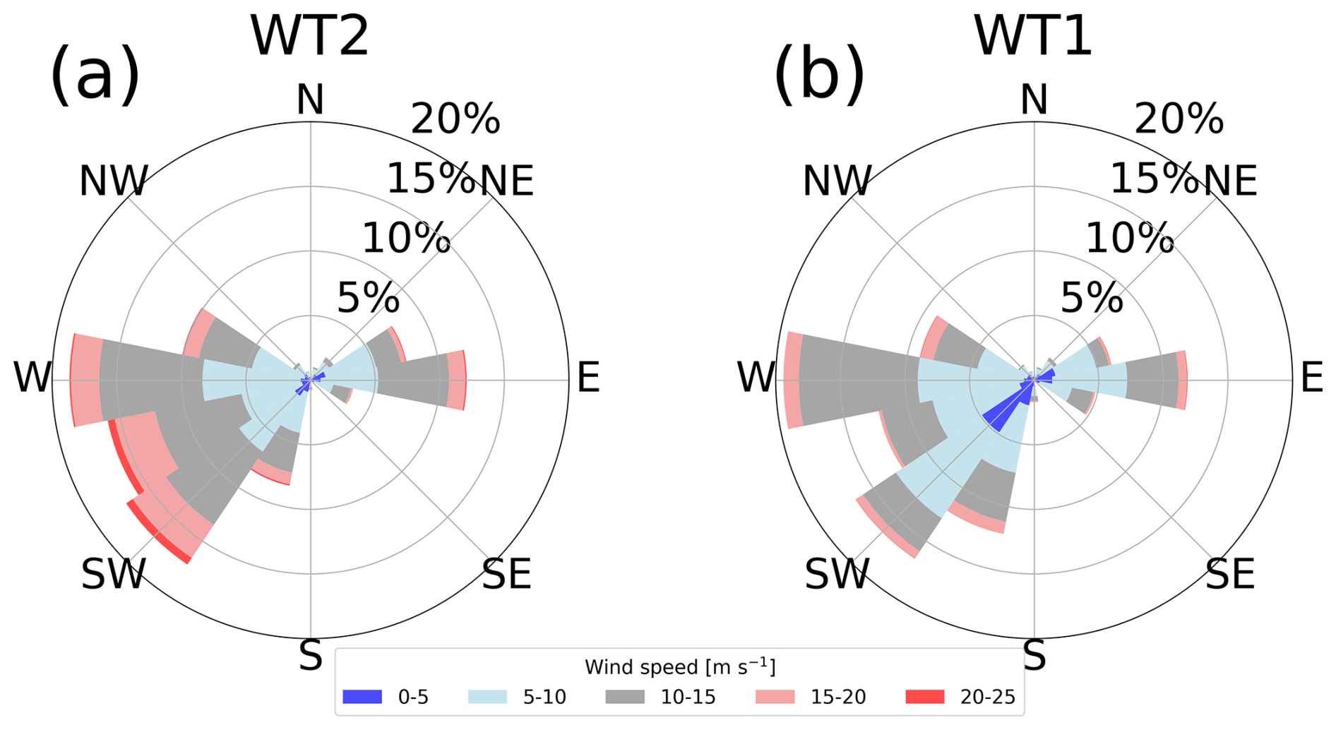 Figure 3Wind roses derived from the SCADA data of (a) WT2 and (b) WT1. The different colors are used every 5 m s−1. Wind direction is defined as the direction from which the wind blows.