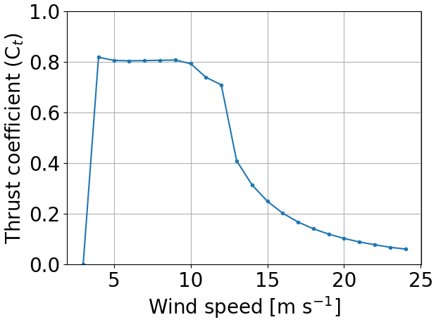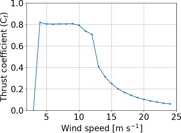 PyWake is an open-source wind farm simulation tool written in Python. This tool simulates the flow with wind turbines by incorporating wake models. PyWake has 12 wake models (Appendix A): 11 engineering wake models and a linearized RANS wake model (Fuga). Note that we used the default parameter values of the 12 wake models without adjusting the parameters to obtain the results close to the SCADA data. The sensitivity analysis of the model parameters is beyond the scope of this study. The Bastankhah model and TurboGaussian model, which we particularly focus on, have a reduction in wind speed with a Gaussian profile (Bastankhah and Porté-Agel, 2014; Pedersen et al., 2022). They have been validated for onshore fields (e.g., Jeon et al., 2015; Ruisi and Bossanyi, 2019; Fleming et al., 2020; zum Berge et al., 2024) and offshore fields (Farrell et al., 2021; Fischereit et al., 2022; Centurelli et al., 2024). The turbulence intensity is set to 0.2 in PyWake. We used the thrust coefficient curve of the V80 2 MW wind turbine because the rated power output of this wind turbine is closest to that of the wind turbines in this study among the wind turbine models available in PyWake. The thrust coefficient curve of the V80 is shown in Fig. 5. In this study, we discuss similarities and differences among the 12 wake models for mutual wind directions when a typical thrust coefficient curve is used.