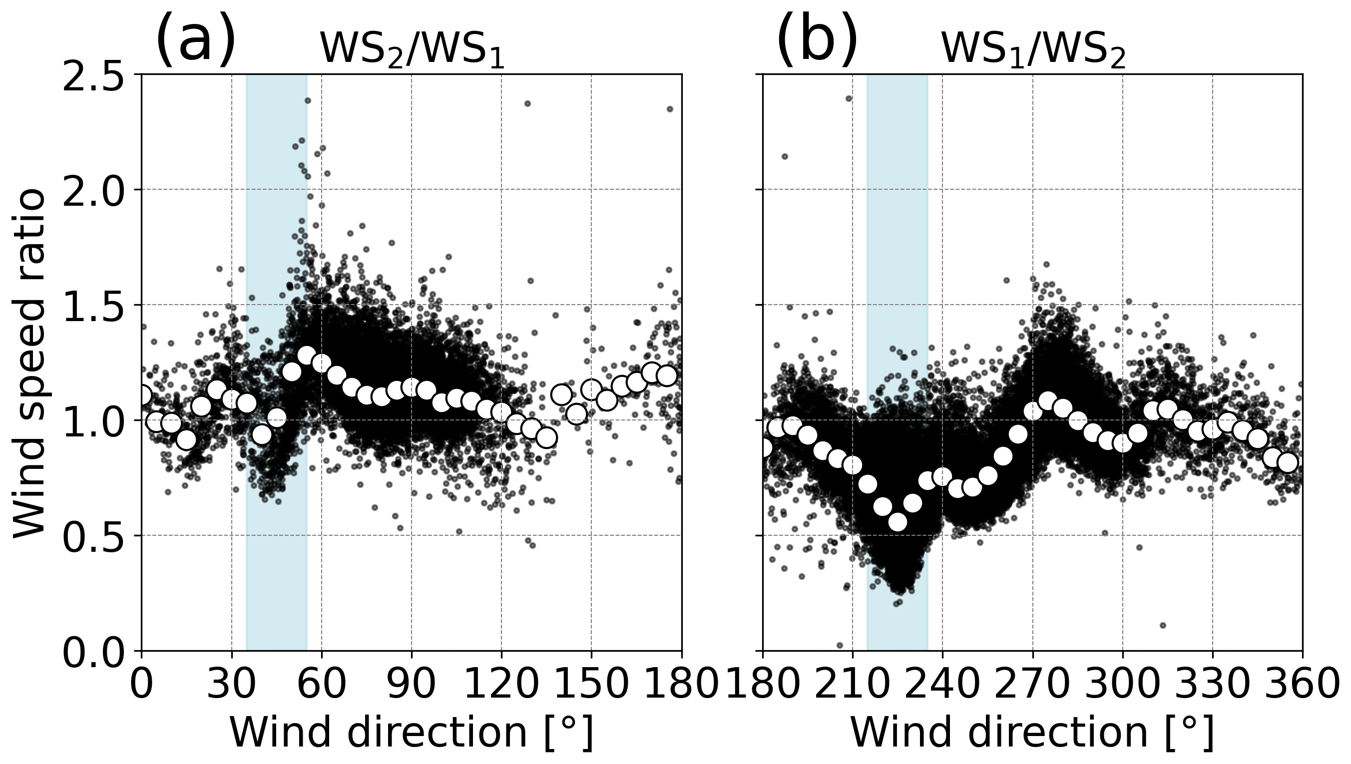Figure 6Wind speed ratios as a function of wind direction. Black dots denote 10 min mean data, and white circles denote median values in every 5° bin. In (a) and (b), wind directions at WT2 are commonly used for horizontal axes. Note that the definition of the wind speed ratio differs between (a) and (b). In (a), the wind speed ratio is defined as the ratio of wind speed at WT2 (WS2) to that at WT1 (WS1). In (b), the wind speed ratio is defined as the ratio of WS1 to WS2. These definitions of the wind speed ratio are common in the following analyses. Light-blue shading indicates the ranges of wind directions with wake effects for (a) 45° ± 10° and (b) 225° ± 10°.
