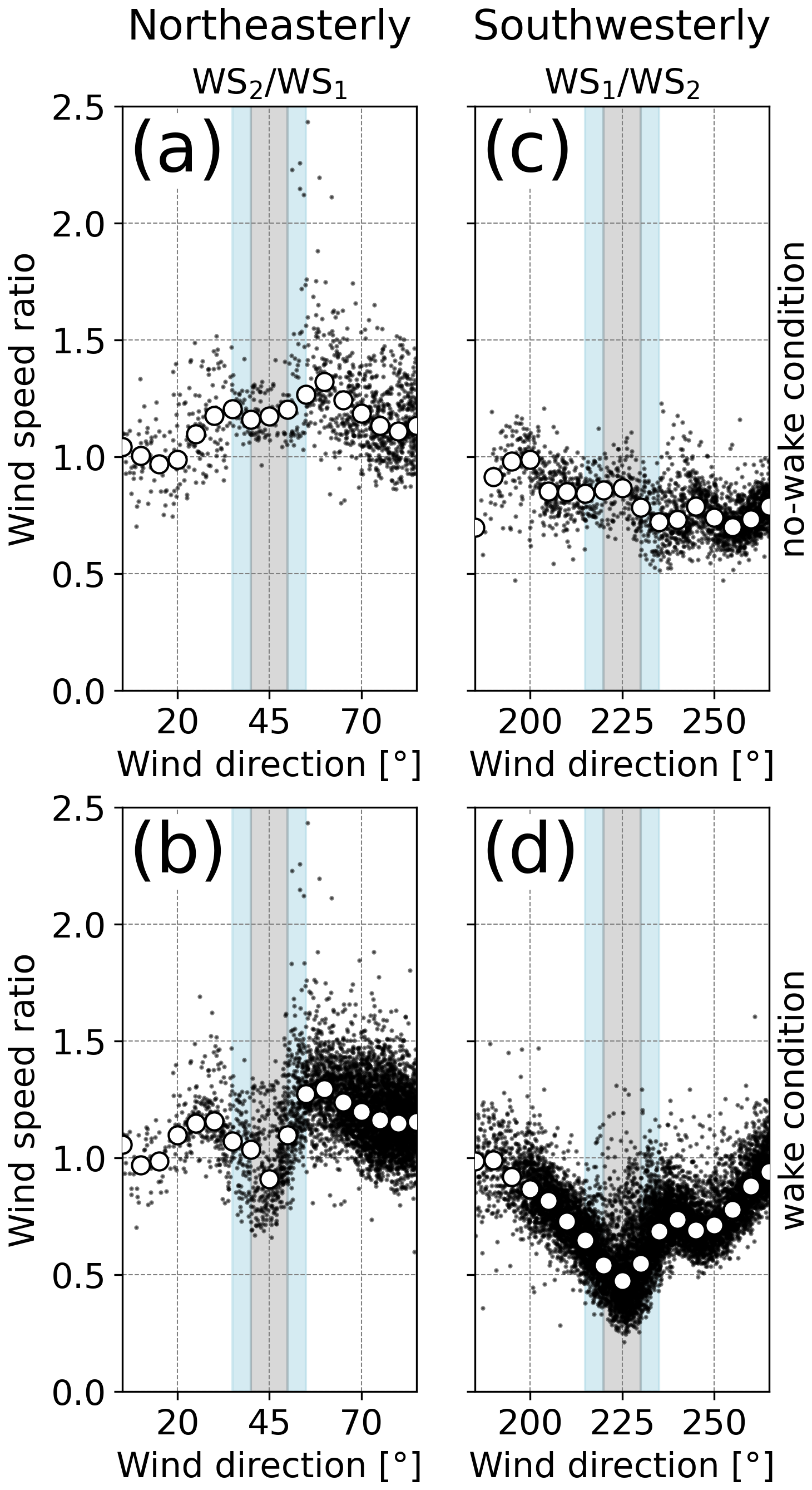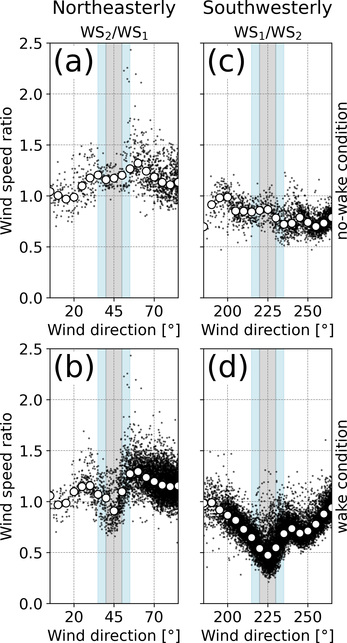 Figure 7The same as in Fig. 6 but for being classified by the operating state of the upstream wind turbine under (a, c) no-wake conditions and (b, d) wake conditions for (a, b) northeasterly wind and (c, d) southwesterly wind. Light-blue and gray shadings indicate the range of the wind direction with wake effects. The gray shading in the ranges of (a, b) 45° ± 5° and (c, d) 225° ± 5° represents the focused ranges of wind direction for the analyses in Figs. 8, 9, and 10.