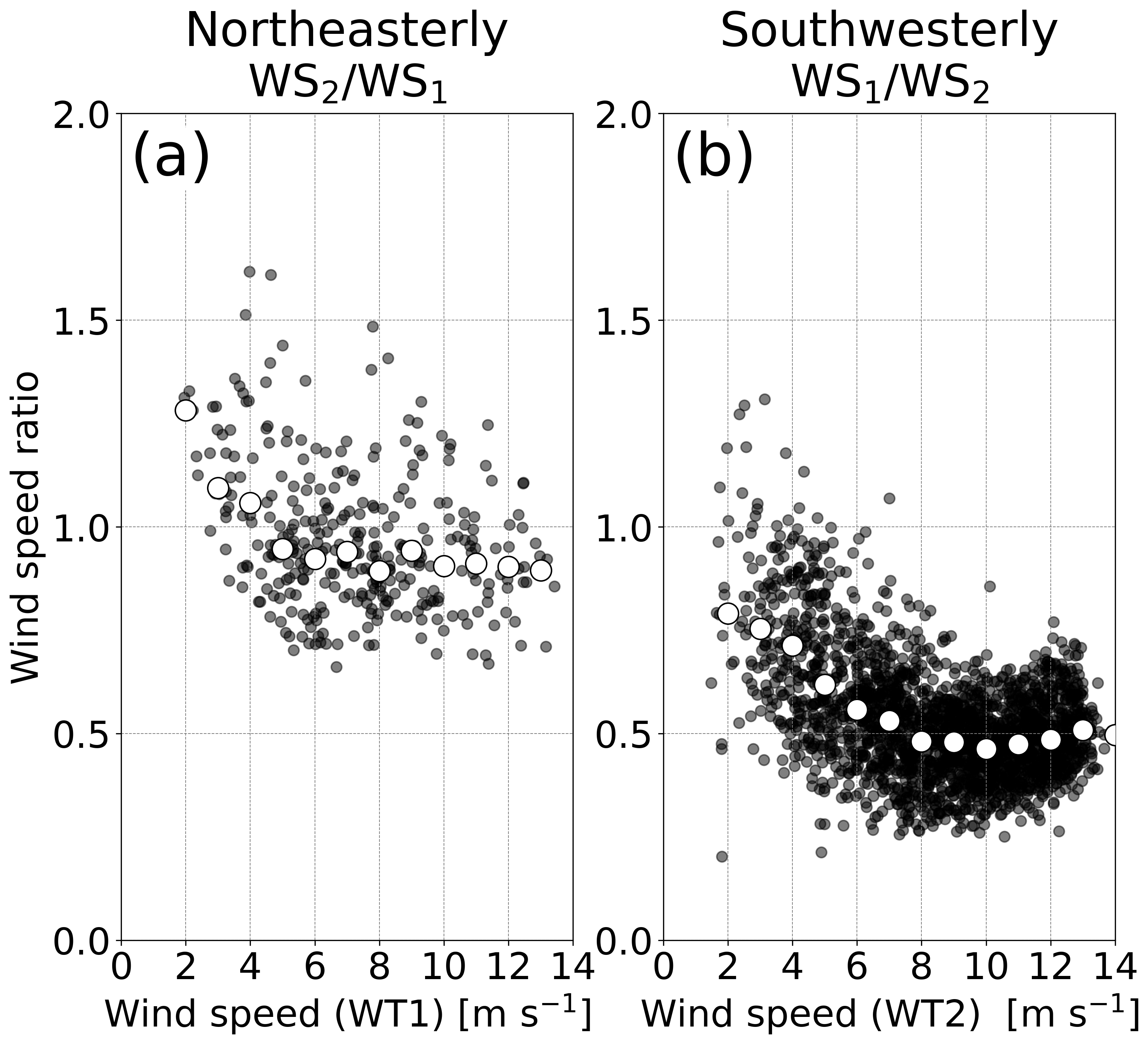 Figure 8Wind speed ratio as a function of wind speed at the upstream wind turbine in operation for (a) northeasterly wind and (b) southwesterly wind. Black dots denote 10 min mean data, and white circles denote median values in every 1 m s−1 bin. The data are extracted from the focused ranges of wind direction, denoted by the gray shading in Fig. 7b and d.