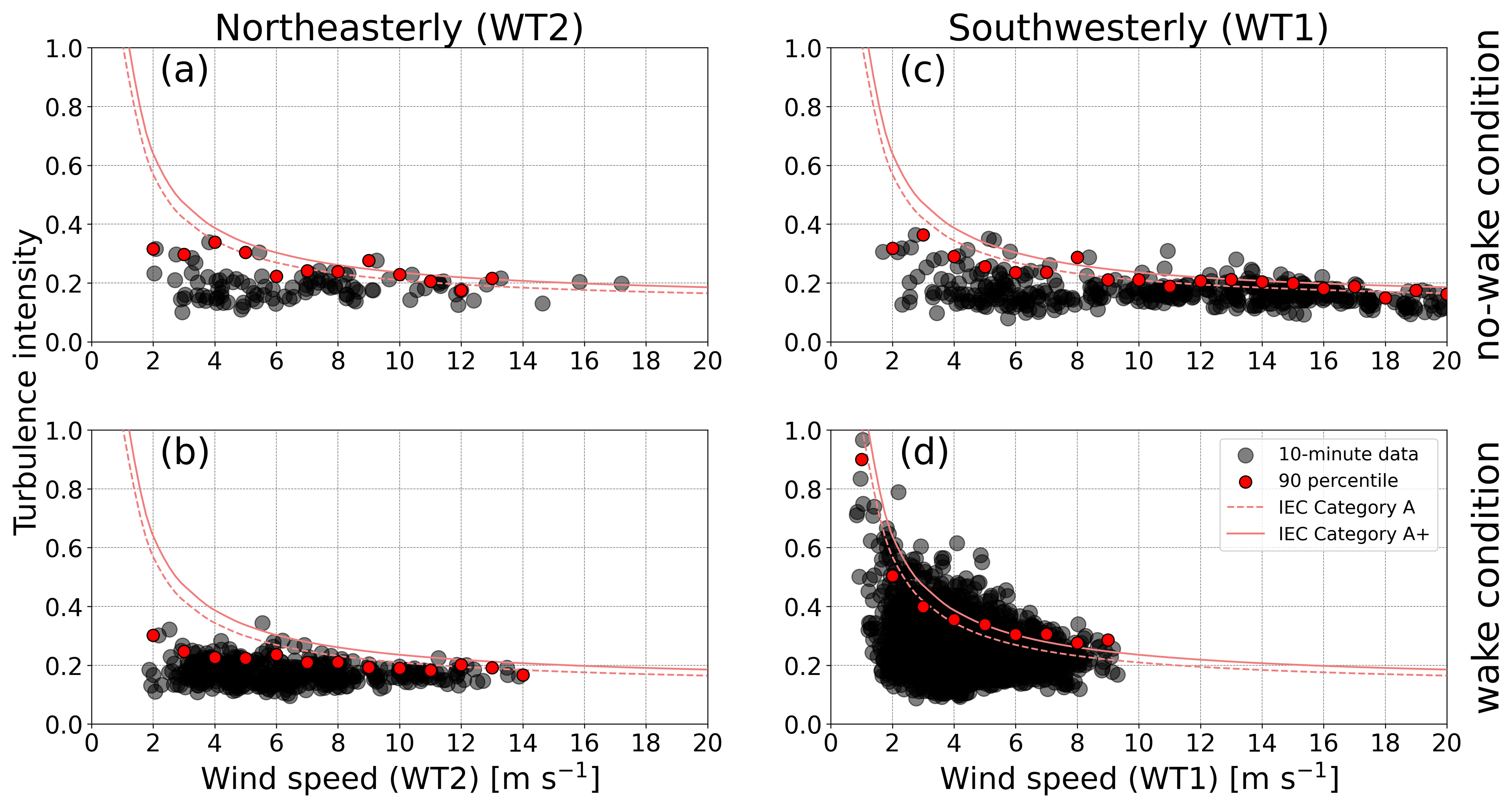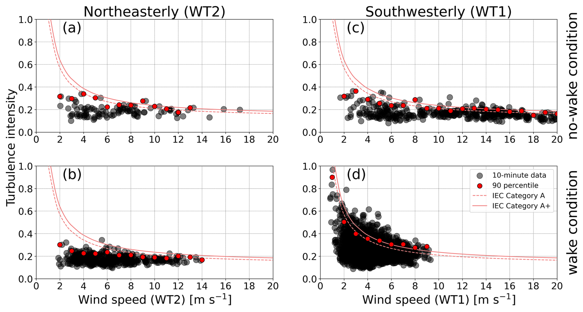 Figure 9Turbulence intensity as a function of wind speed at the downstream wind turbine under (a, c) no-wake conditions and (b, d) wake conditions for (a, b) northeasterly wind and (c, d) southwesterly wind. The horizontal axis represents wind speed at the downstream wind turbine WS2 in (a) and (b) and at WS1 in (c) and (d). Black dots denote 10 min mean data, and red circles denote 90th-percentile values in every 1 m s−1 bin. The dashed red lines indicate standard curves of the International Electrotechnical Commission (IEC) category A for high turbulence, as shown in Eq. (1), and the solid red lines indicate standard curves of the IEC category A+ for very high turbulence, as shown in Eq. (2). The data are extracted from the focused ranges of wind direction, denoted by the gray shading in Fig. 7.
