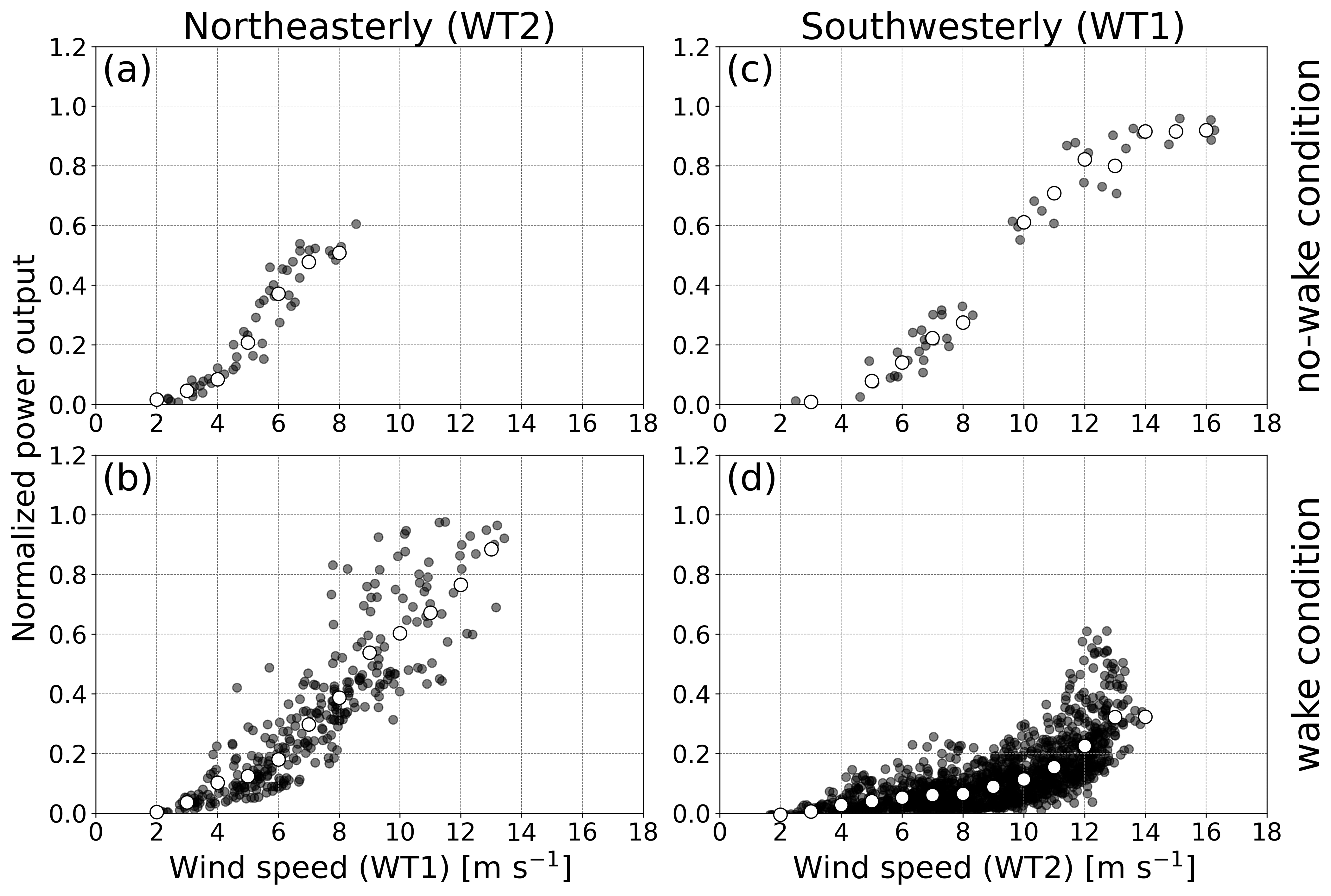 Figure 10Normalized power output as a function of wind speed at the upstream wind turbine under (a, c) no-wake conditions and (b, d) wake conditions for (a, b) northeasterly wind and (c, d) southwesterly wind. The normalized power output in the vertical axis represents power output divided by the rated power output. The horizontal axis represents wind speed at the upstream wind turbine WS1 in (a) and (b) and WS2 in (c) and (d). Black dots denote 10 min mean data, and white circles denote median values in every 1 m s−1 bin. The data are extracted from the focused ranges of wind direction, denoted by the gray shading in Fig. 7.