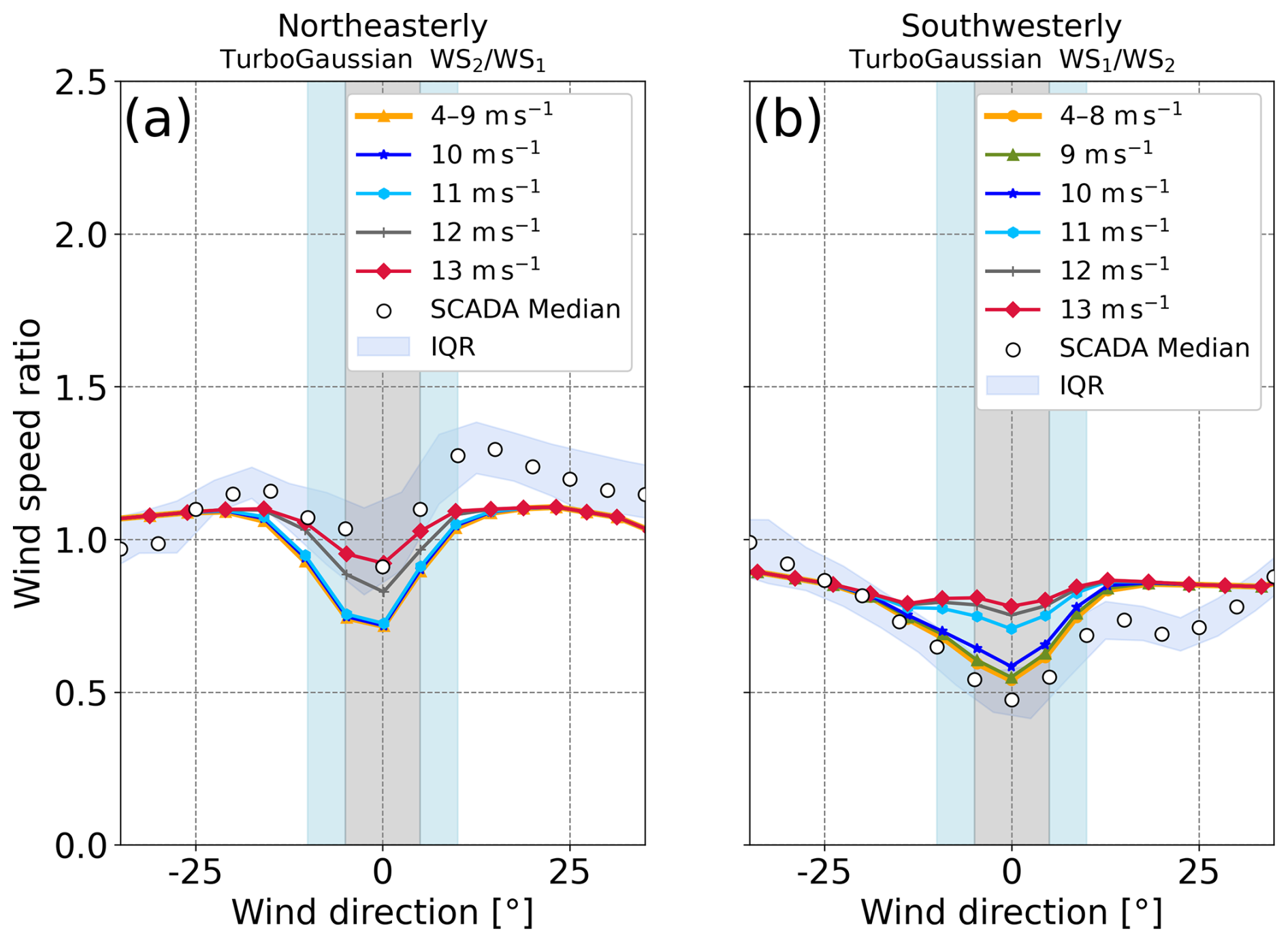 Figure 11Wind speed ratio as a function of wind direction for (a) northeasterly wind and (b) southwesterly wind. Colored lines are results derived from the TurboGaussian wake model for inflow wind speeds ranging from 4 to 13 m s−1 at an interval of 1 m s−1. The results for (a) 4–9 m s−1 and (b) 4–8 m s−1 are shown by one line because the differences are negligible. The horizontal axis indicates differences in wind direction, with the minimum wind speed ratio at 0° for both the SCADA data and the results of the wake model. The blue band denotes the interquartile range (IQR) of the SCADA data, and white circles denote median values in every 5° bin. Light-blue and gray shadings indicate the ranges of wind directions with wake effects.