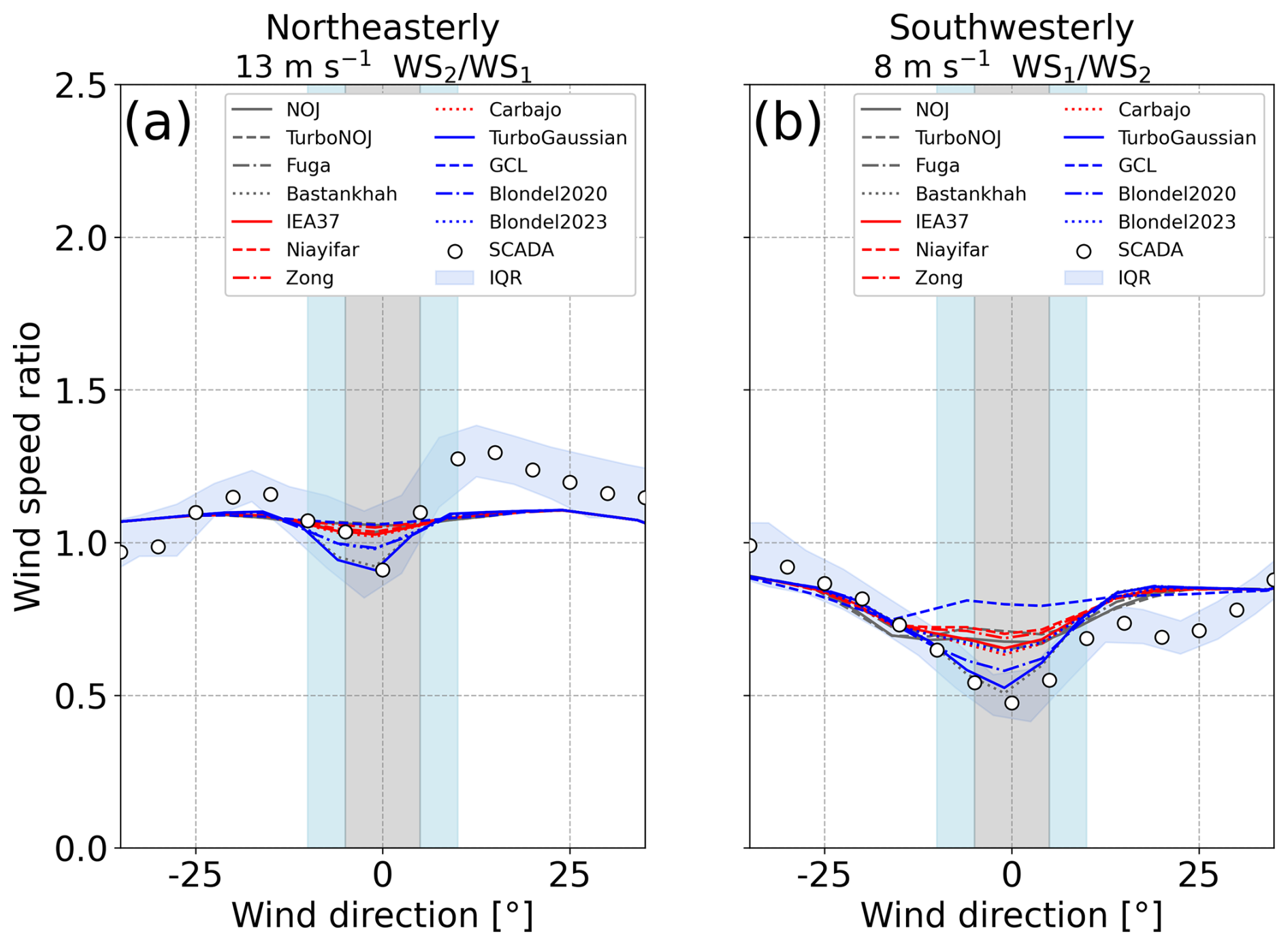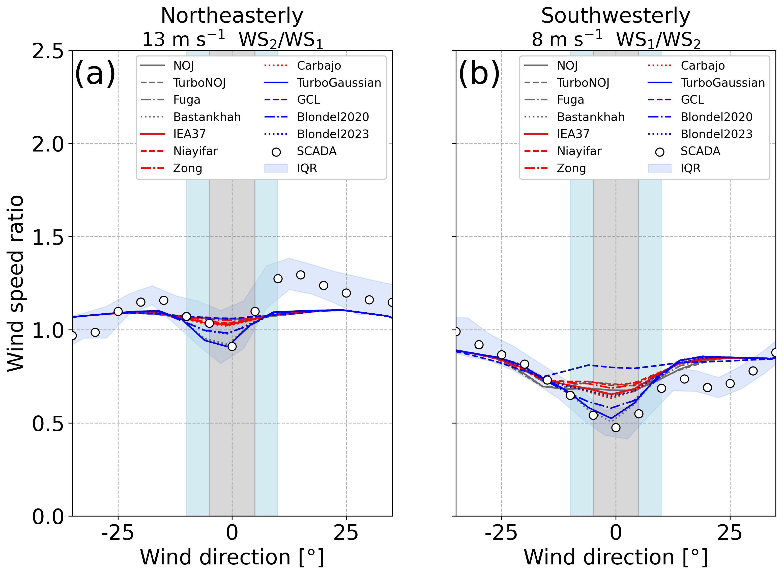 Figure 12Wind speed ratio as a function of wind direction for (a) northeasterly wind and (b) southwesterly wind. Colored lines are results derived from 12 wake models at an inflow wind speed of (a) 13 m s−1 and (b) 8 m s−1. The horizontal axis indicates differences in wind direction, with the minimum wind speed ratio at 0° for both the SCADA data and the results of the wake models. The blue band denotes the interquartile range (IQR) of the SCADA data, and white circles denote median values in every 5° bin. Light-blue and gray shadings indicate the ranges of wind direction with wake effects.