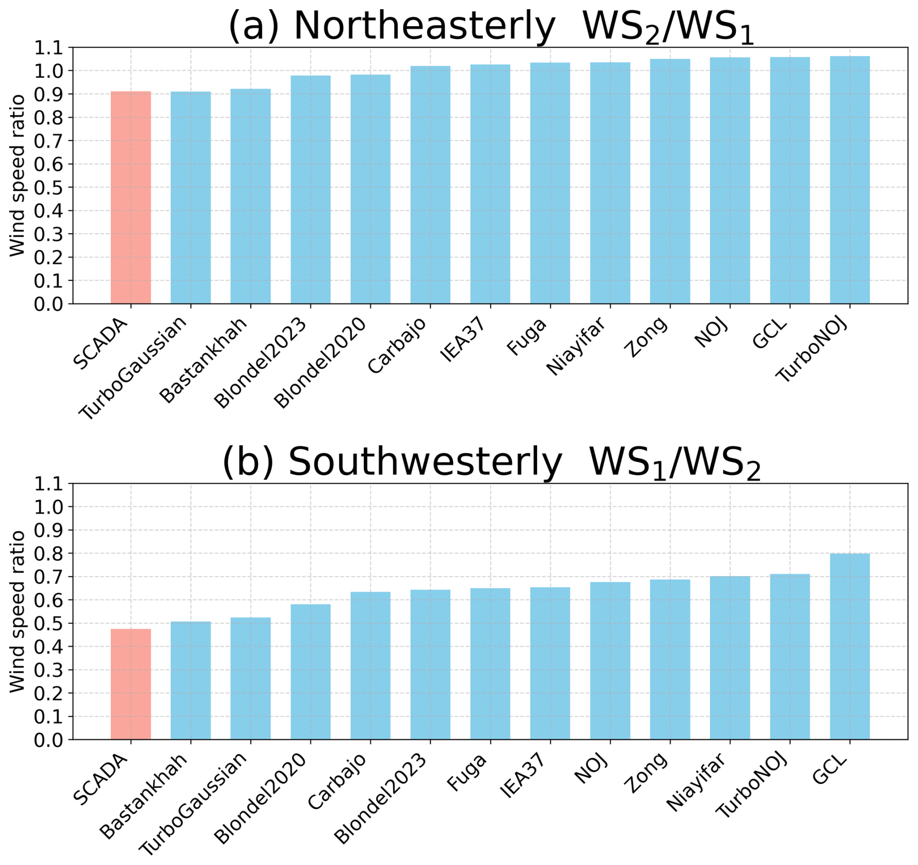 We compare the wind speed ratios derived from the 12 wake models at the inflow wind speeds at 13 m s−1 for northeasterly wind and 8 m s−1 for southwesterly wind (Fig. 12). For both northeasterly wind and southwesterly wind, most of the wake models underestimate the reduction in wind speed and represent weak wakes (Fig. 12a and b). For northeasterly wind, most of the wake models hardly represent the wakes (Fig. 12a), whereas, for southwesterly wind, all of the wake models except the GCL wake model represent a reduction in wind speed ratio (Fig. 12b). Only the Bastankhah and the TurboGaussian wake models closely represent the minimum value of wind speed ratio derived from the SCADA data for both northeasterly wind and southwesterly wind. To summarize the validation results from each wake model, we show the wind speed ratio for 12 wake models for wind directions with a maximum reduction in wind speed ratio for both northeasterly and southwesterly winds in Fig. 13. The order of the wake models according to the difference of the results between each wake model and the SCADA data is almost the same for northeasterly and southwesterly winds (Fig. 13a and b). The results from the TurboGaussian and the Bastankhah wake models are consistent with those from the SCADA data, followed by the Blondel2020 and the Blondel2023 wake models for northeasterly and southwesterly winds. The differences from the SCADA data range from 0.001 to 0.151 for northeasterly wind and from 0.032 to 0.323 for southwesterly wind. The differences among the wake models are more prominent for southwesterly wind than for northeasterly wind.