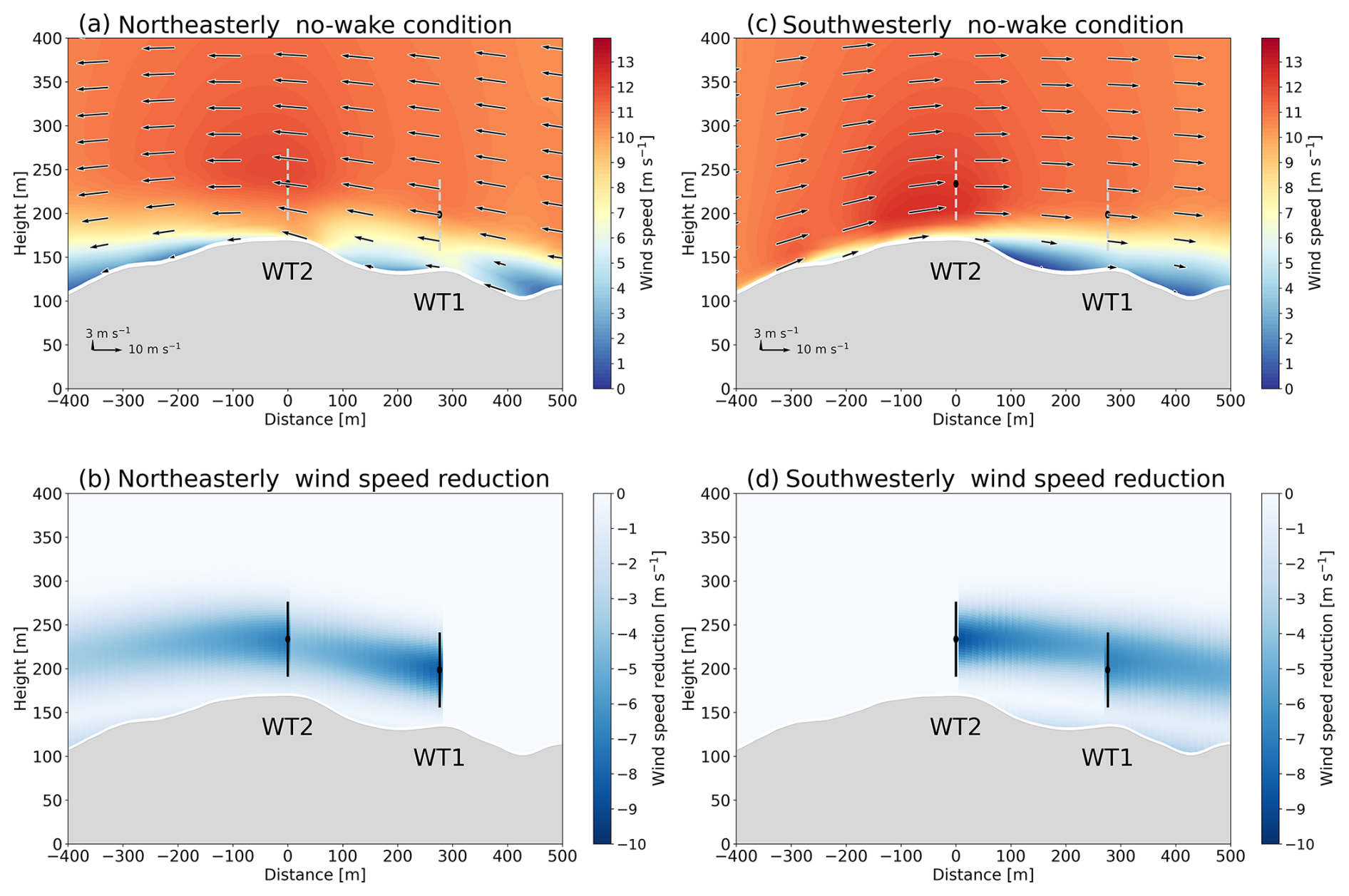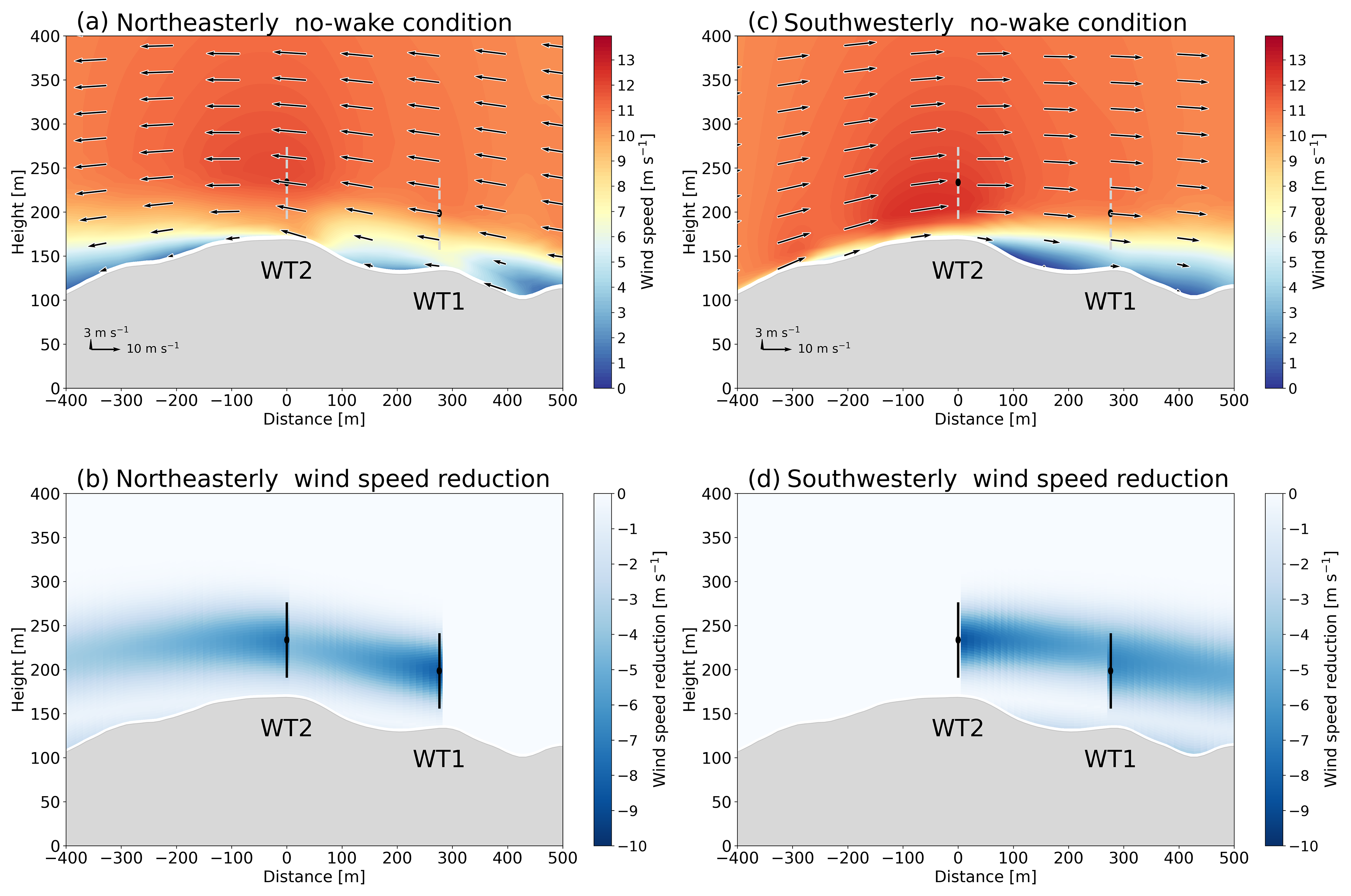 Figure 14Vertical cross-sections along the dashed blue line in Fig. 1 for (a, b) northeasterly wind and (c, d) southwesterly wind with a far-upstream wind speed of 10 m s−1. In (a) and (c), we show horizontal wind speed (color shading) and wind vectors on the cross-section under no-wake conditions, although we show the positions of the wind turbine rotors by means of a dashed gray line. In (b) and (d), we show a reduction in horizontal wind speed (color shading) due to the wind turbine wake simulated by the TurboGaussian wake model. A reduction in horizontal wind speed is the difference between no-wake conditions and wake conditions. The black lines indicate the positions of the wind turbine rotors. The data from WAsP CFD are available from 5 m above ground level.