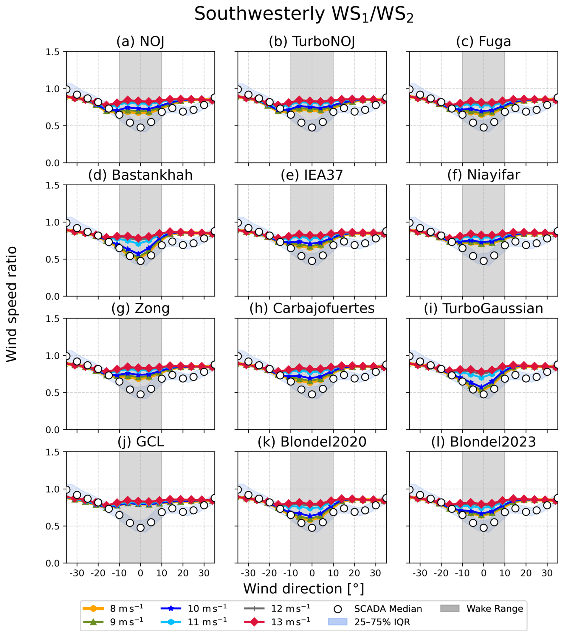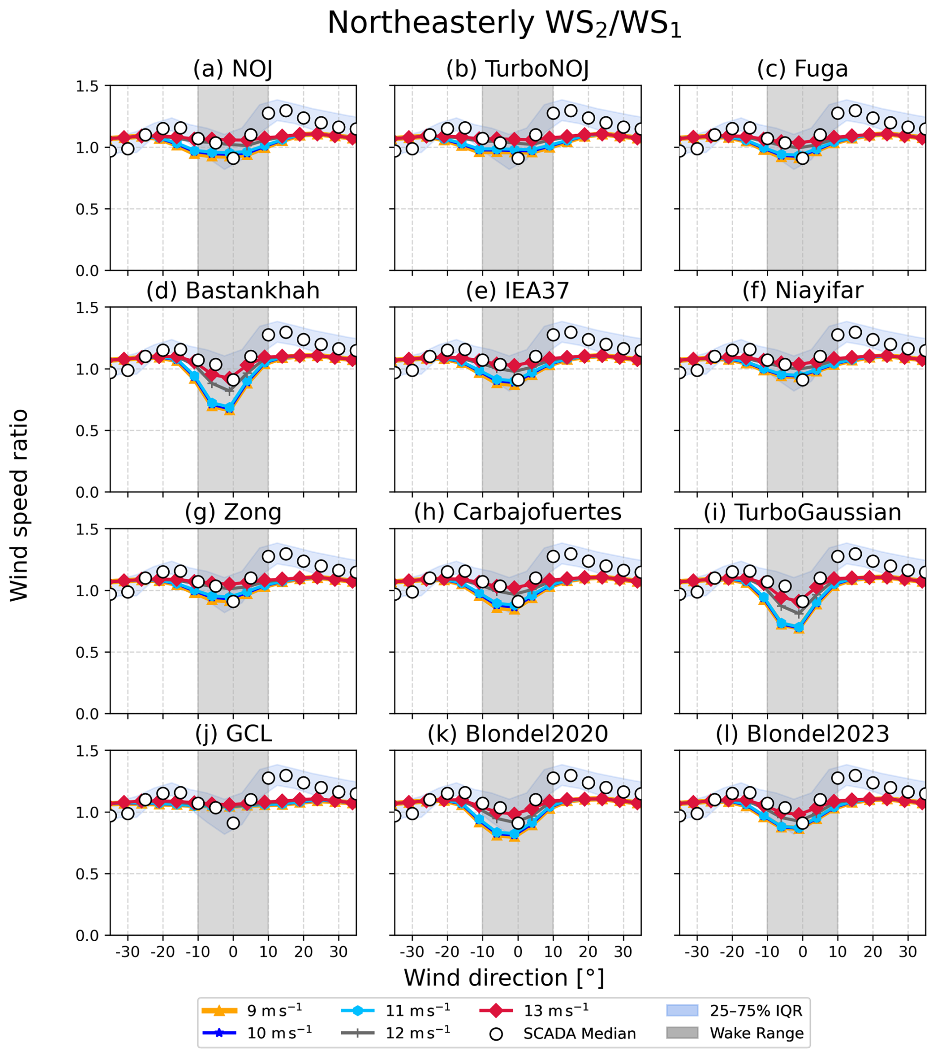Figure B1Wind speed ratio derived from the 12 wake models for northeasterly wind. Colored lines are results derived from each wake model for every 1 m s−1, ranging from 4 to 13 m s−1. The results ranging from 4 to 9 m s−1 are shown by one line. The horizontal axis indicates differences in wind direction, with the minimum wind speed ratio at 0° for both the SCADA data and the results of the wake models. The blue band denotes the interquartile range (IQR) of the SCADA data, and white circles denote median values in every 5° bin. Gray shading indicates the ranges of wind directions with wake effects.