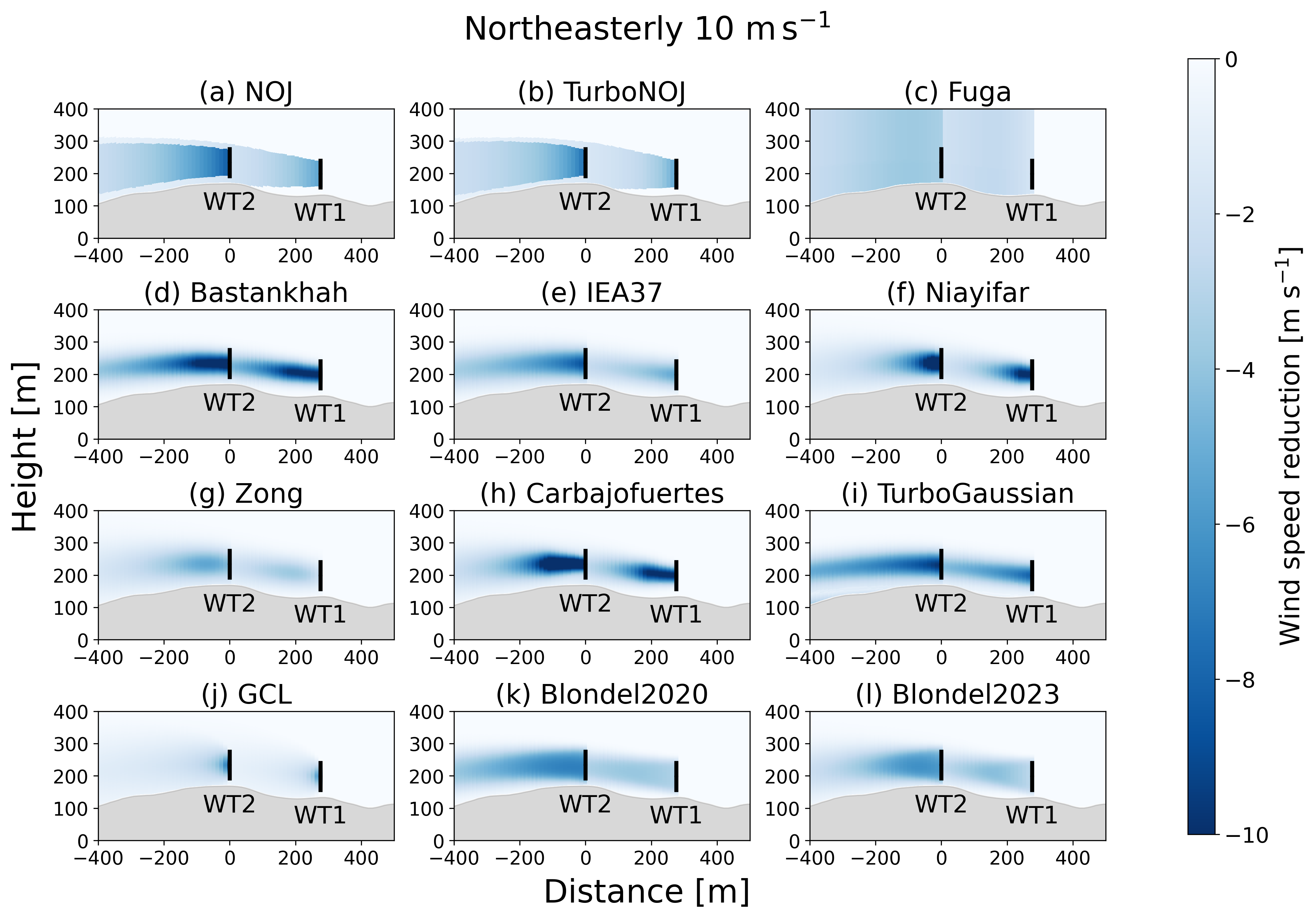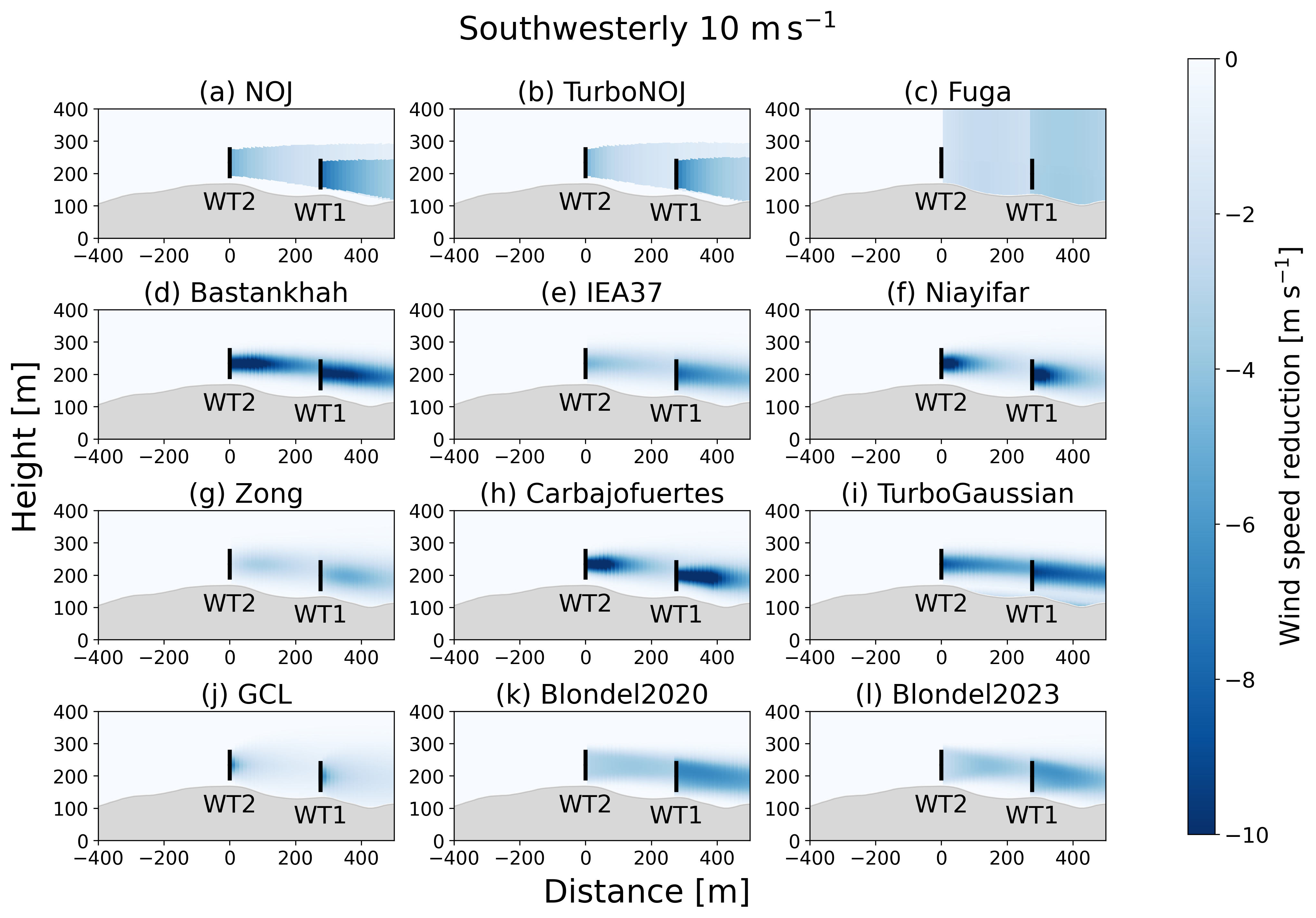We compare the vertical structures of wakes over complex terrain among the 12 wake models for northeasterly wind and southwesterly wind (Figs. C1 and C2). In Figs. C1a and b and C2a and b, the wakes show linear downstream extensions and no vertical variation. The Fuga wake model exhibits the reduction in wind speed outside the rotor areas (Figs. C1c and C2c). The other wake models produce Gaussian-shaped wakes, whereas the simulated results differ in terms of their wake extents and the reduction in wind speed immediately behind the wind turbines. The Bastankhah wake model and the TurboGaussian wake model show that the wakes generated by the upstream wind turbines reach the rotor of the downstream wind turbines without significant attenuation (Figs. C1d, i and C2d, i).