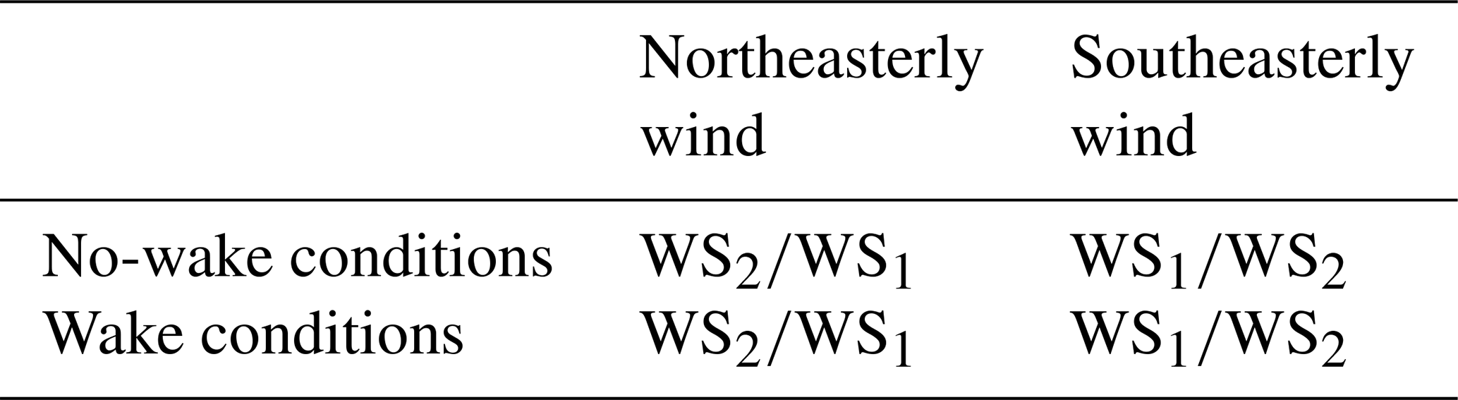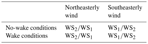 Table 1Definition of wind speed ratio according to the wind directions and the presence or absence of wakes. Note that WS1 and WS2 in the denominator differ between no-wake conditions and wake conditions. Under no-wake conditions, the denominator represents the wind speed when the upstream wind turbine is not in operation. Under wake conditions, the denominator represents the wind speed when the upstream wind turbine is in operation.