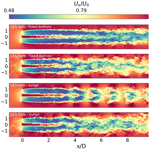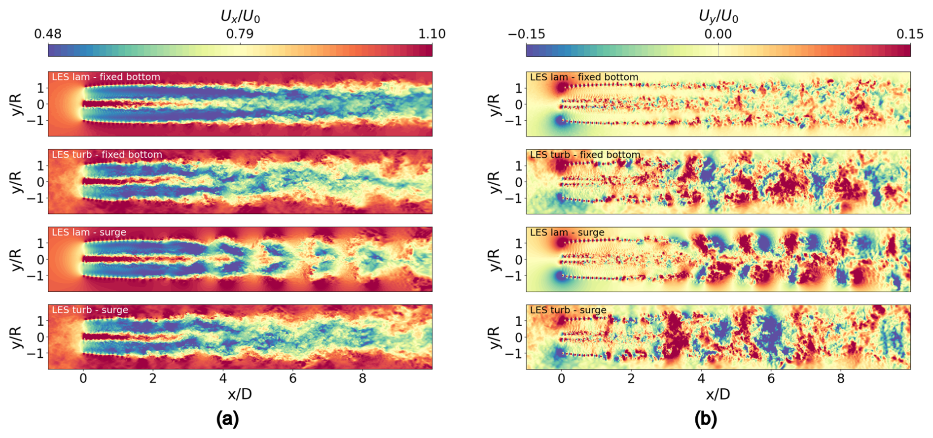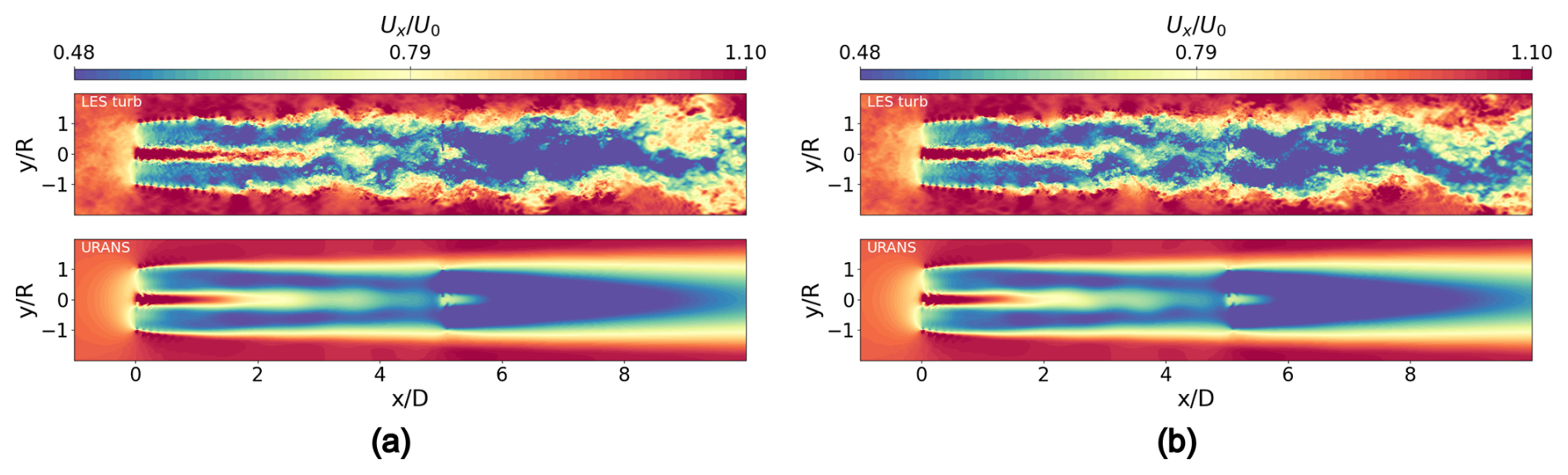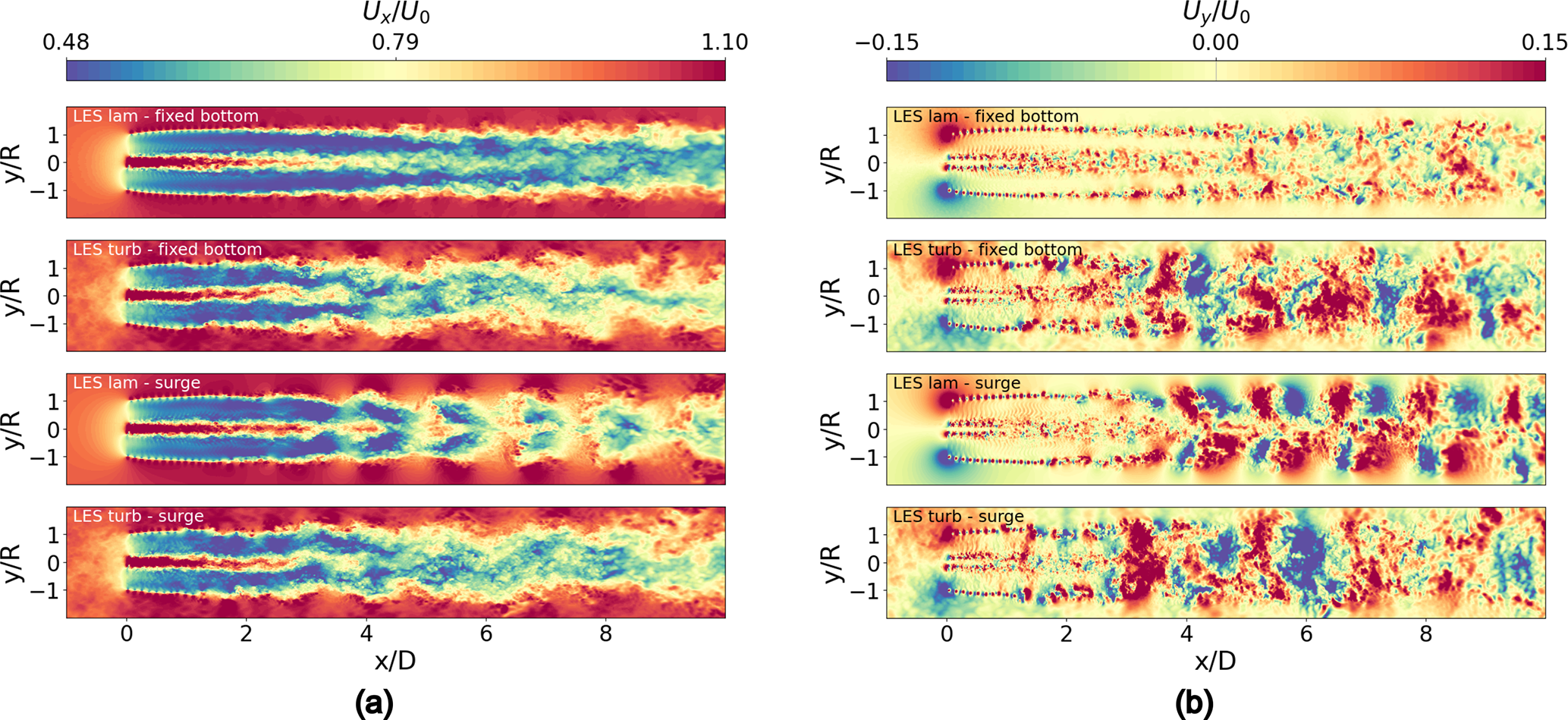 Figure 22 shows the instantaneous streamwise velocity fields on a horizontal plane at hub height for the double-turbine configuration, for both surge (Fig. 22a) and pitch (Fig. 22b) cases. Once again, the comparison between the LES and the URANS calculations highlights their different accuracy in capturing the flow field, particularly regarding the instabilities in the wake of the downstream turbine.