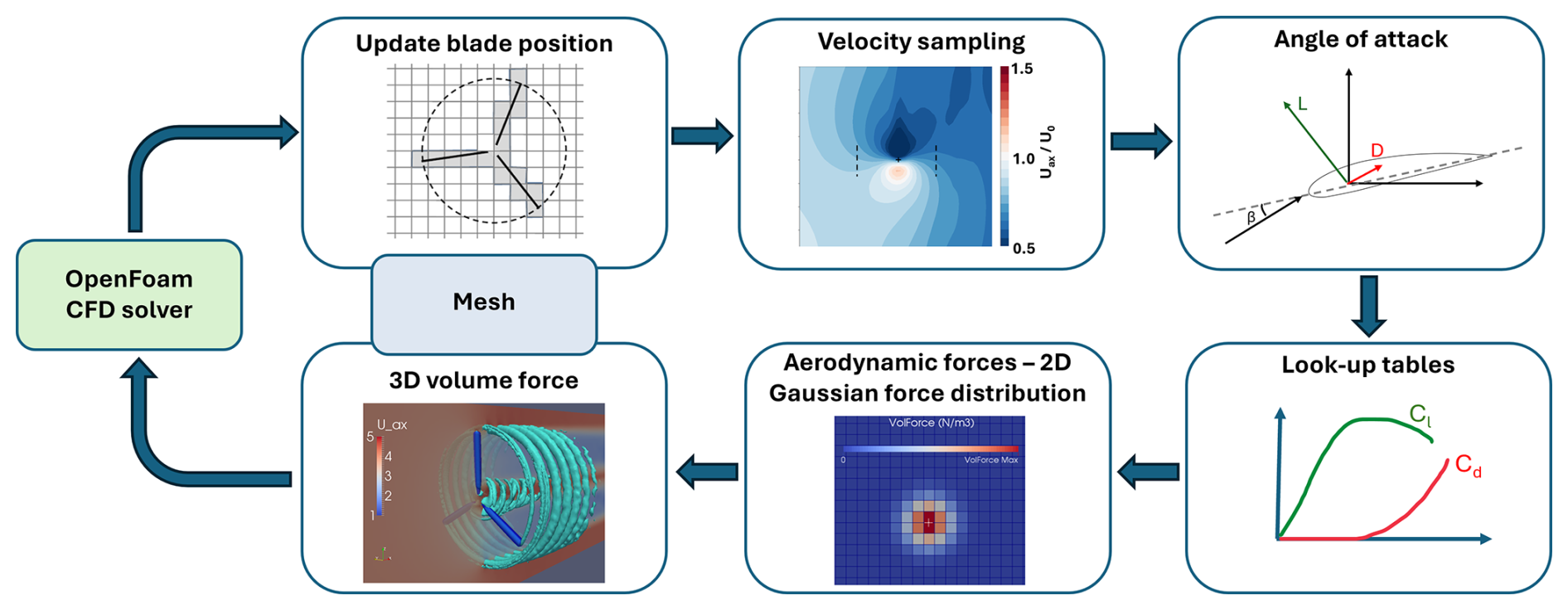 All numerical simulations are carried out using an in-house actuator line model algorithm, developed and implemented within the OpenFOAM CFD framework and previously validated in the URANS formulation in Sanvito et al. (2024a). The simulation focuses exclusively on the three rotor blades, which are modelled as actuator lines comprising 75 actuator points where aerodynamic forces are applied. Figure 2 illustrates the flowchart of the methodology employed by the coupled CFD–ALM solver.