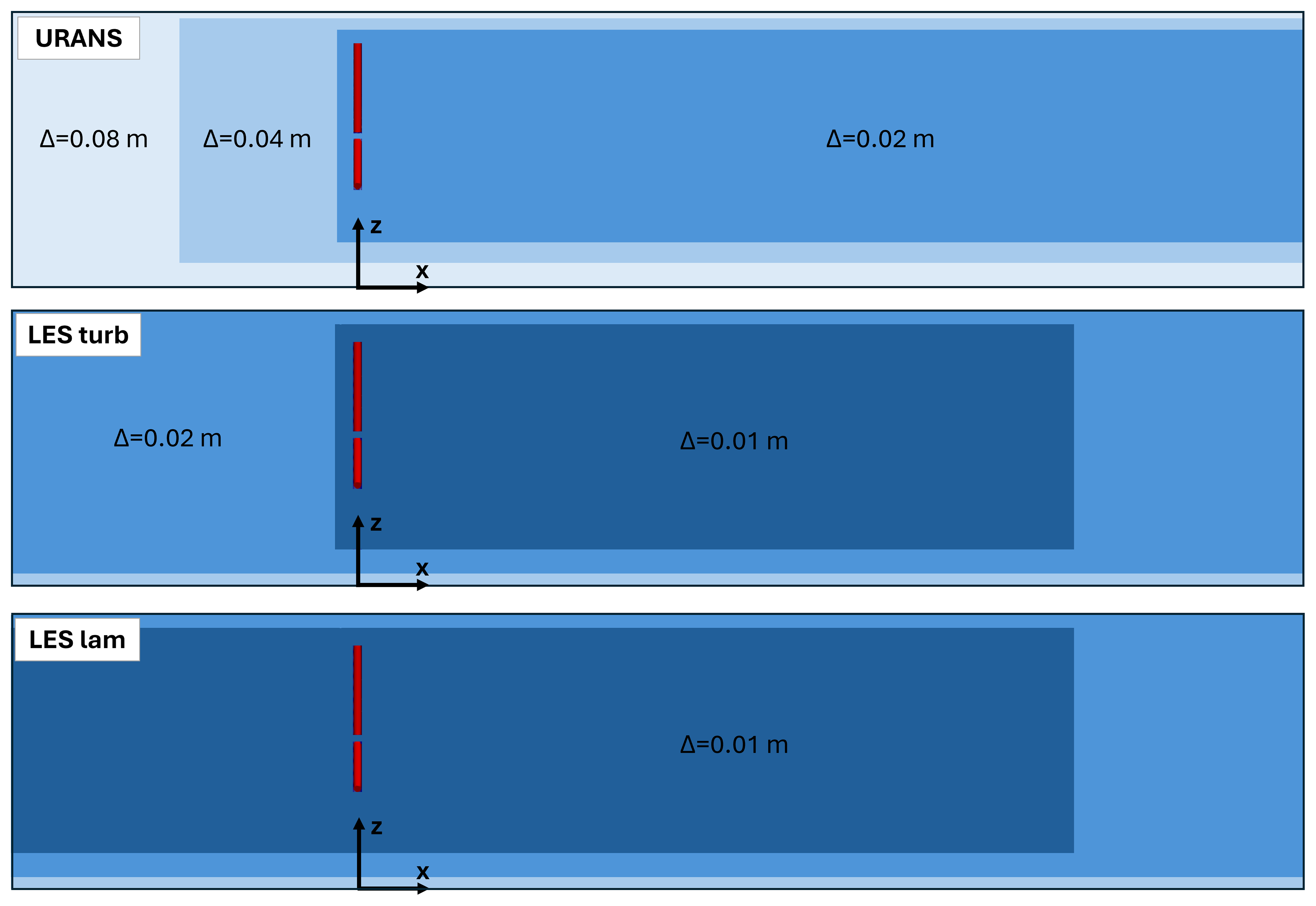 Due to the different characteristics of the turbulent approaches considered, different mesh resolutions are employed, namely a coarser mesh for the URANS simulation and a refined mesh for the LES cases. For the URANS simulation, a structured Cartesian mesh is adopted, consisting of approximately 20 million hexahedral cells. A grid sensitivity analysis, documented in Sanvito et al. (2024a), was performed to assess mesh independence. In the rotor region, a characteristic cell size of Δ=0.02 m was imposed through the superposition of two cylindrical refinement zones. An additional verification of the wake resolution was carried out by considering a mesh with a characteristic cell size reduced by 25 %, confirming that the results are grid independent. Therefore, the mesh with Δ=0.02 m was selected. A zoomed-in view of the rotor region on the vertical plane passing through the rotor hub, together with the corresponding cell size, is shown in Fig. 3. The turbulent LES requires a higher resolution to ensure that at least 80 % of the total turbulent kinetic energy (TKE) is resolved. To meet this criterion, a finer background mesh is used, along with two cylindrical refinement zones. The second refinement zone, with Δ=0.02 m, extends up to the domain inlet to mitigate numerical turbulence decay. The final mesh comprises approximately 113.2 million cells, with the most refined region having a characteristic cell size of Δ=0.01 m, corresponding to a non-dimensional resolution of . This level of refinement is consistent with values reported in the literature, such as Nilsson et al. (2015) () and Churchfield et al. (2017) and Blaylock et al. (2022), who employ . For the laminar LES, the same mesh as the turbulent LES case is used, with the extension of the third refinement region (Δ=0.01 m) to the inlet. This adjustment is introduced to suppress artificial numerical fluctuations at the inflow. As a result, the total cell count increases to approximately 150.9 million cells.