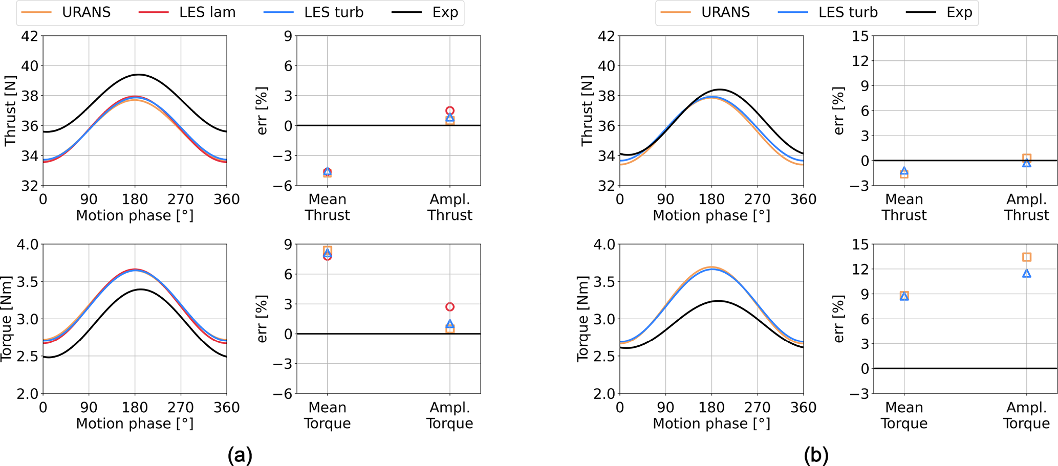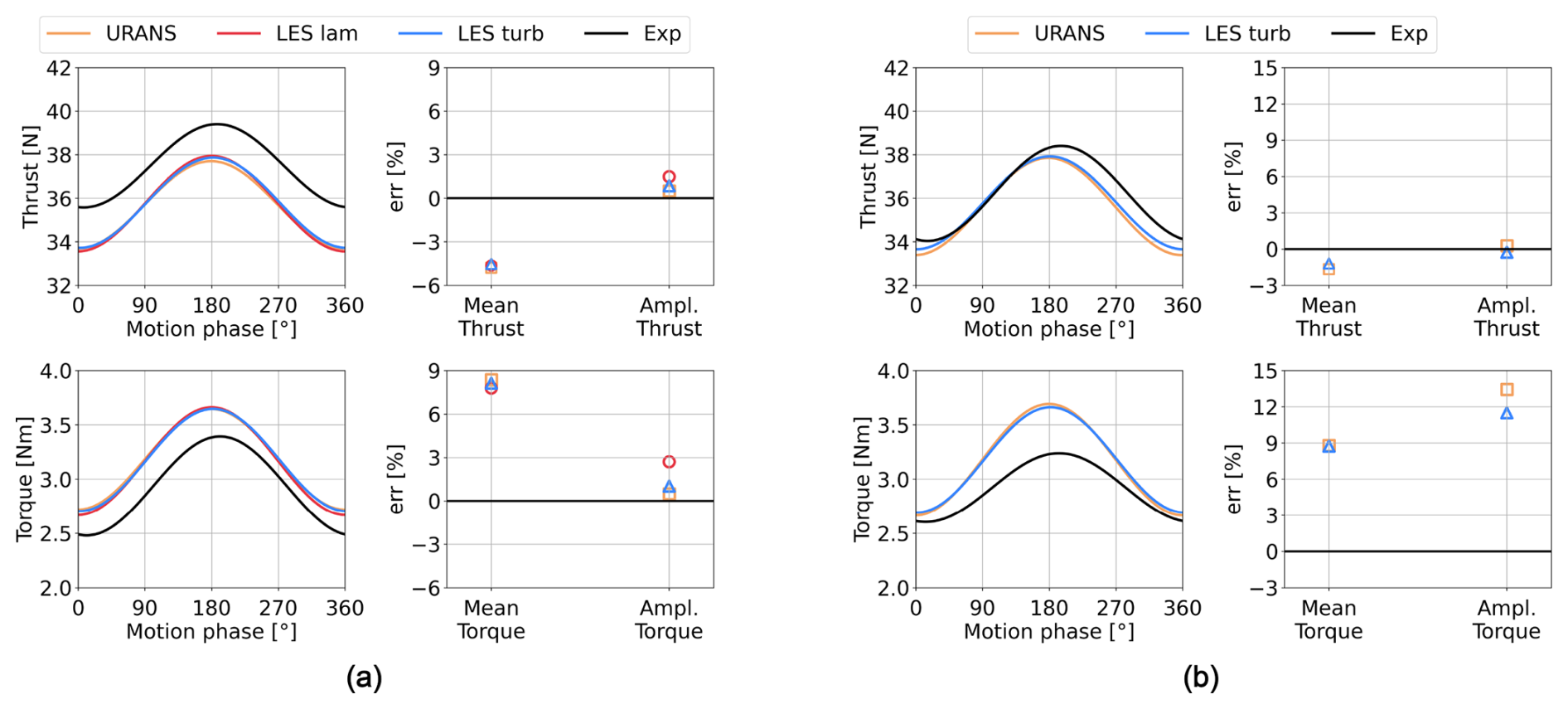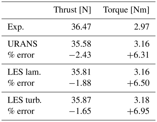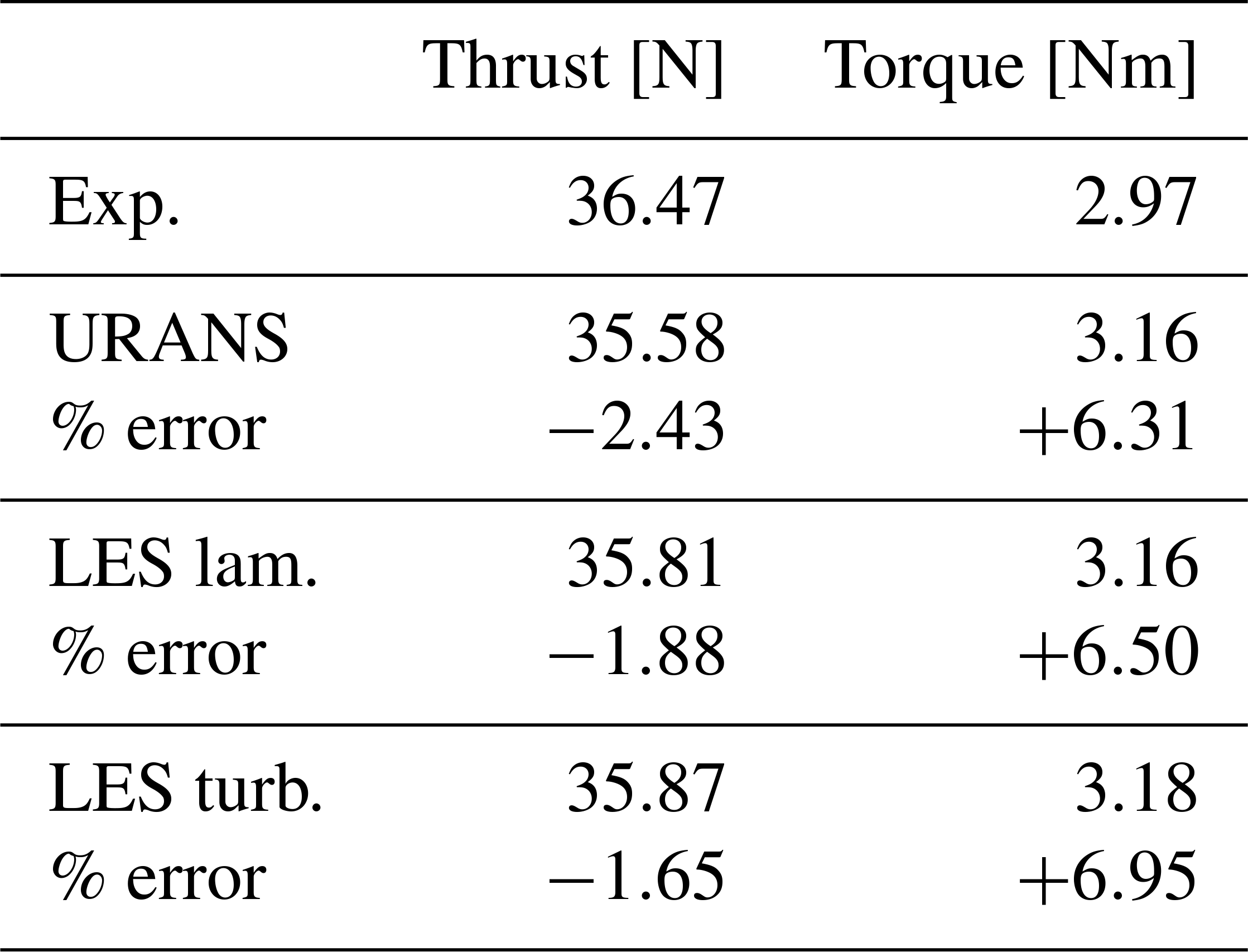 Overall, the numerical results show good agreement with the experimental data, with a slight underestimation of thrust and an overestimation of torque. In any case, the numerical results are consistent with numerical counterparts, indicating good numerical robustness of the ALM when combined with the different computational approaches.
