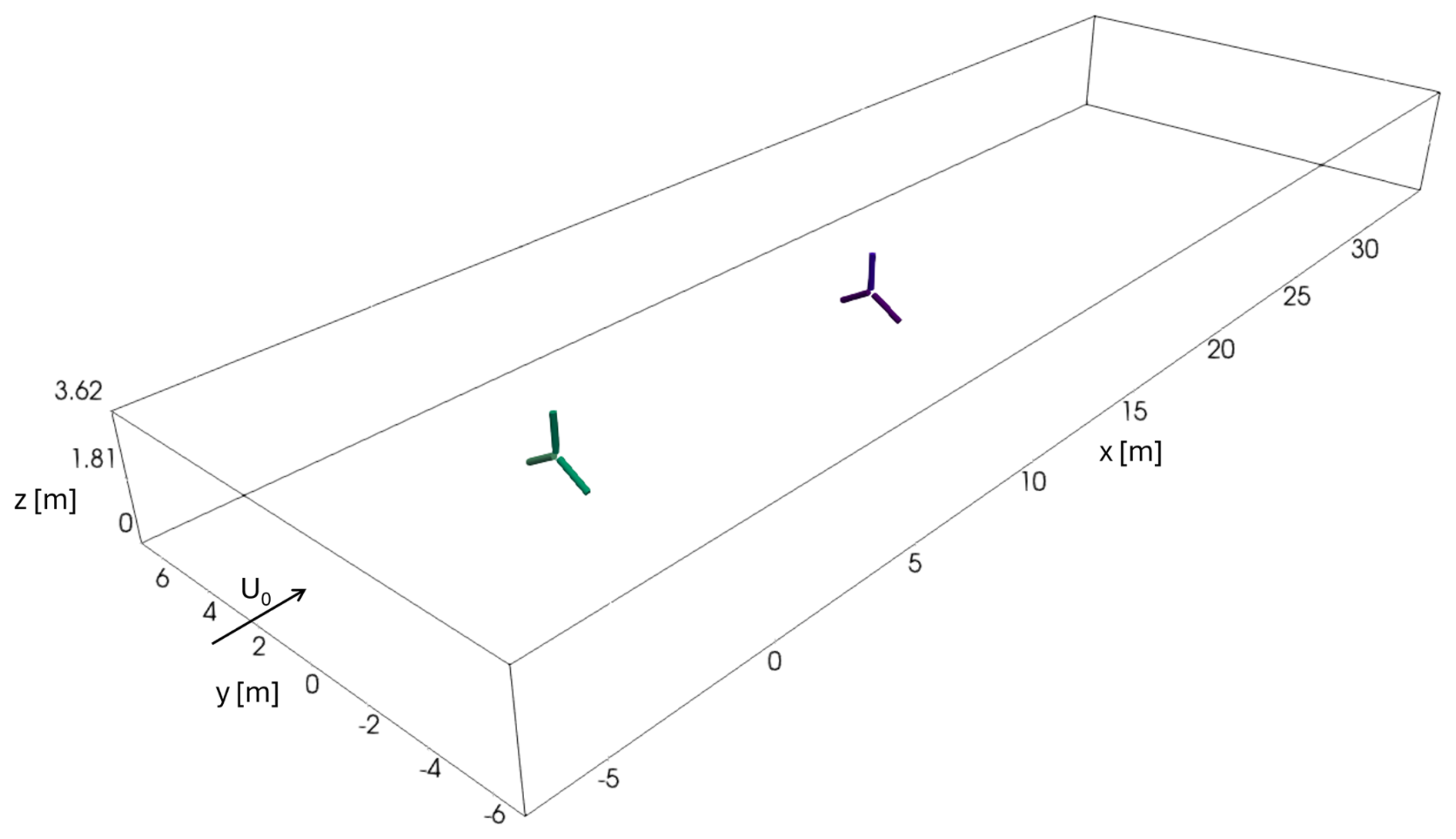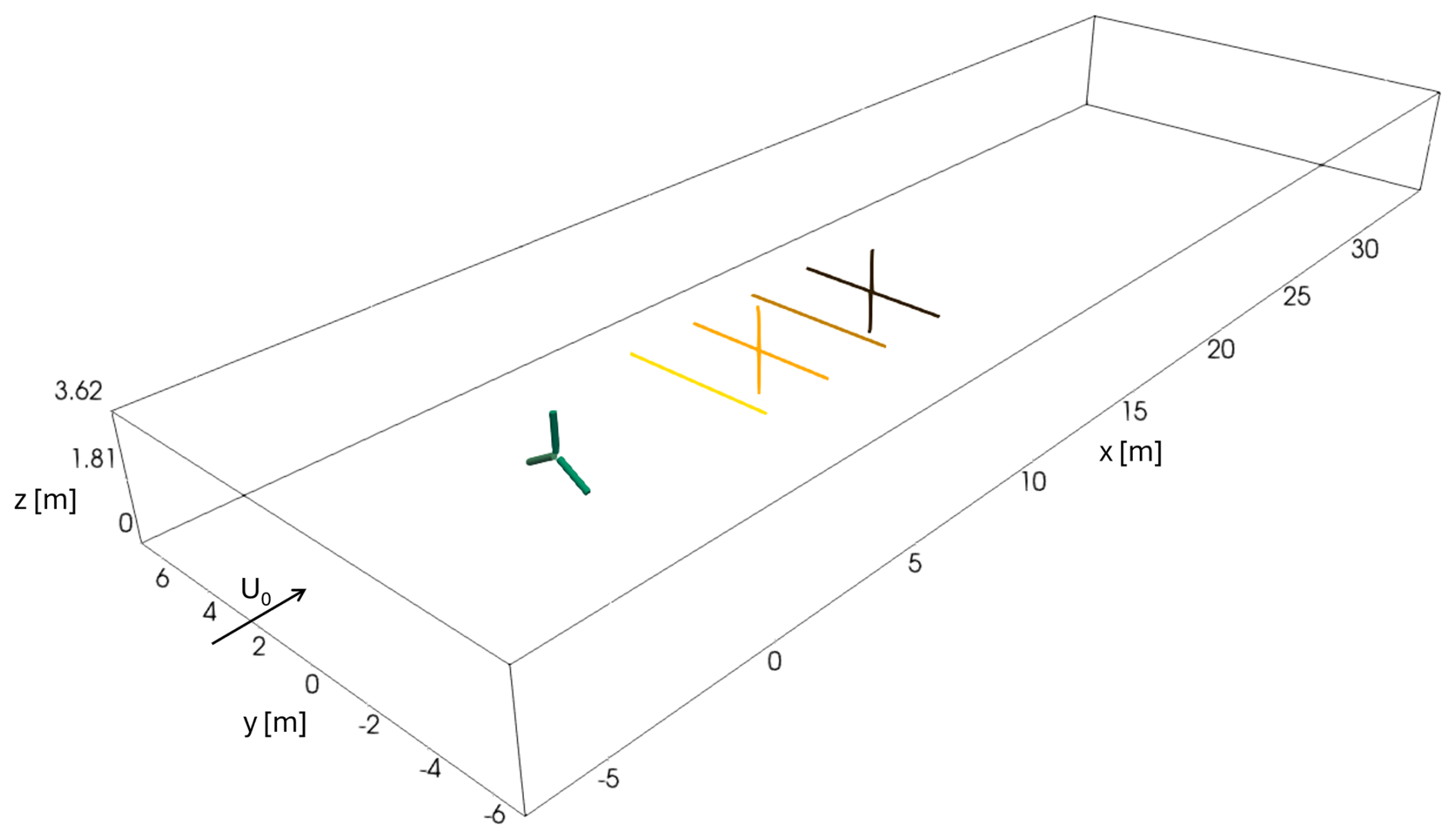 The time step is chosen to limit the actuator line tip displacement to about one cell per step, ensuring numerical stability and accurate force application. Consequently, a time step of is employed throughout the simulations. Considering the definition of the Courant number , where is the magnitude of the flow velocity in the cell, Δt is the time step, and Δeff is the characteristic cell size, the chosen time step results in a maximum Courant number of 0.54.