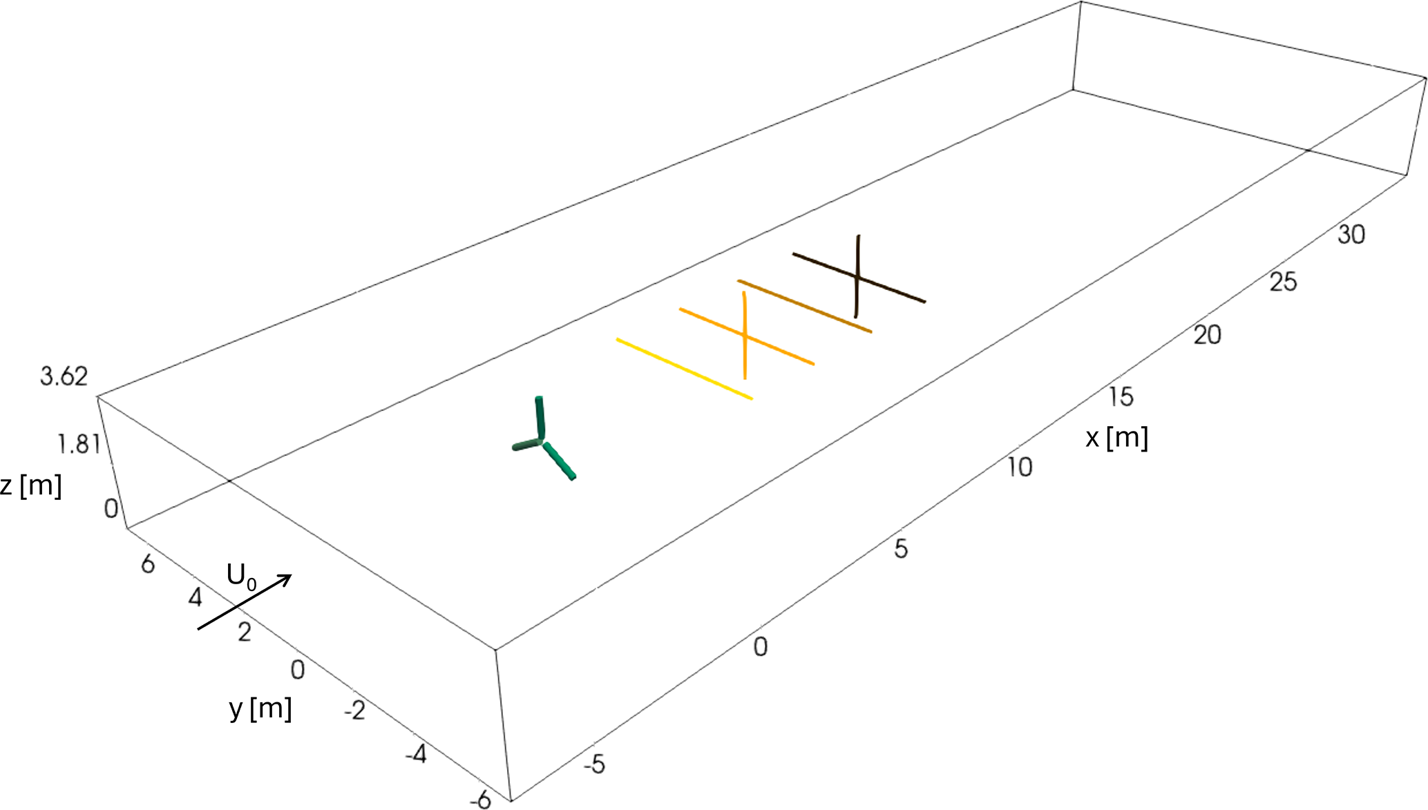 To this end, the following sections analyse various flow quantities sampled along selected lines positioned in the wake. Specifically, horizontal lines located at hub height and placed at downstream distances of 2 D, 3 D, 4 D, and 5 D are used, as well as vertical lines aligned with the rotor axis at 3 D and 5 D. The computational domain, actuator lines, and wake sampling lines are illustrated in Fig. 5.