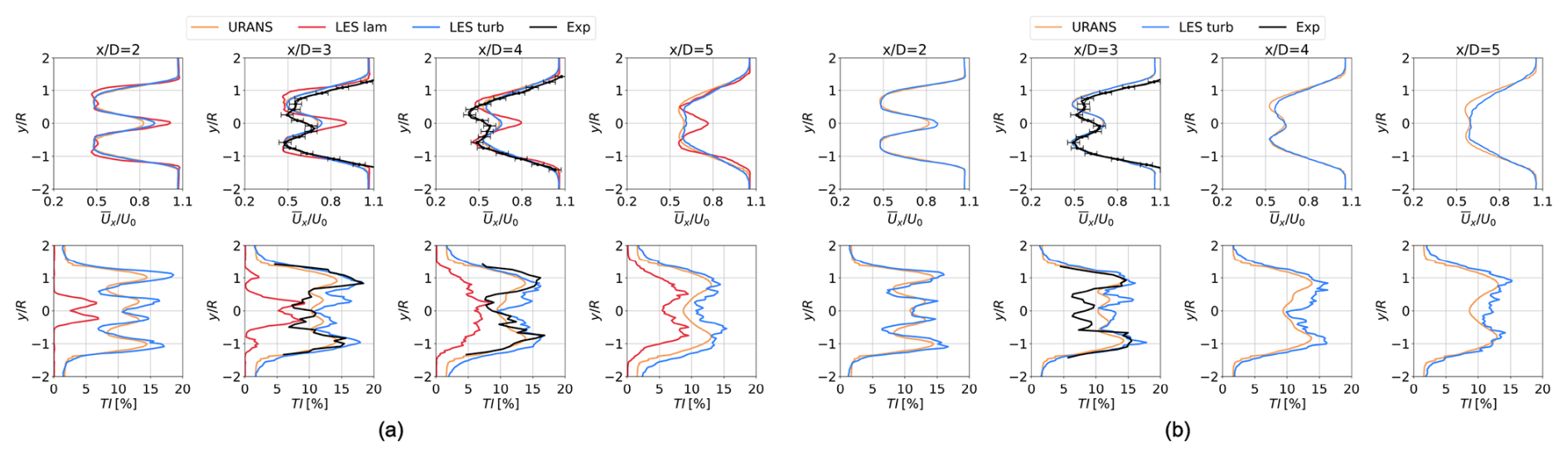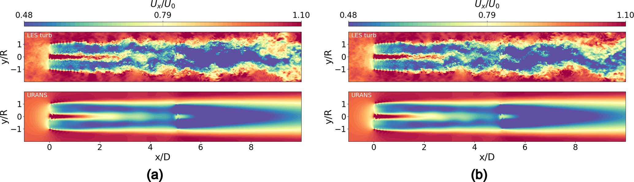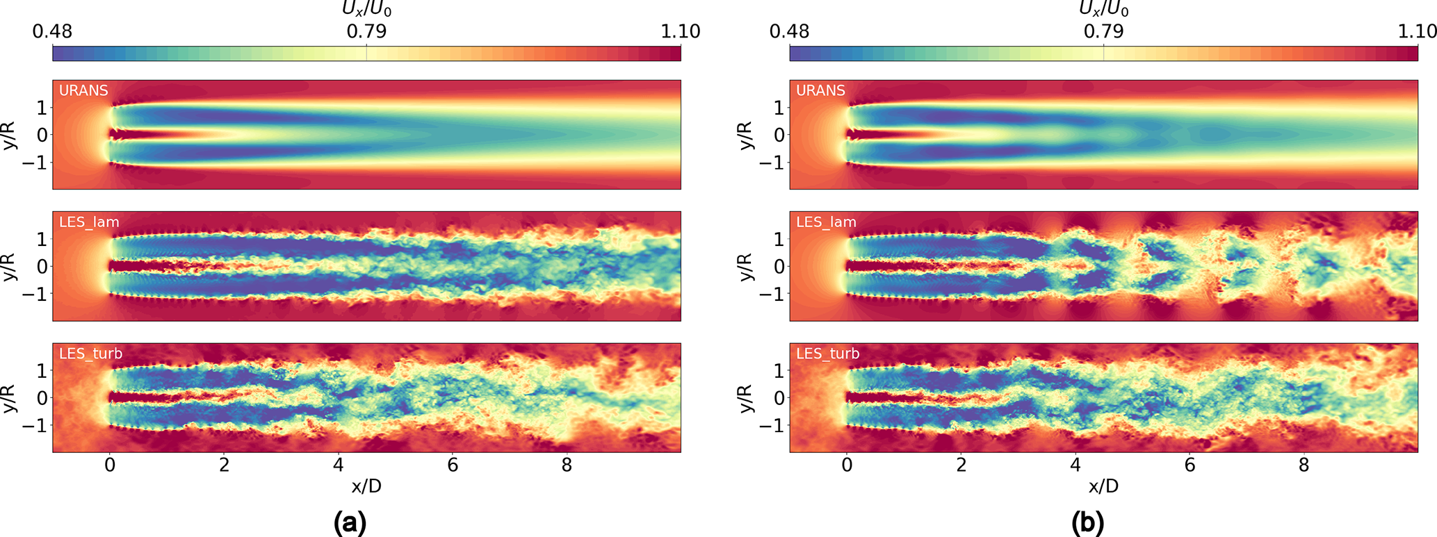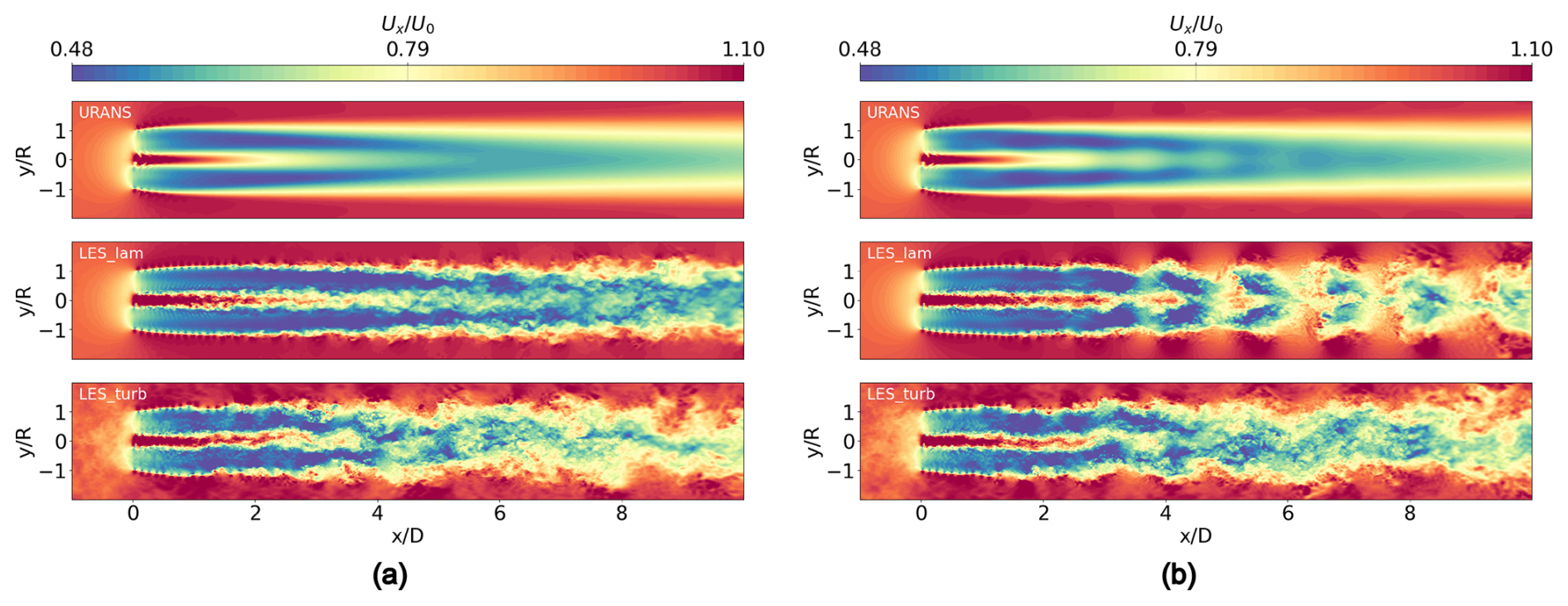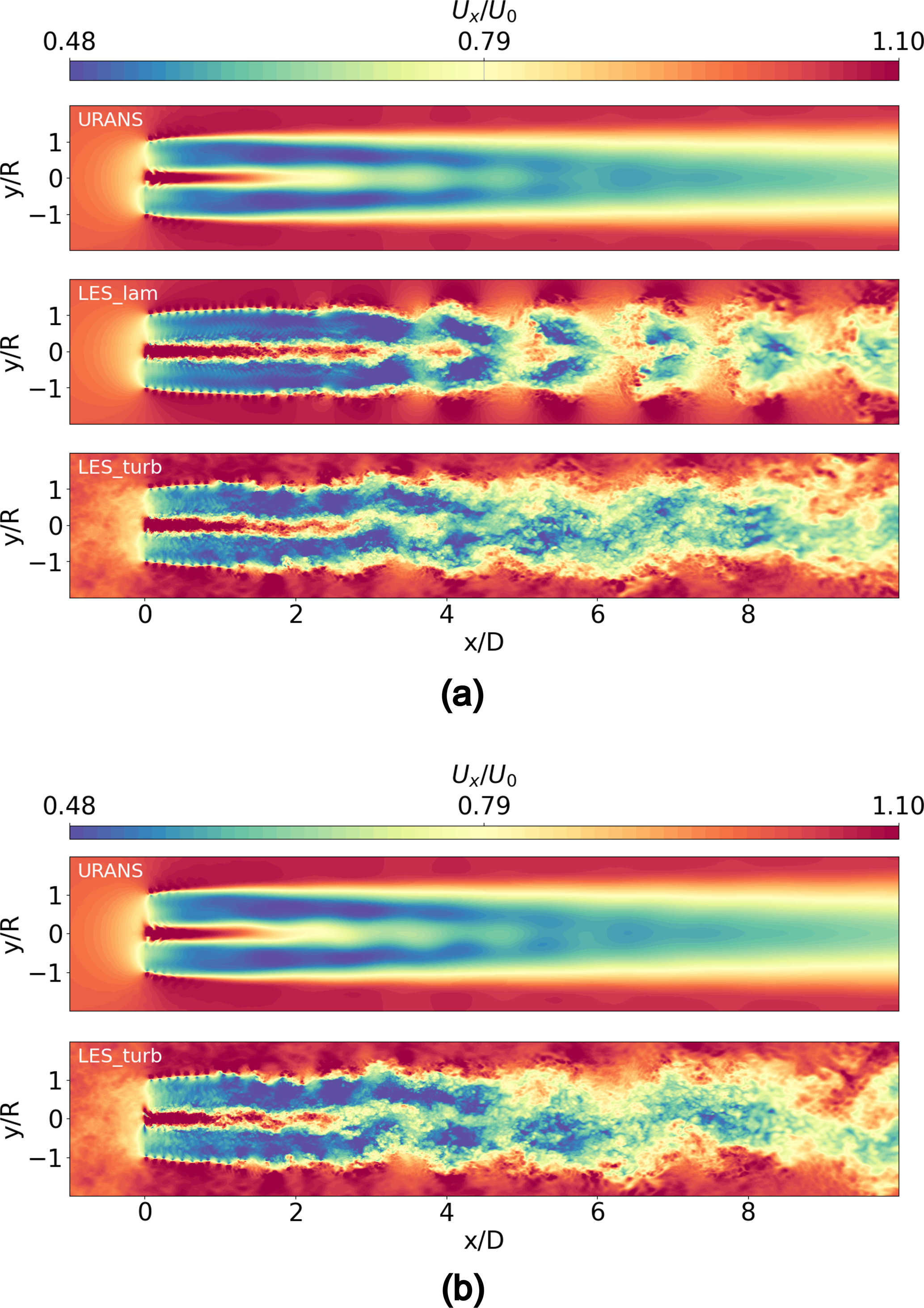 Figure 9Wake recovery analysis. (a) Comparison between laminar and turbulent LES. (b) Comparison between turbulent LES and URANS.