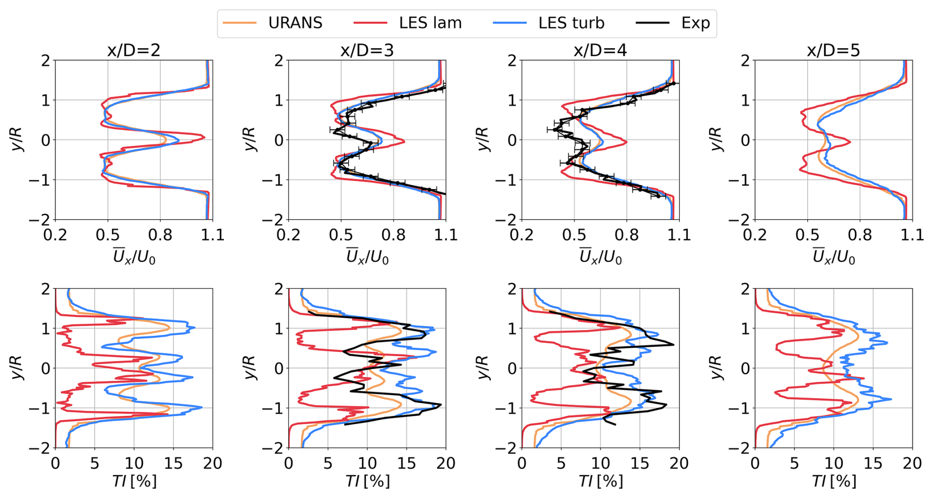 The figure shows that the laminar LES underestimates the turbulence intensity in the wake, which limits wake recovery and results in greater discrepancies in the mean velocity profile. In contrast, both the URANS and the turbulent LES calculations show better agreement with each other and with the experimental data in terms of mean velocity profiles. Regarding the turbulence intensity, although URANS provides reasonably accurate averaged values, the turbulent LES more accurately captures the local distribution, especially further downstream from the turbine.