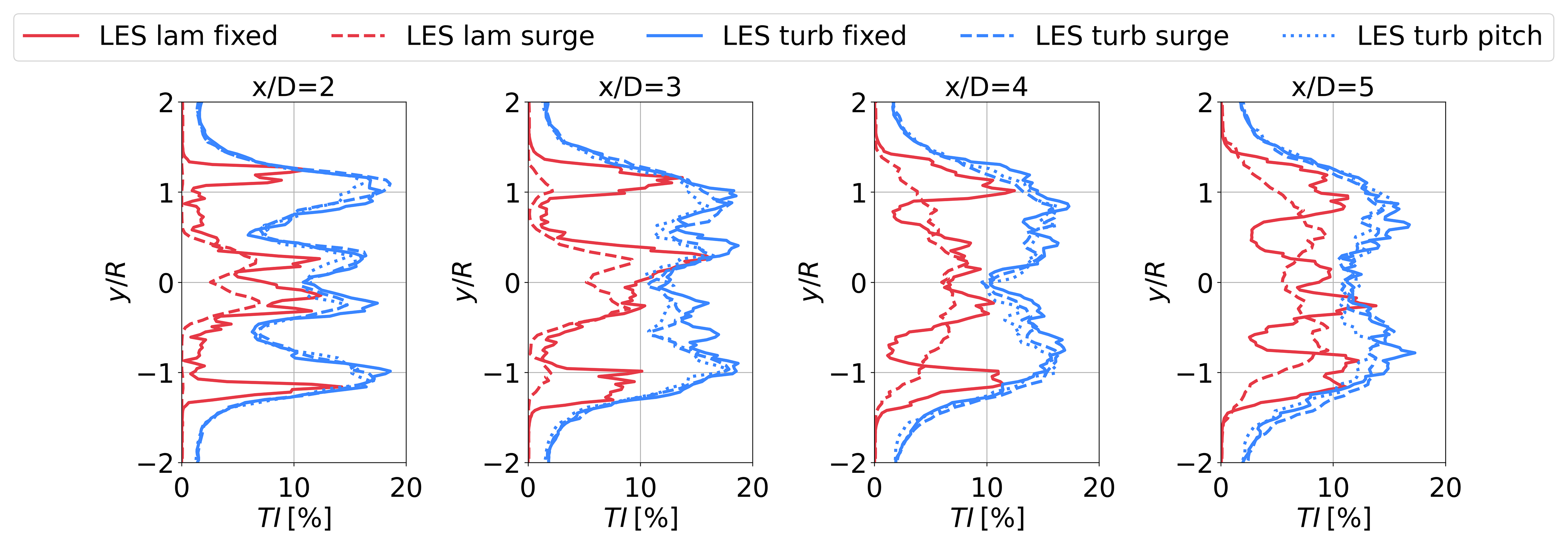 In particular, Fig. 8 presents TI profiles along several horizontal lines, comparing laminar and turbulent LES cases to highlight their capability to resolve the largest turbulent structures. In addition to the laminar and turbulent fixed-bottom cases (solid lines), the laminar and turbulent surge cases (dashed lines) and the turbulent pitch case (dotted lines) are included. The comparison of the laminar cases is especially useful to isolate the contribution of added turbulence generated by rotor platform motion. The figure indicates that, from 4 D downstream onward, surge motion promotes a more uniform TI distribution, thereby enhancing turbulence intensity within the wake core. When turbulent inflow is introduced, however, the differences between the fixed-bottom and floating cases become less pronounced. This indicates that the increase in turbulence caused by platform motion, which is clearly non-negligible in laminar cases, almost vanishes even with a modest level of inflow turbulence. For the cases analysed, no significant difference is observed between the effects of pitch and surge motion under turbulent inflow conditions.