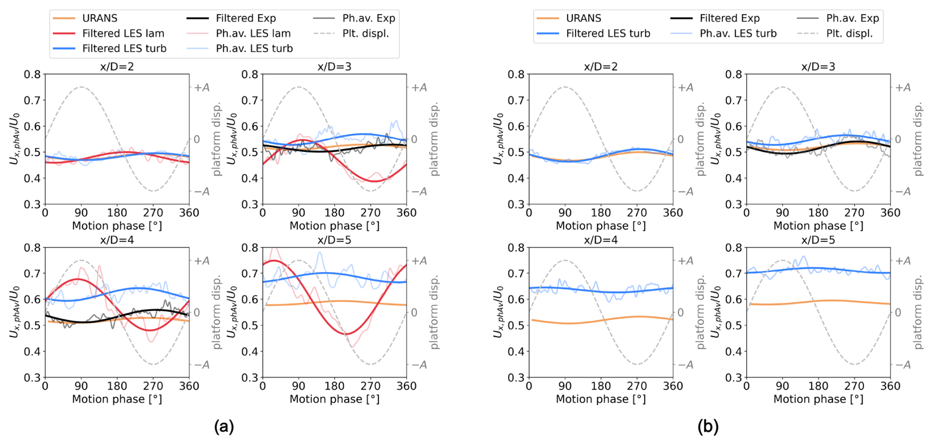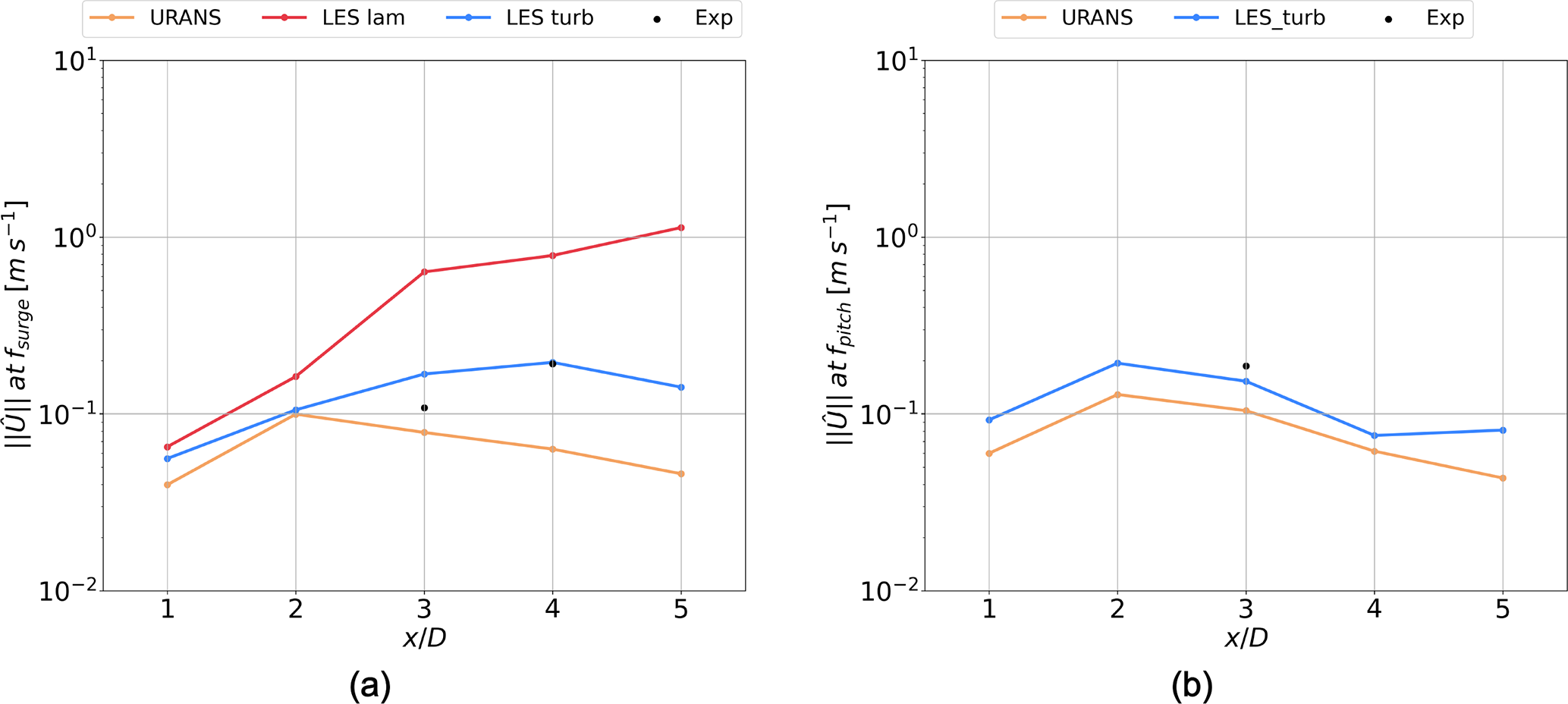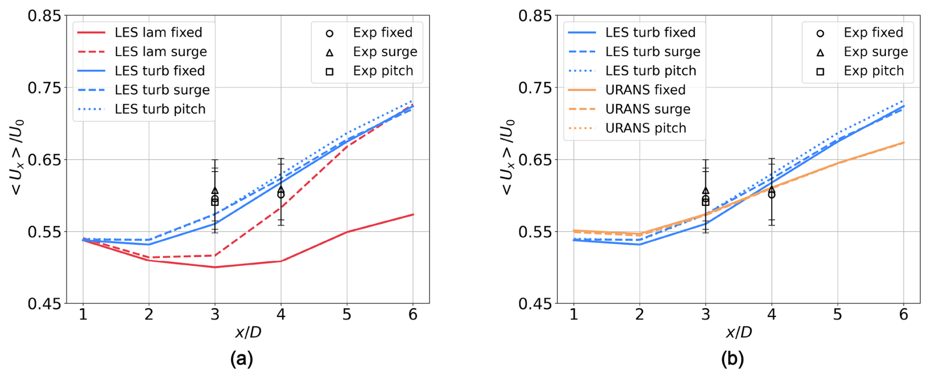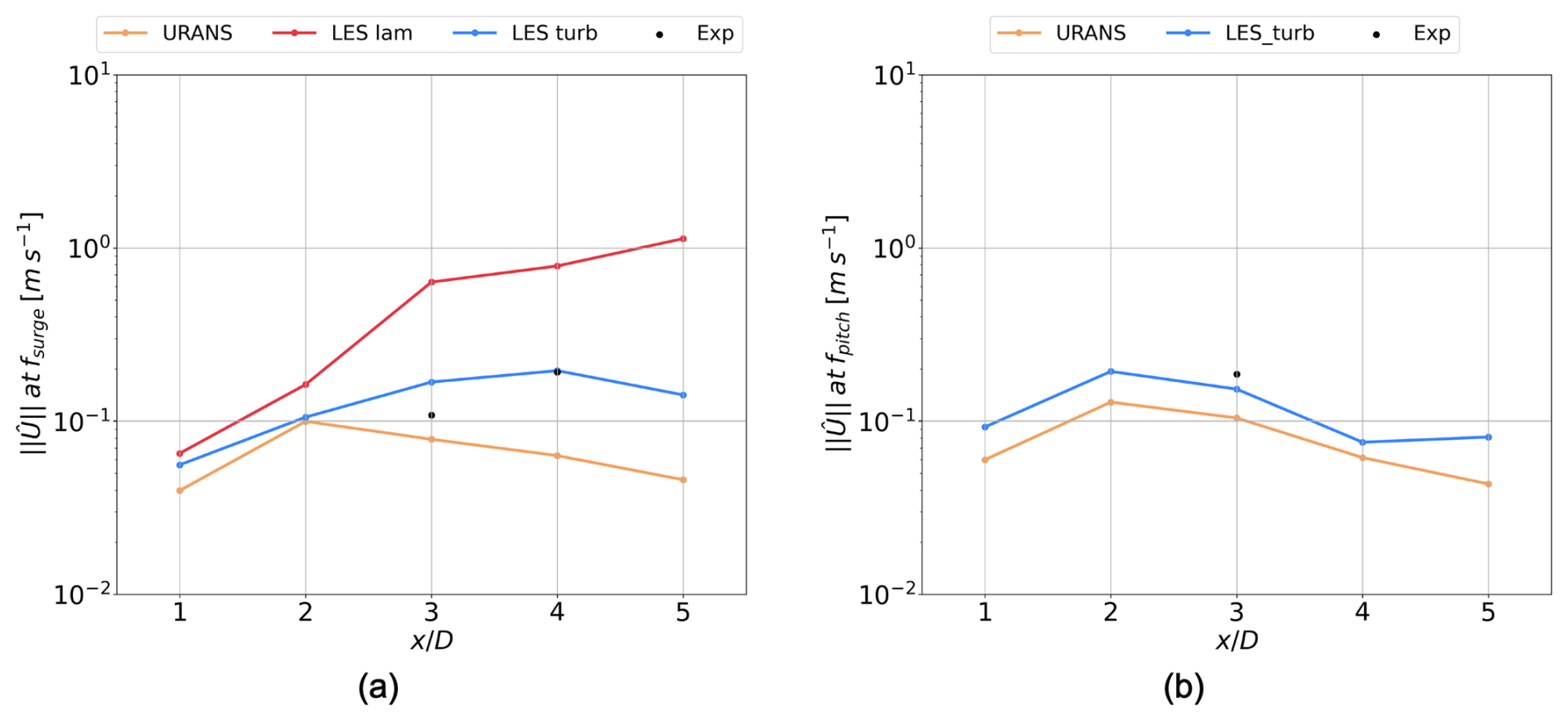 Figure 11 presents a quantitative analysis of the amplitude, at the point , of the filtered phase-averaged streamwise velocity signal previously discussed. In the surge case (Fig. 11a), the laminar LES demonstrates that the absence of inflow turbulence leads to an amplification of wake oscillation amplitude, which remains rather large even at 5 D downstream of the rotor. After the downstream position at 2 D, where wake fluctuations become more prominent, the URANS simulation increasingly underestimates the oscillation amplitude compared to the turbulent LES, likely due to the different turbulence model. The turbulent LES, on the other hand, shows good agreement with the experimental data. For the pitch case (Fig. 11b), a slightly more pronounced reduction in amplitude is observed from 4 D downstream; however, once again, the URANS simulation is found to underestimate the amplitude.