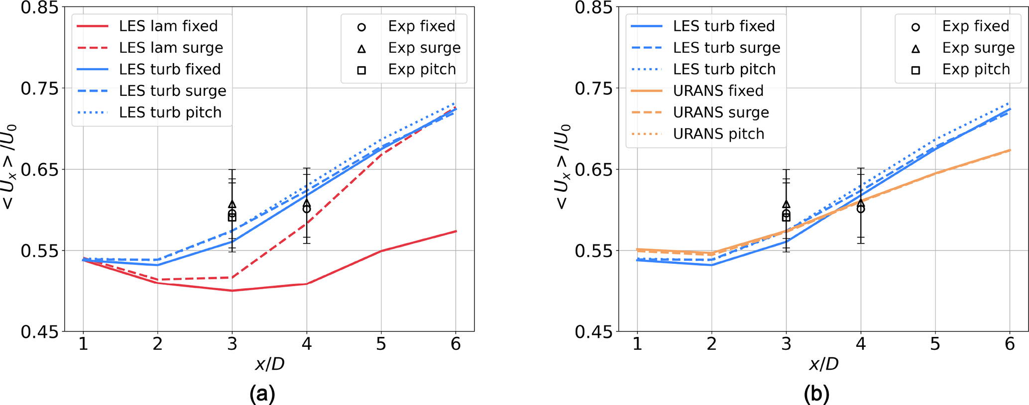 The velocity is first time averaged at each point along the horizontal line and subsequently subjected to a weighted average based on the distance of each point from the rotor centre (Eq. 5). To complete the analysis, the available experimental data are presented together with the corresponding measurement uncertainties. The resulting numerical trend aligns well with the turbulence intensity behaviour discussed above. In laminar inflow cases, surge motion leads to a noticeable increase in turbulence intensity, which enhances wake mixing and thus accelerates wake recovery. Under turbulent LES, the wake recovery is already promoted by inflow turbulence so that the gain in the wake recovery capability in the presence of surge motion is mitigated with respect to the laminar cases. Again, the wake recovery observed in the pitch case is consistent with that of the surge case. The turbulent LESs lie within the experimental measurement uncertainty, and the experimental data further confirm that only minor differences are observed between the fixed-bottom, surge, and pitch cases. These findings are in line with previous results reported by Pagamonci et al. (2025) and Li et al. (2024), further supporting the physical reliability of the numerical simulations carried out in this study. Figure 9b shows the wake recovery comparison between turbulent LESs and URANS simulations for the fixed-bottom, surge, and pitch cases. In the URANS results, a slower wake recovery is observed starting from 3 D downstream, leading to differences in the estimated inflow velocity at a downstream turbine. Among the various URANS cases, the differences are negligible.
