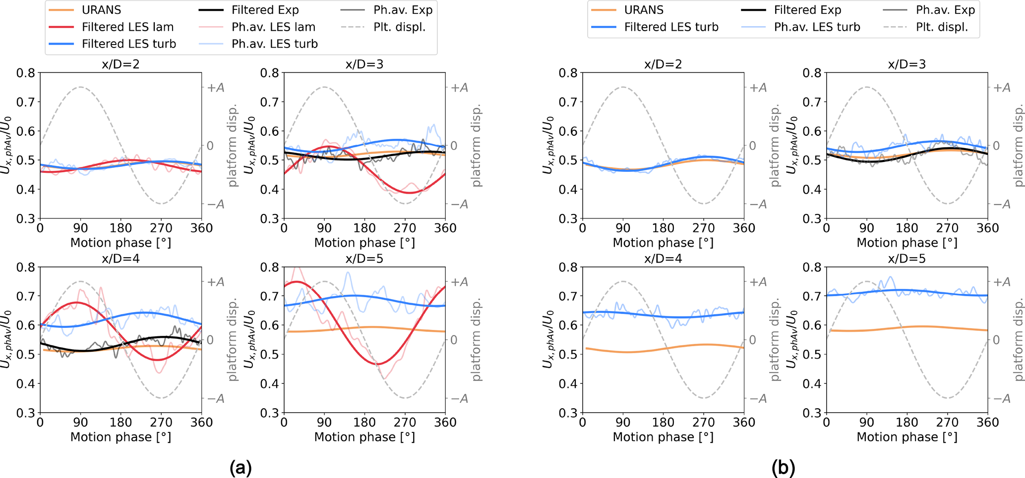 Figure 10 analyses the velocity fluctuations at a representative point in the wake, located at . Specifically, the analysis is conducted at this same coordinate across various streamwise positions () downstream of the rotor. For each () location, the streamwise velocity signal was first examined to identify a time window in which the wake statistics (mean and standard deviation) had reached convergence. Within this window, the phase-averaged velocity was then computed using an increasing number of platform motion cycles, and the number of cycles was selected once the phase-averaged trend showed convergence. Figure 10 shows the phase-averaged streamwise velocity as a function of the platform motion phase, together with the corresponding platform motion of the turbine (dashed grey line) as a reference. For both the LES and the experimental data, the original phase-averaged trends (semi-transparent solid lines) are shown together with the filtered trends (solid lines) to highlight the sinusoidal pattern at the same frequency as the platform motion. Figure 10a shows the results for the surge case. Focusing on a fixed numerical model (e.g. the turbulent LES), a noticeable phase shift emerges with increasing distance from the rotor due to wake-propagation effects. At 2 D, a phase shift appears in both the URANS simulation and the turbulent LESs relative to the laminar LES case: the URANS and turbulent LES results exhibit a phase shift of approximately 180° with respect to the platform displacement, whereas the laminar LES shows a shift of about 90°. This behaviour indicates that the absence of inflow turbulence alters the development and advection of the motion-induced coherent wake structures starting from the near wake; indeed, a phase-shift difference for the laminar LES remains visible across all downstream positions.