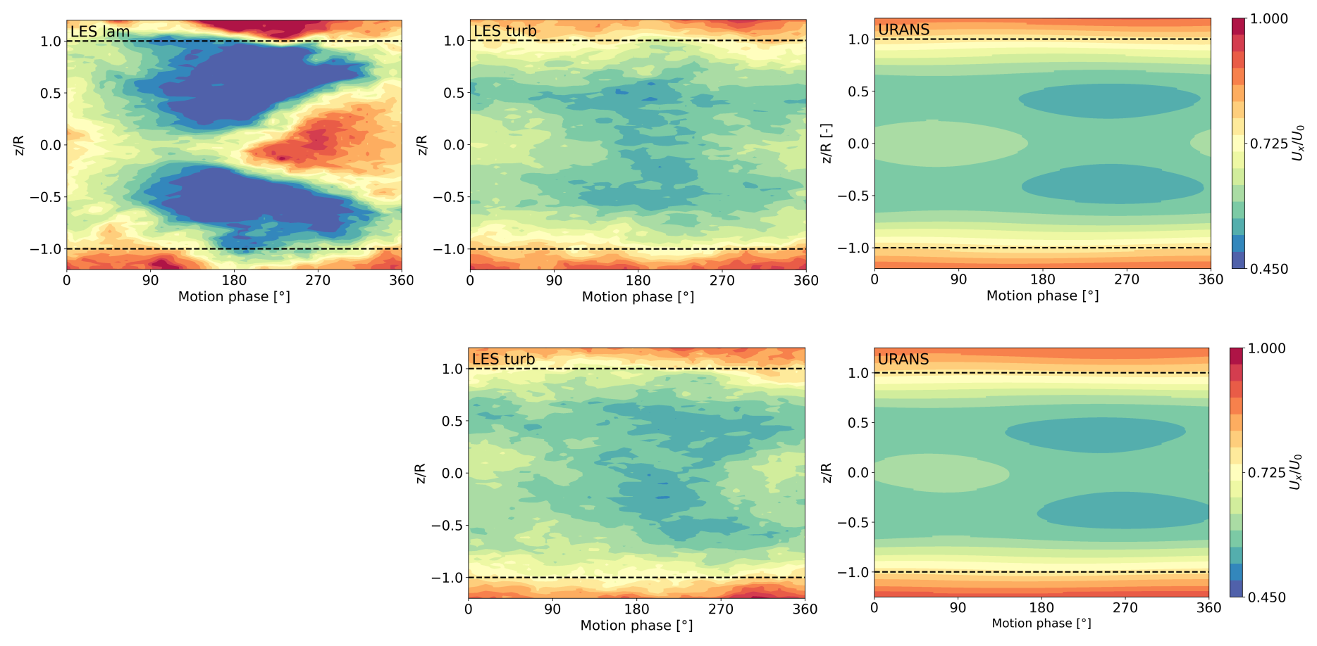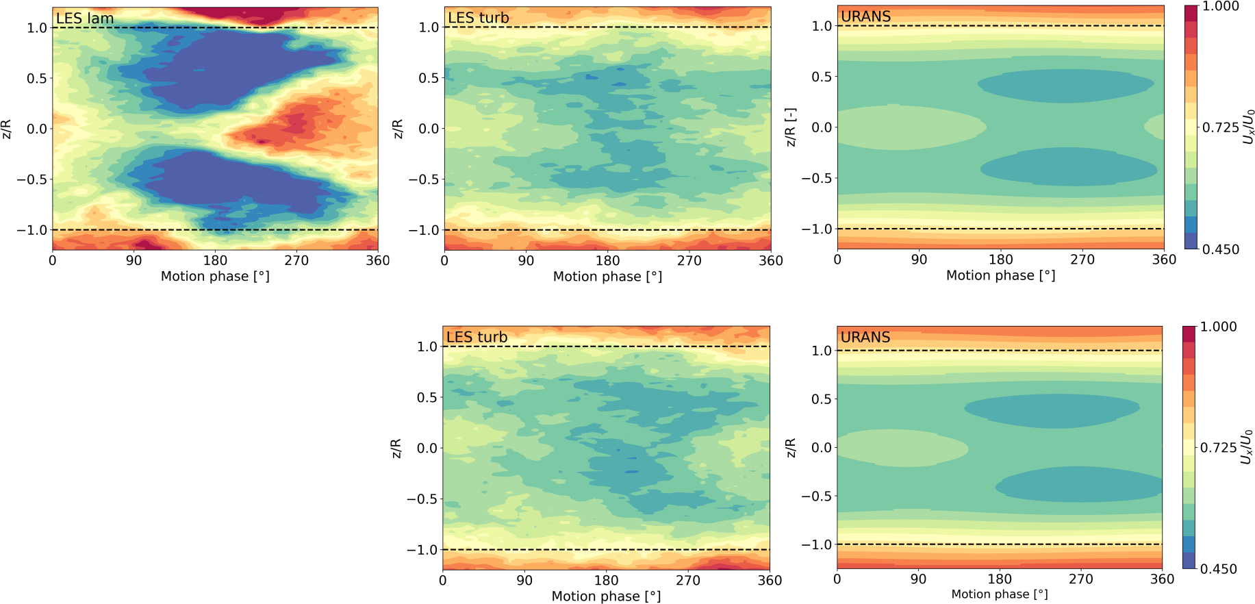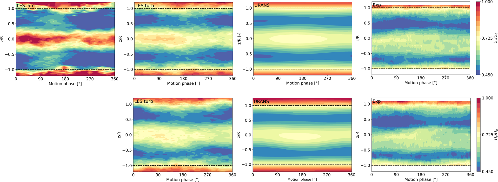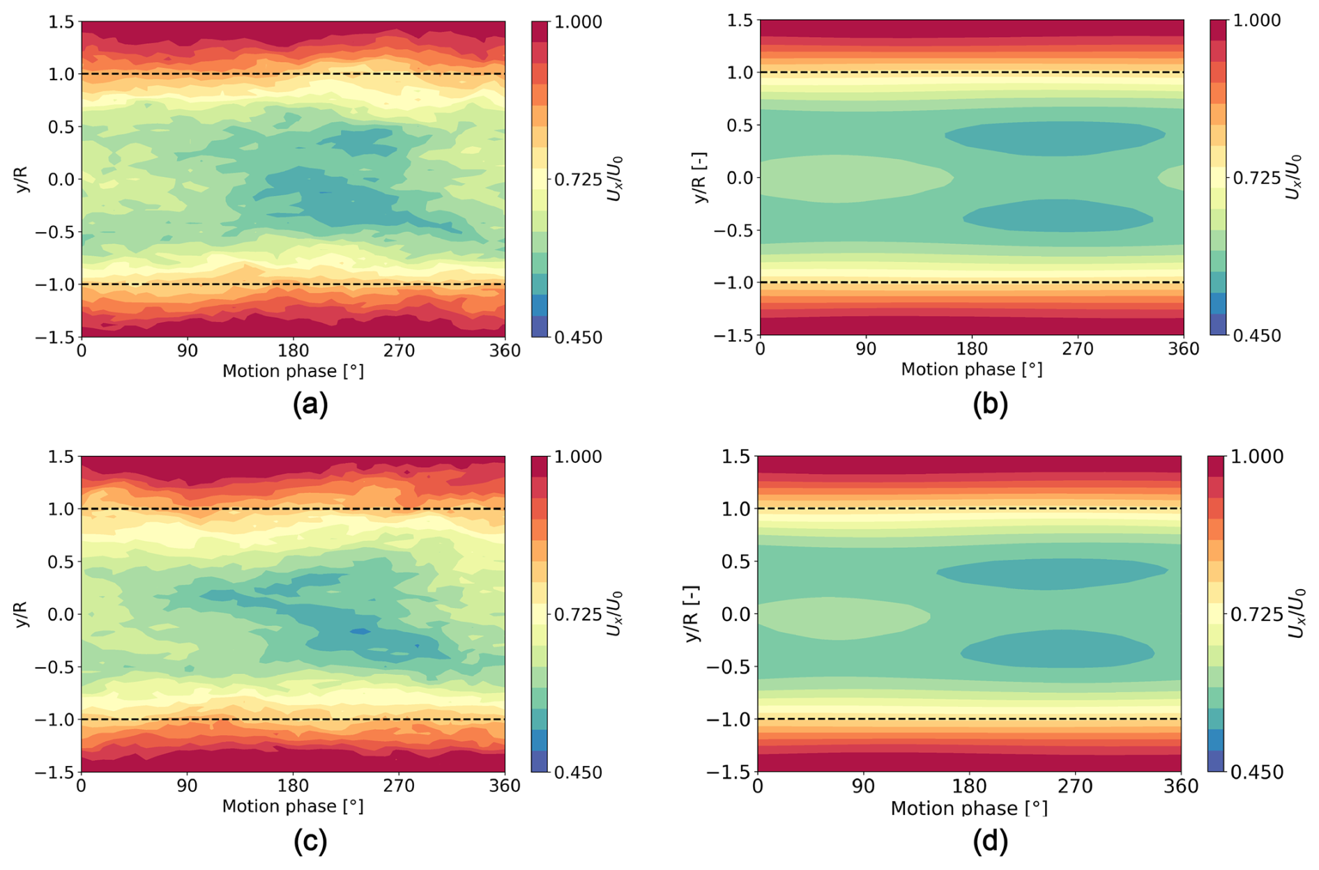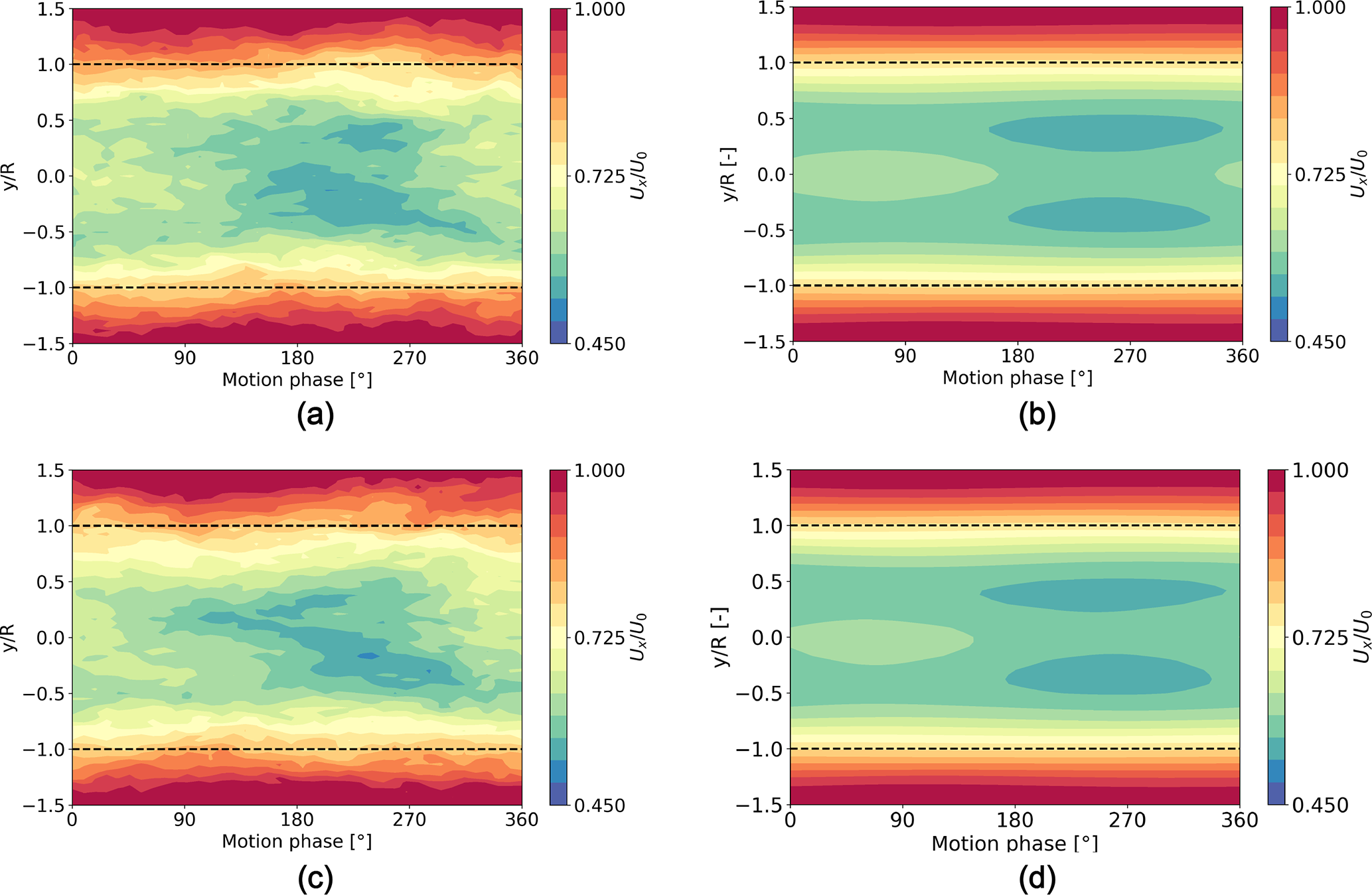 Figure 12Phase-averaged streamwise velocity contours along a horizontal line at . (a) Surge case – LES turbulent. (b) Surge case – URANS. (c) Pitch case – LES turbulent. (d) Pitch case – URANS.