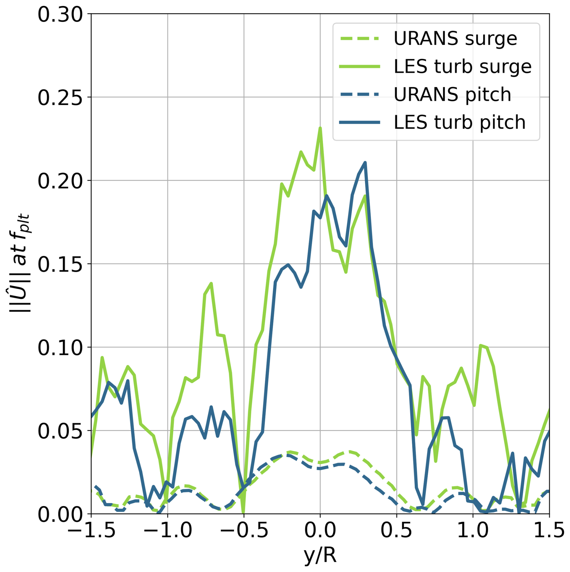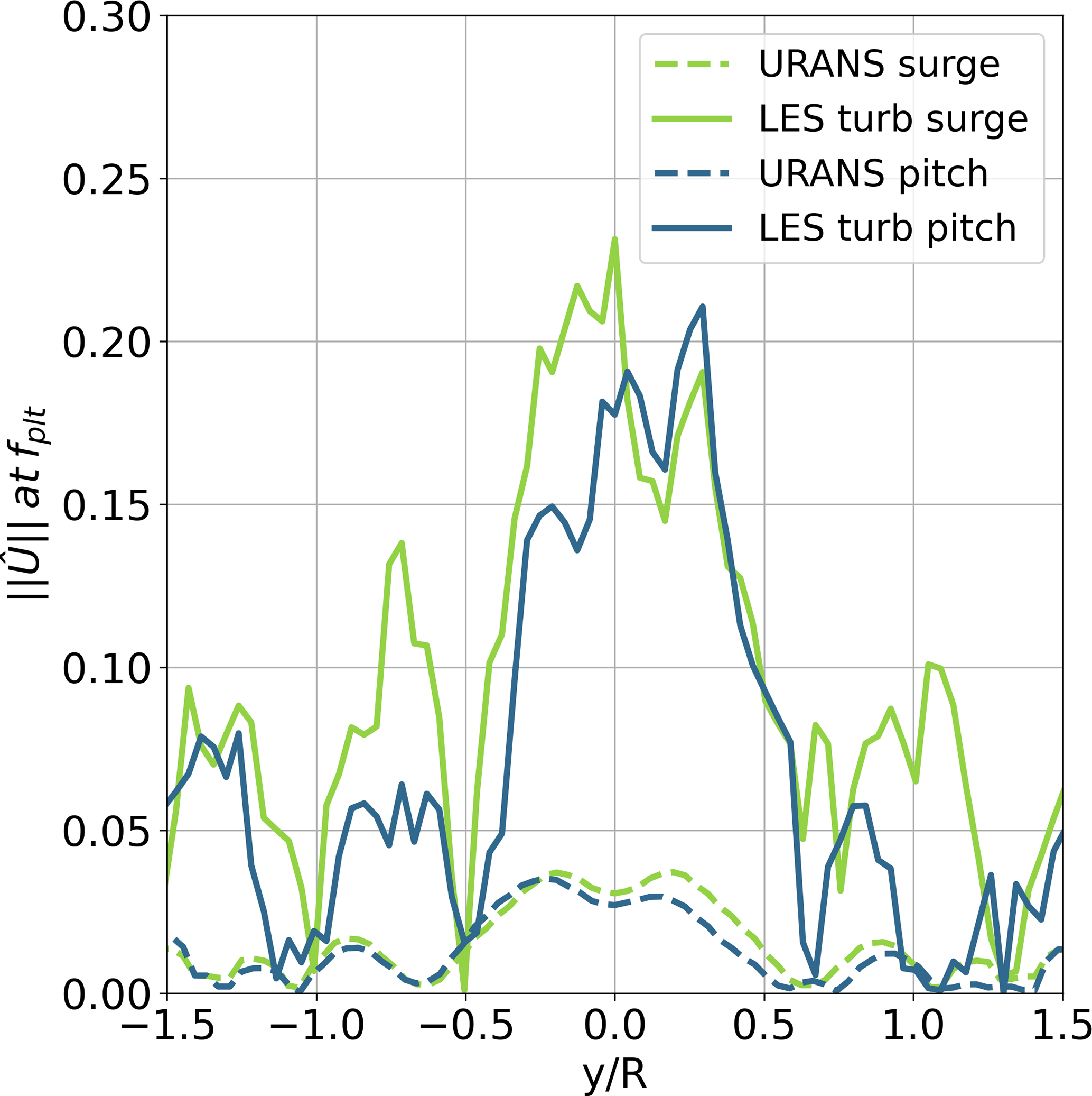 For both pitch and surge motions, the highest oscillation amplitude is clearly concentrated in the central wake region, where oscillatory structures tend to persist longer compared to the outer shear layer. Turbulent LES calculations show a uniformly oscillating central region roughly between and , while URANS simulations exhibit symmetry between the two sides at and . To quantify the amplitude of these oscillations, Fig. 13 presents, for all four simulations, the amplitude of the harmonic component at the platform motion frequency for each point along the horizontal line computed using Fourier transform. As anticipated qualitatively in the Fig. 12, both LESs and URANS simulations confirm that the maximum oscillation amplitude occurs in the region between and . Therefore, it is expected that the blade loads on the downstream turbine will be influenced by the platform motion primarily close to the hub region.