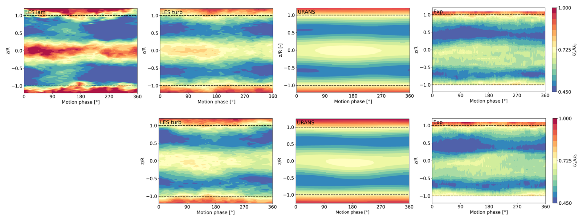 To conclude the analysis of wake oscillation propagation, the vertical plane aligned with the turbine hub is also examined to highlight any differences between the symmetric surge motion and the pitch motion, which introduces a vertical velocity gradient in the wake. Figure 14 shows once again the phase-averaged streamwise velocity, along a vertical line at . A comparison is made between all available numerical simulations, with the addition of experimental data. The figure refers to the surge case in the top row and the pitch case in the bottom row. In the surge case, the LES with laminar inflow visibly overestimates the oscillation amplitude, while the URANS simulation underestimates it. The numerical simulations generally display a symmetric behaviour between the upper and lower parts of the rotor, whereas the experimental data reveal a slight asymmetry. This asymmetry in the experiment is likely due to physical effects not included in the numerical simulations, such as the presence of the nacelle and tower. For the pitch case, no significant differences are observed compared to the surge case, either among the numerical simulations or in the experimental data. The pitch platform motion does not have a noticeable impact on the wake, at least at a downstream distance of 3 D. As in the surge case, the numerical simulations do not capture the asymmetry observed in the experiment. This experimental asymmetry is not attributed to a direct effect of the pitch motion, as it also appears in the surge configuration, suggesting it may arise from other experimental factors.