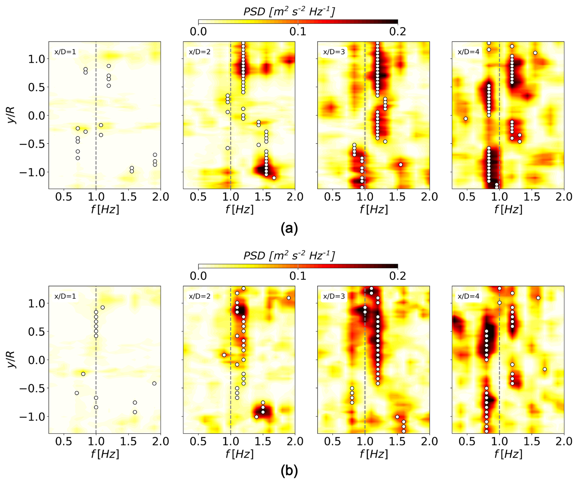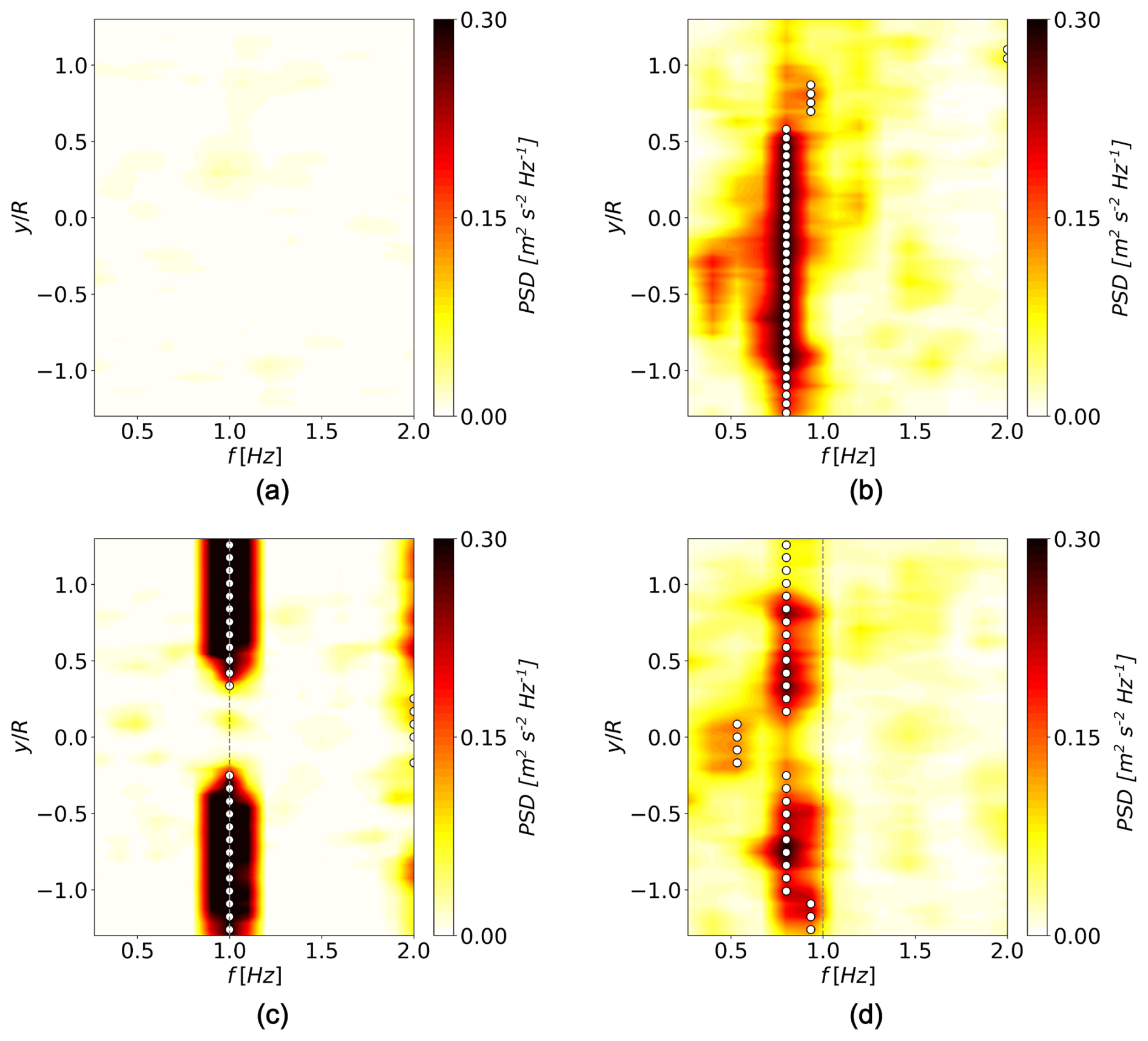 To further quantify the phenomenon and assess the influence of both surge motion and turbulent inflow, a spectral analysis is carried out to identify the characteristic frequency of the flow pattern caused by meandering. Figure 17 shows the power spectral density (PSD) of the transverse velocity for points along a horizontal line located 5 D downstream of the rotor, for both laminar and turbulent simulations in the fixed-bottom and surge cases. The objective is to analyse the low-frequency spectrum to identify any dominant frequency contributions, starting from a sufficiently downstream position to consider the meandering phenomenon as predominant. In the laminar fixed-bottom case (Fig. 17a), no clear dominant frequency component is observed within the frequency range considered. In contrast, the turbulent fixed-bottom case (Fig. 17b) exhibits a dominant frequency in the range of 0.7–0.9 Hz at all points along the line, which is deemed to correspond to the characteristic wake pattern previously identified in Fig. 16b. In the laminar surge case (Fig. 17c), a dominant frequency again appears at all points along the line; however, the frequency matches the one of the platform motion itself (1 Hz). This indicates that in laminar conditions, the wake dynamics are primarily governed by the platform motion, and no low-frequency component is identified. This confirms that the Uy pattern observed in the laminar surge case has a different nature, being driven solely by the imposed platform motion. Interestingly, in the turbulent surge case, the dominant frequency observed at all points is no longer the one of the platform motion. Instead, a lower-frequency component emerges in the 0.7–0.9 Hz range, consistent with the turbulent fixed-bottom case. This indicates that the dominant wake dynamics in both turbulent scenarios arise from the same physical mechanism and are characterized by the same frequency. Therefore, under the operating conditions analysed, platform motion does not appear to play a significant role in enhancing wake meandering. Instead, the phenomenon is primarily driven by the turbulent inflow, which, despite its low turbulence intensity (TI=1.5 %), increases wake instability and promotes the onset of wake meandering. The range of dominant frequencies identified in the turbulent cases corresponds to Strouhal numbers between 0.42 and 0.53. These values are consistent with the typical range of [0.1–0.5] reported by Messmer et al. (2024a) as characteristic of wake meandering induced by wake instabilities, particularly under low-turbulence-intensity conditions (TI<5 %), and comparable values are also reported by Li et al. (2022).