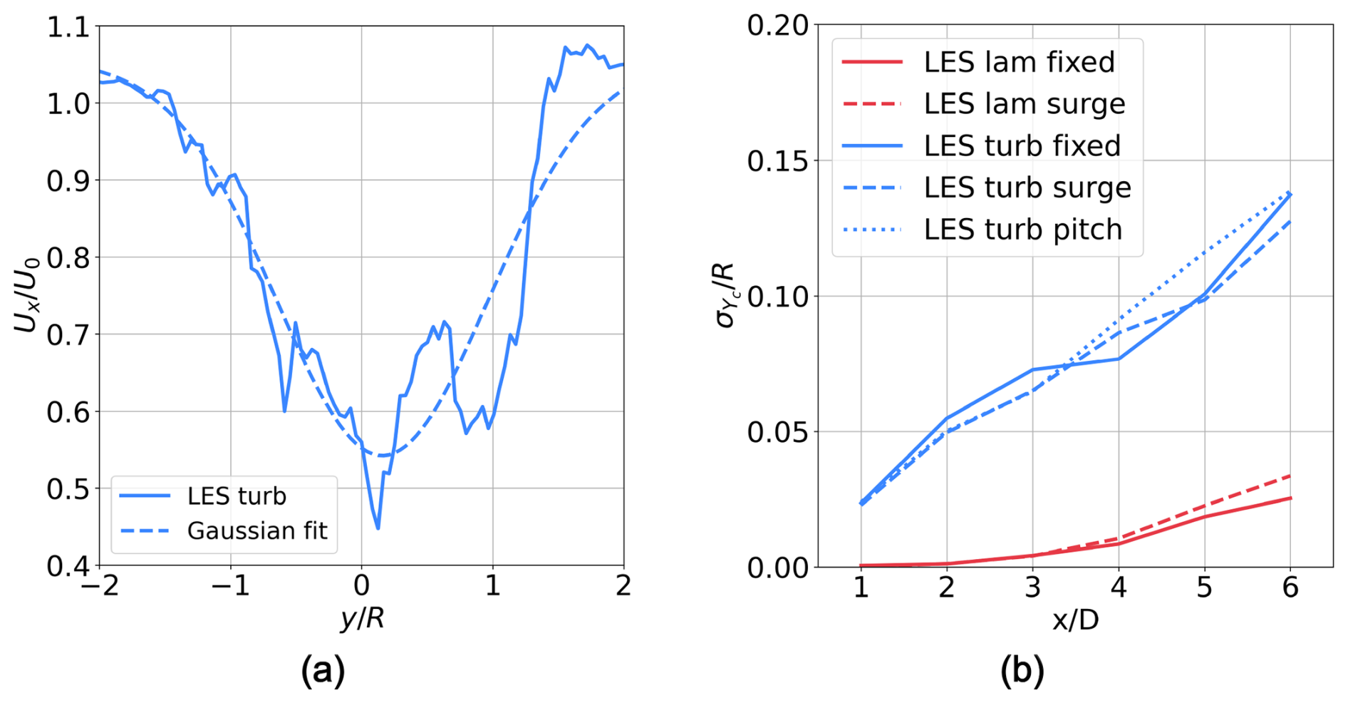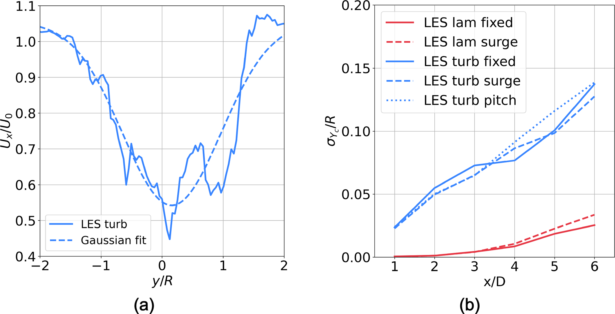 Figure 19(a) Instantaneous axial velocity profile and corresponding Gaussian fit at for the turbulent surge case. (b) Standard deviation of the wake centre position in LES calculations.