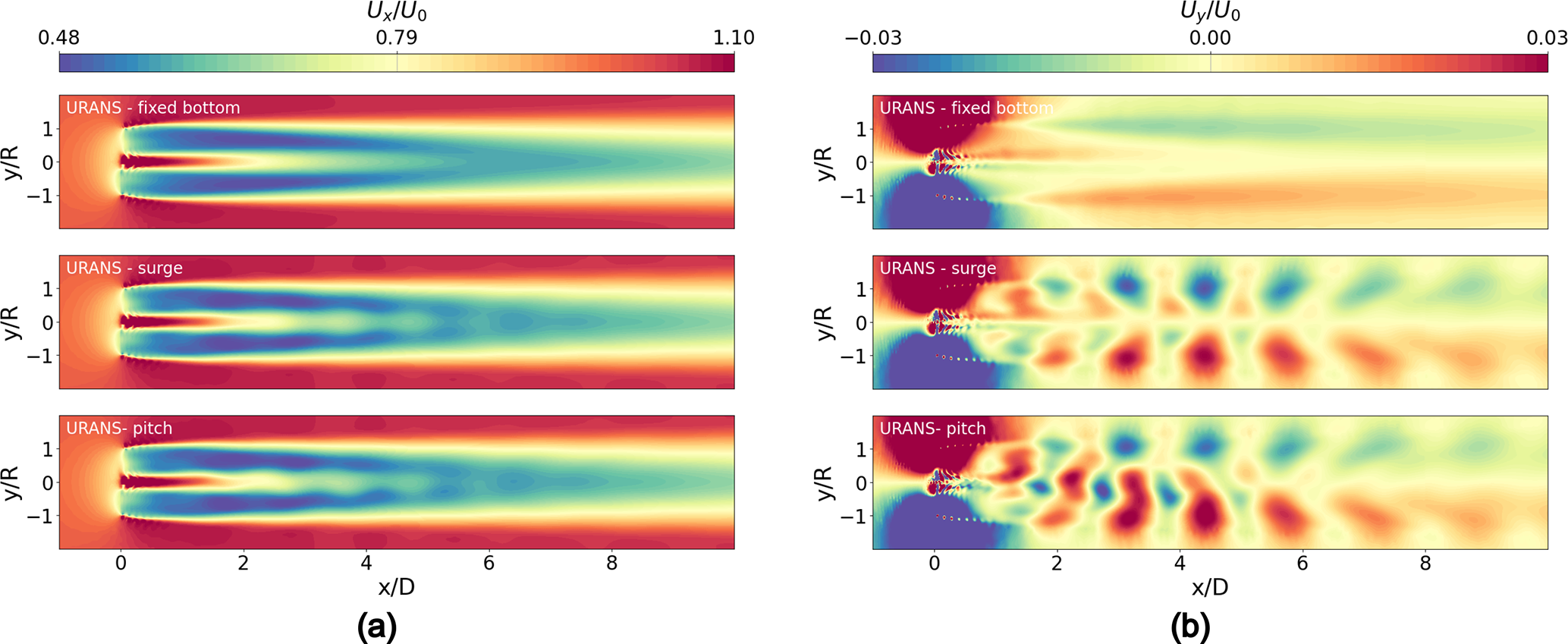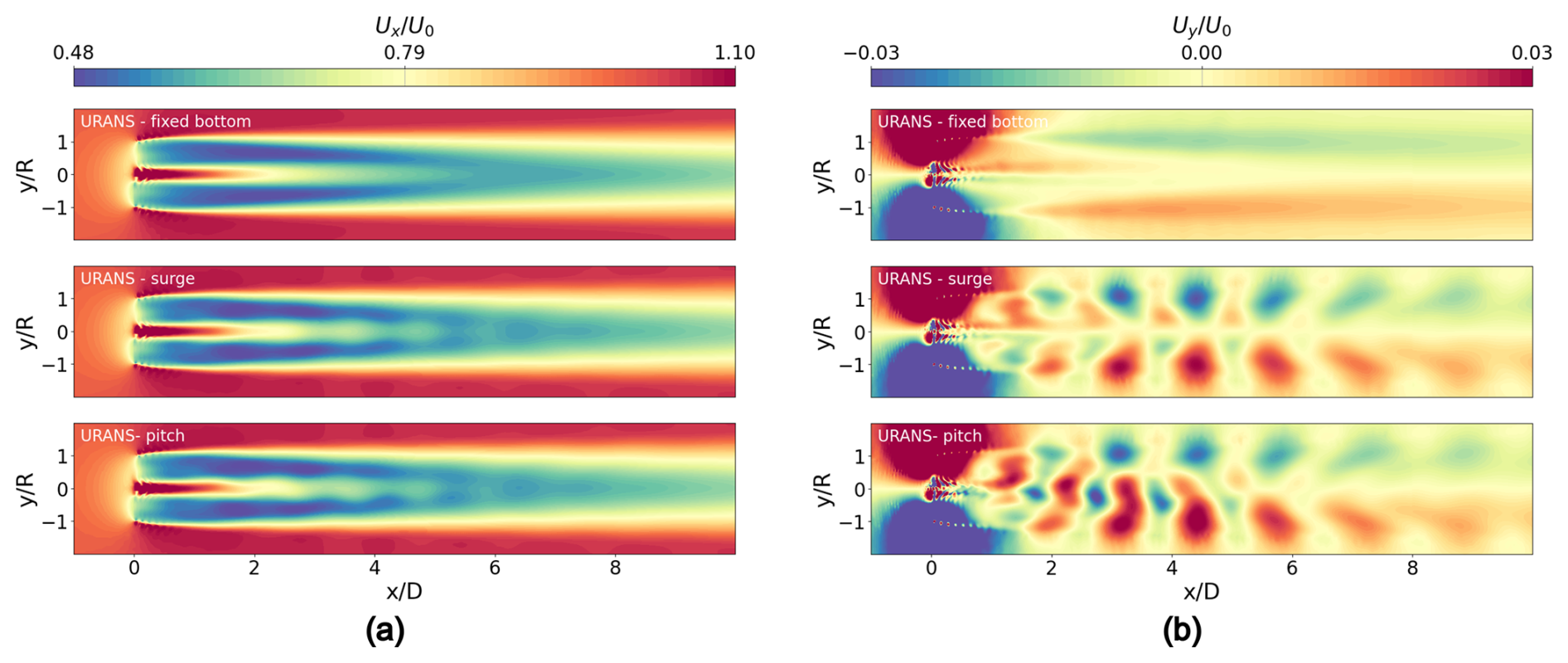 With the origin of wake meandering established through turbulent LES calculations, the question arises whether URANS models are capable of capturing this phenomenon, which is inherently linked to turbulent flow instabilities. Figure 20 presents the axial and transverse velocity fields from the URANS simulations for the fixed-bottom, surge, and pitch cases on a horizontal plane.
