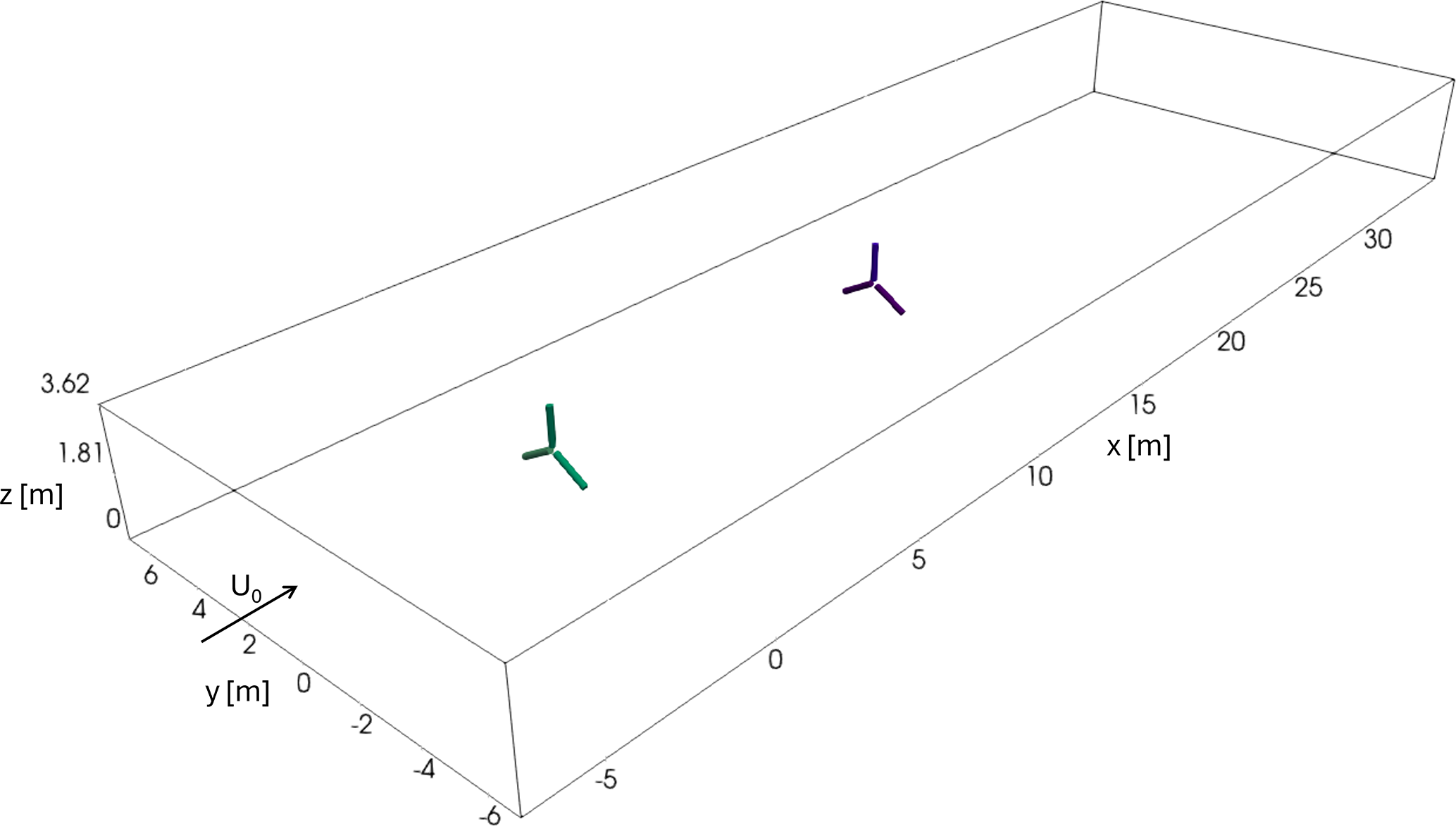 In this section, the objective is to analyse the impact of the previously characterized wake on the loads experienced by a downstream wind turbine. To this end, a second turbine is introduced into the numerical domain, positioned 5 D downstream from the upstream turbine and aligned with it. The layout of the turbines within the computational domain is illustrated in Fig. 21. From this point onward, the term WT refers to wind turbine.