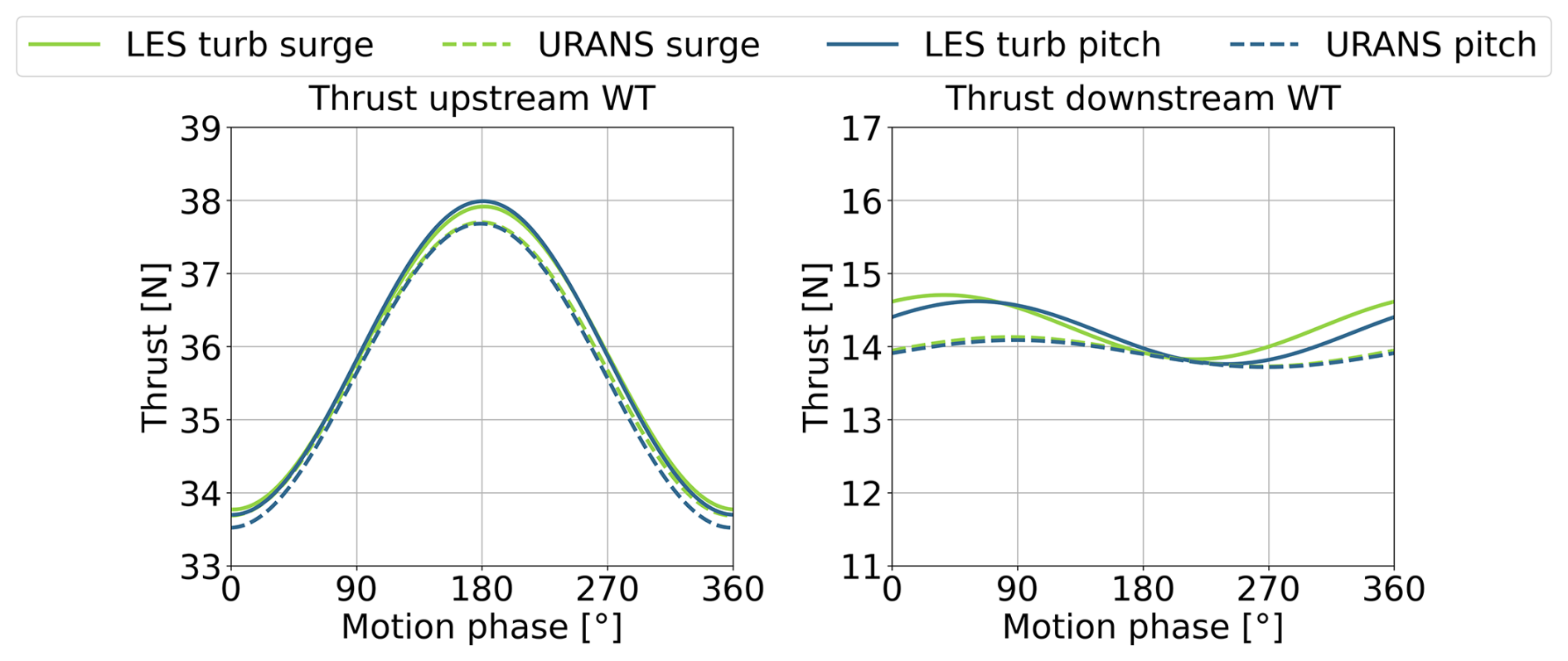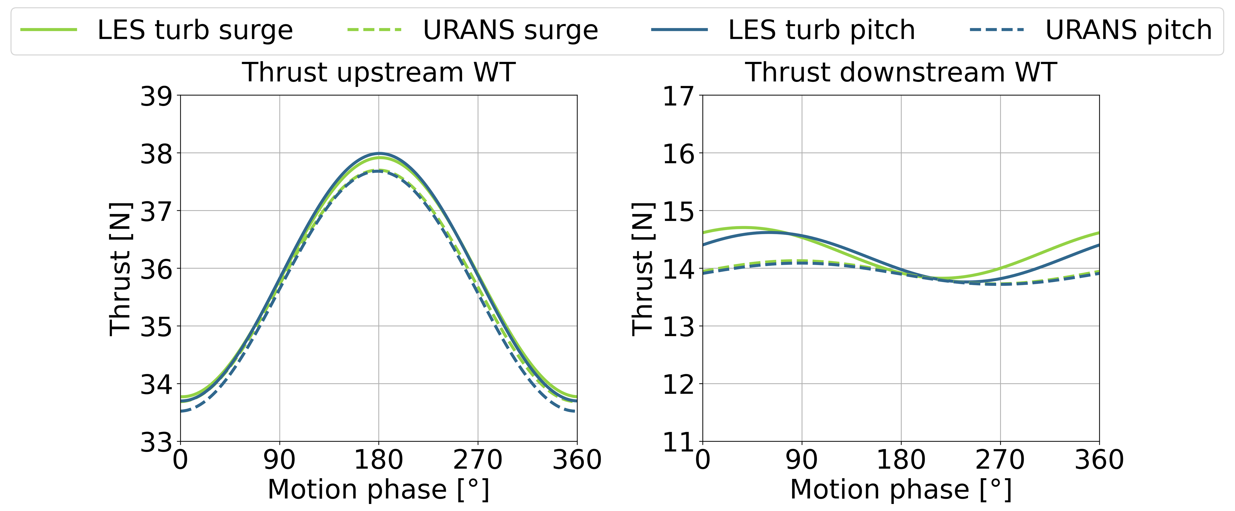 Figure 23 shows the thrust force filtered at the platform motion frequency over one motion period, for both the upstream and the downstream turbines. Specifically, it presents a comparison between the pitch and surge cases, as well as between turbulent LES and URANS simulations. For the upstream turbine, the thrust force exhibits a clear oscillatory behaviour dominated by the platform motion, consistent with the single-turbine configuration previously analysed (Fig. 4). The downstream turbine also exhibits an oscillatory thrust response, though with a markedly reduced amplitude. This behaviour aligns with the oscillations observed in the wake at a distance of 5 D. Indeed, Fig. 15 highlights a general phase shift: URANS tends to estimate the velocity trend with 90° phase shift after the LES prediction, and this phase lag is similarly reflected in the thrust signal. While URANS simulations predict nearly identical thrust responses for both surge and pitch motions, the LES results exhibit a slight phase difference between the two cases, which is also visible in Fig. 15. Consistent with the wake analysis, URANS generally underestimates the oscillation amplitude compared to LES.